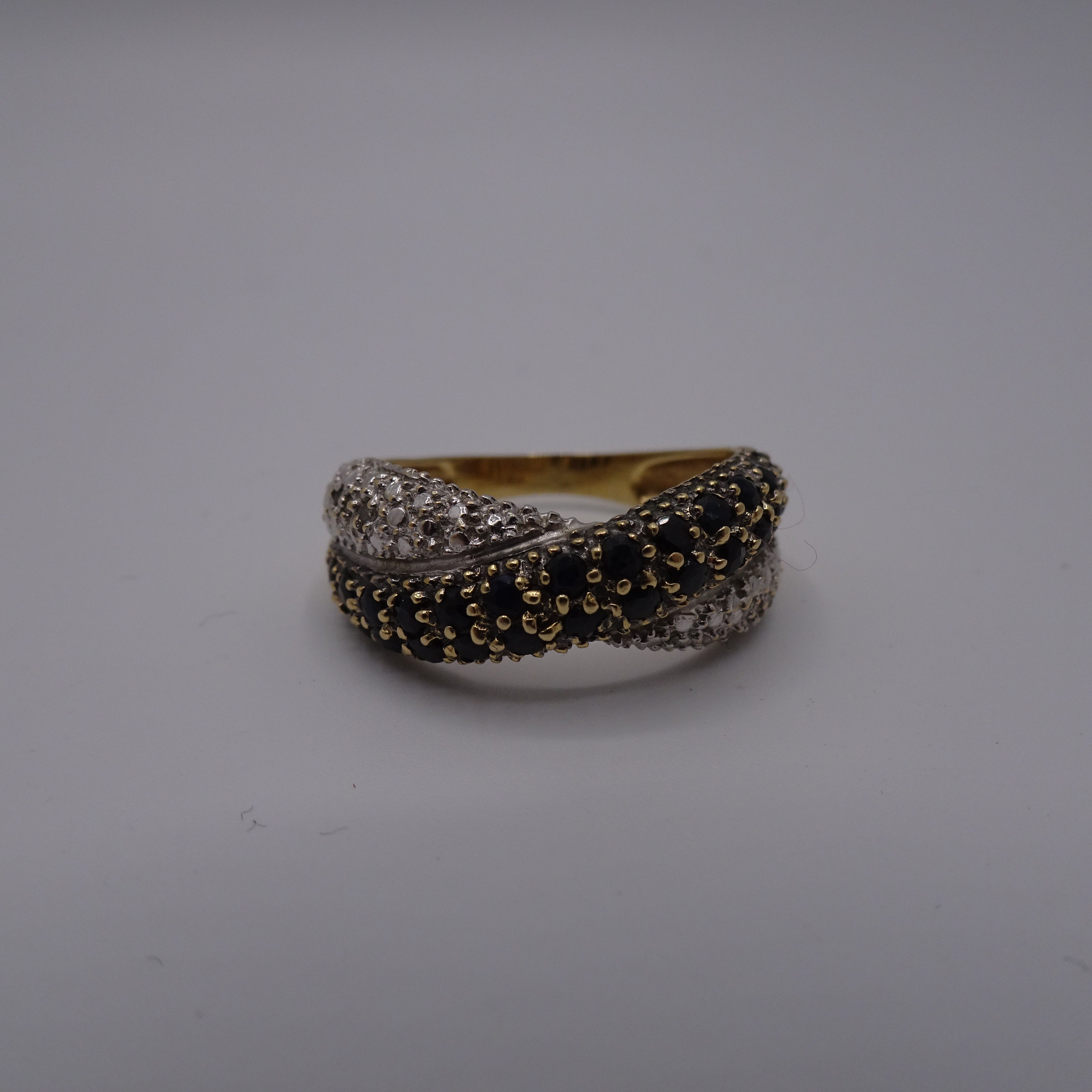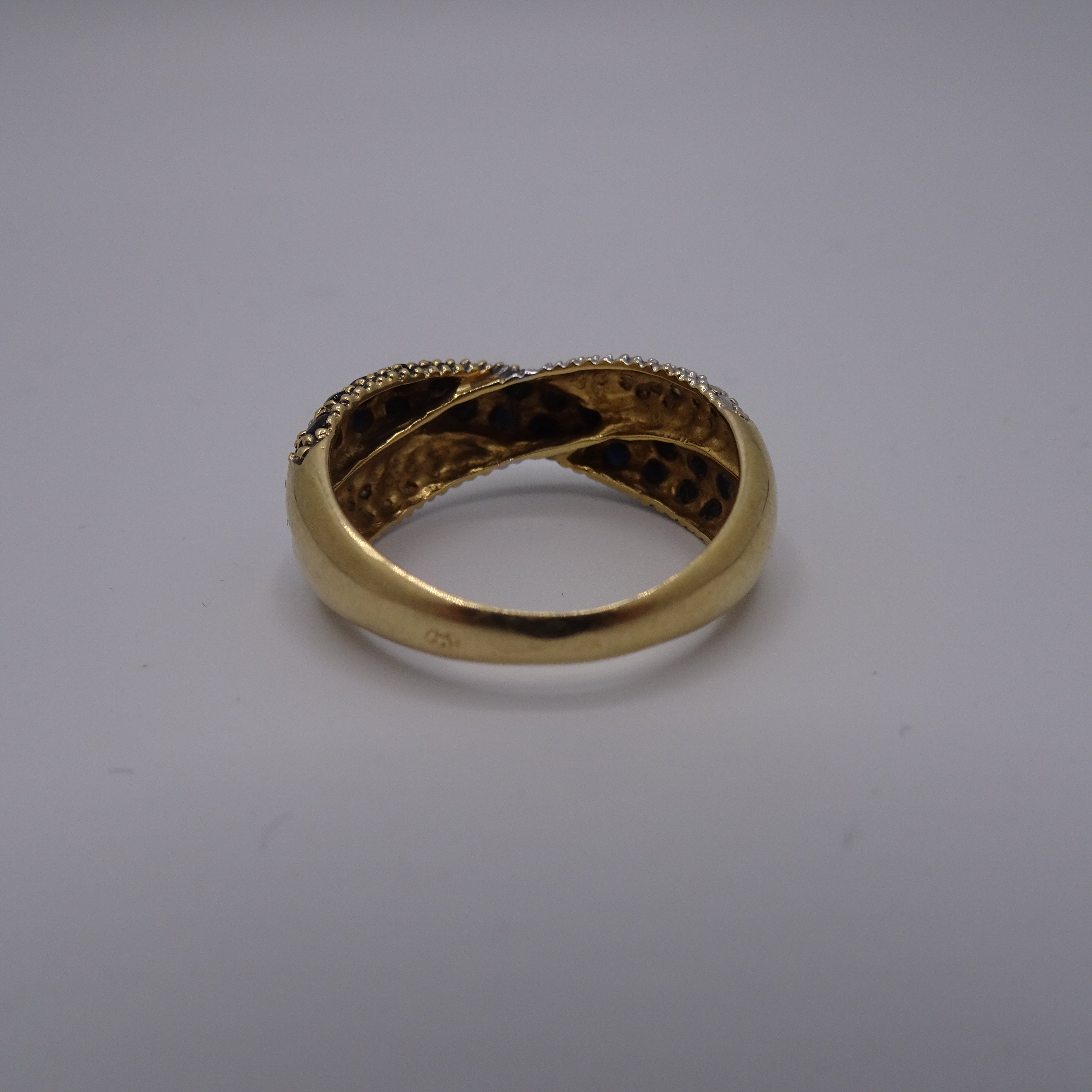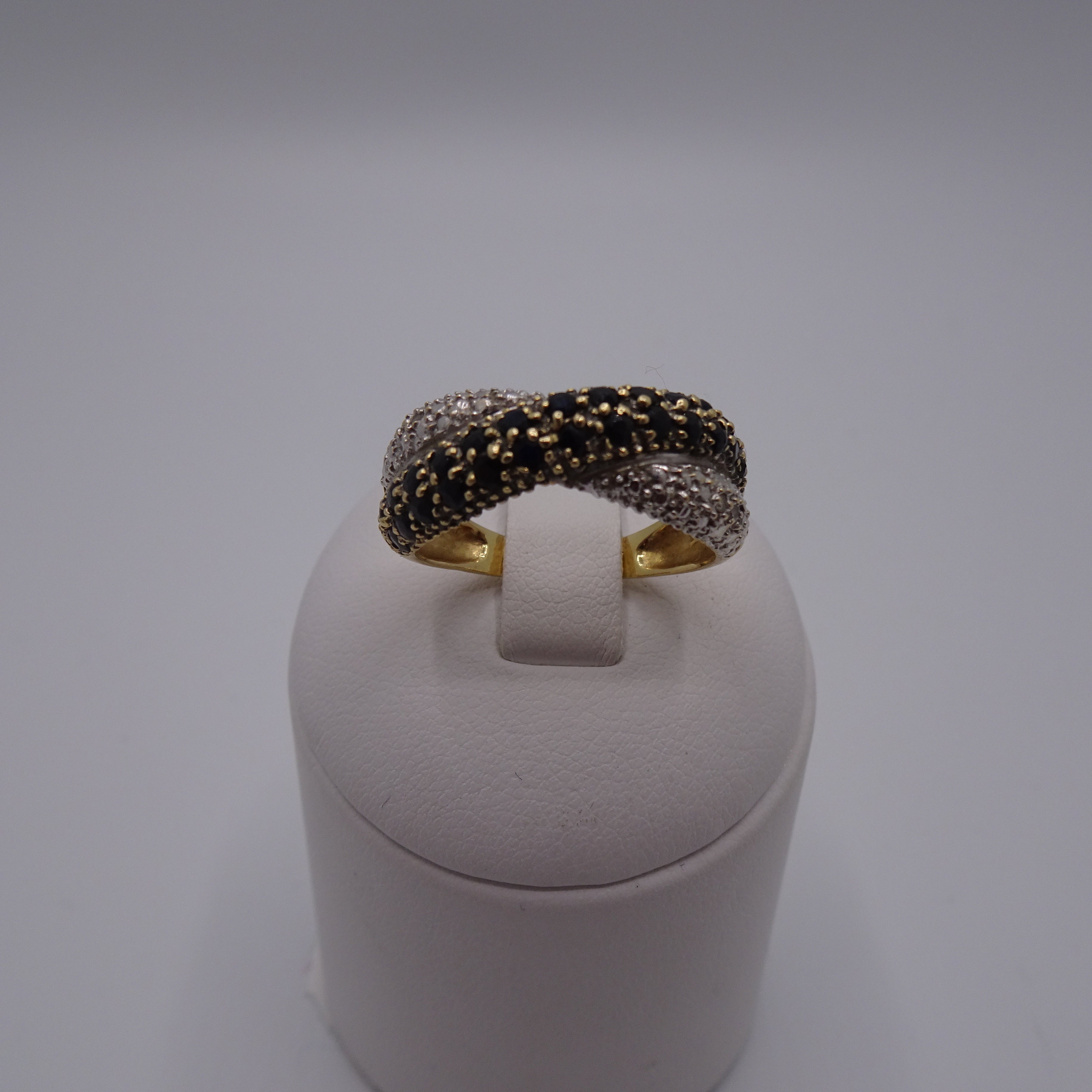 Ce modèle empierré en or jaune 750/1000, poinçonné tête d’aigle, pèse 4,42 g et est proposé en taille 56. Il est serti de six diamants taille brillant de 0,005 ct chacun et de 26 saphirs, et se présente en très bon état.