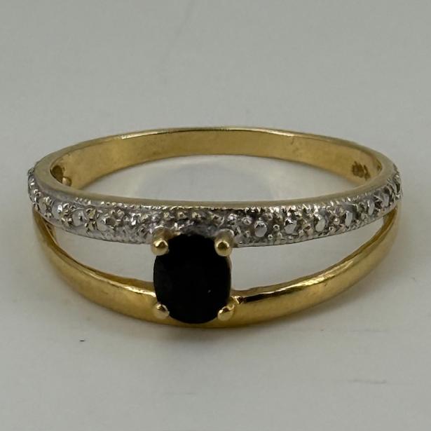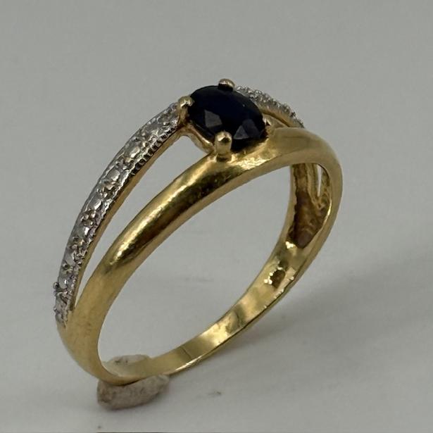 Bague empierrée est en or jaune 18 carats (750/1000), sans poinçon. Elle est ornée d’un saphir de 0,16 carat, pèse 2,41 grammes et correspond à une taille 56. L’ensemble est en très bon état.