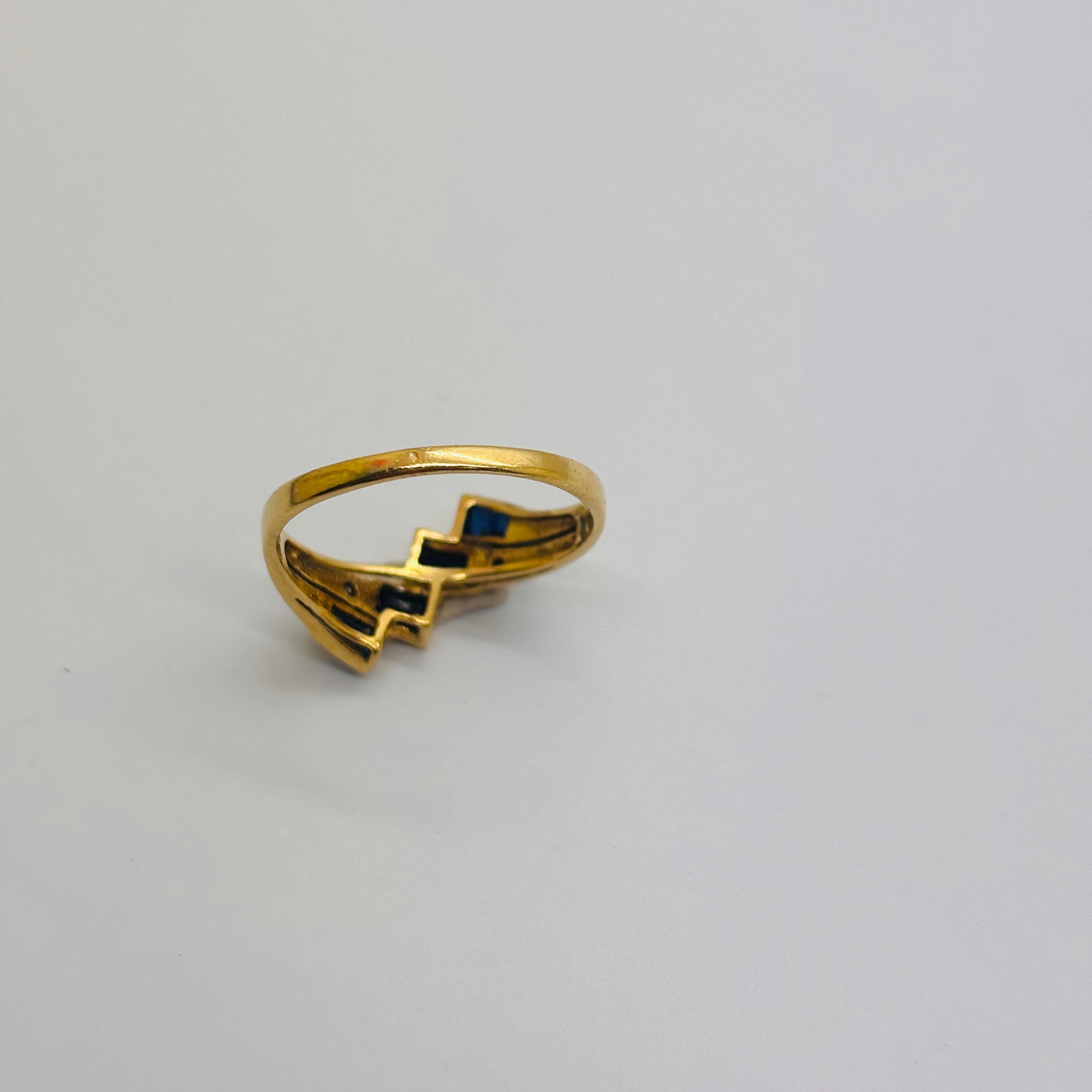 Bague empierrée en or jaune 750/1000 (18 carats), d’un poids de 2,41 g et de taille 54. Elle est ornée de 4 saphirs et de 2 éclats de diamants, offrant un joli contraste de pierres précieuses. Sans poinçon, cette pièce est en bon état.