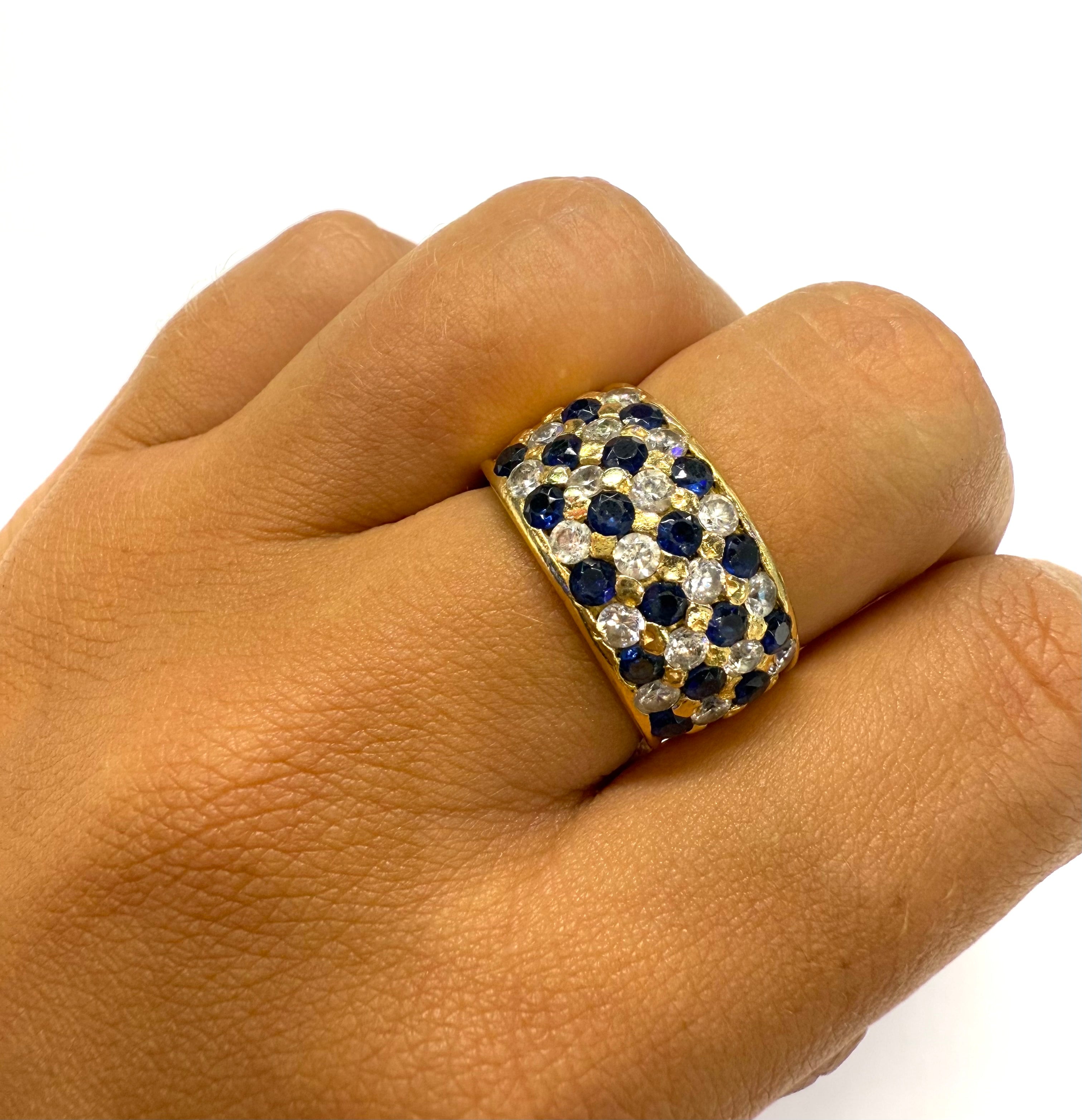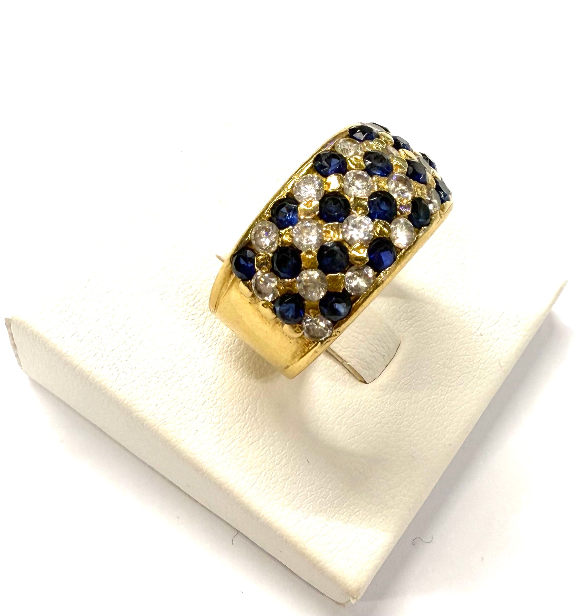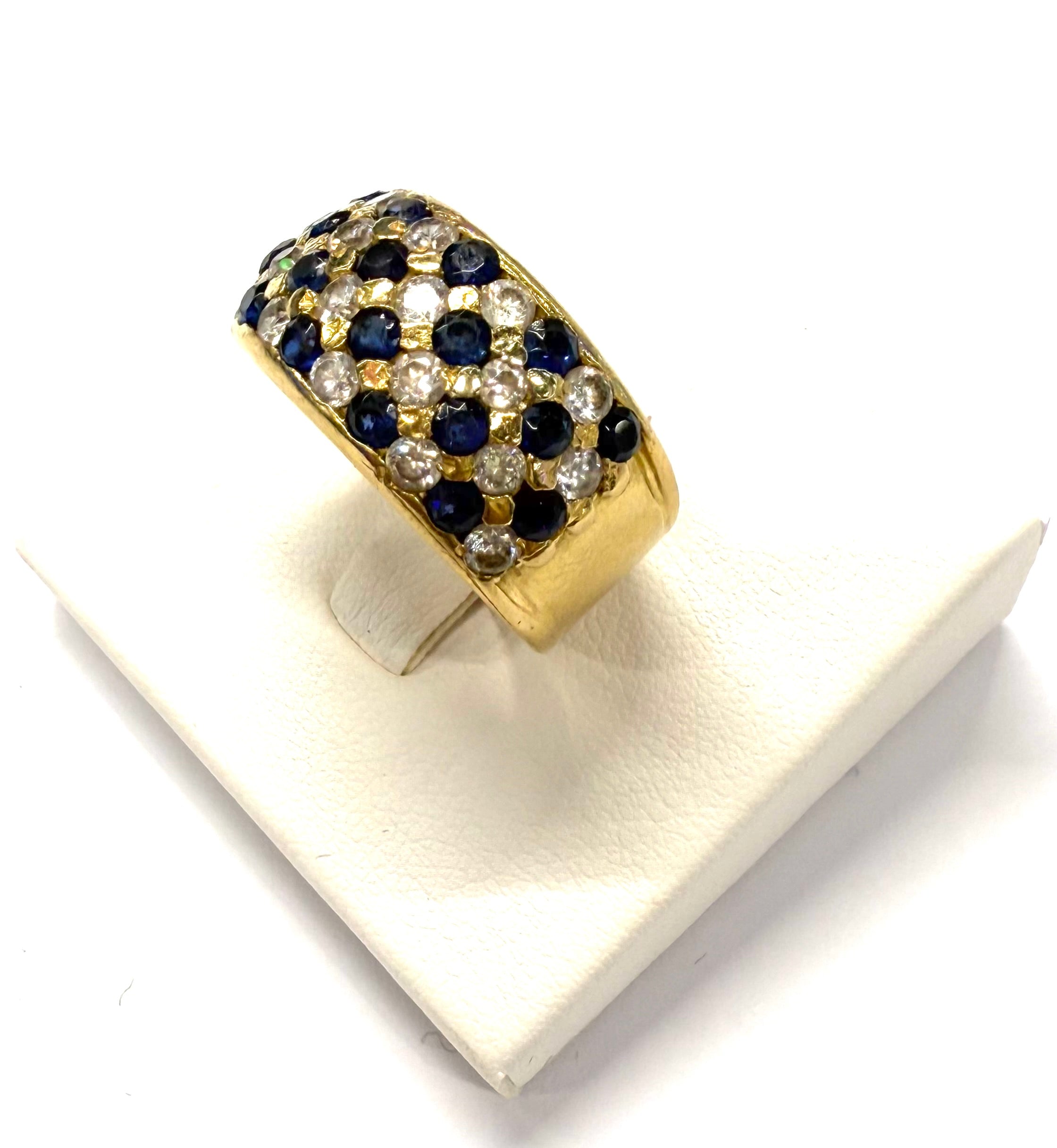 Bague empierrée en or jaune 750/1000 (18 carats), poinçonnée 750, d’un poids de 10,45 g et de taille 57. Elle est sertie de 18 saphirs et 18 oxydes de zirconium, offrant un bel équilibre entre couleur et éclat. La bague est en très bon état.