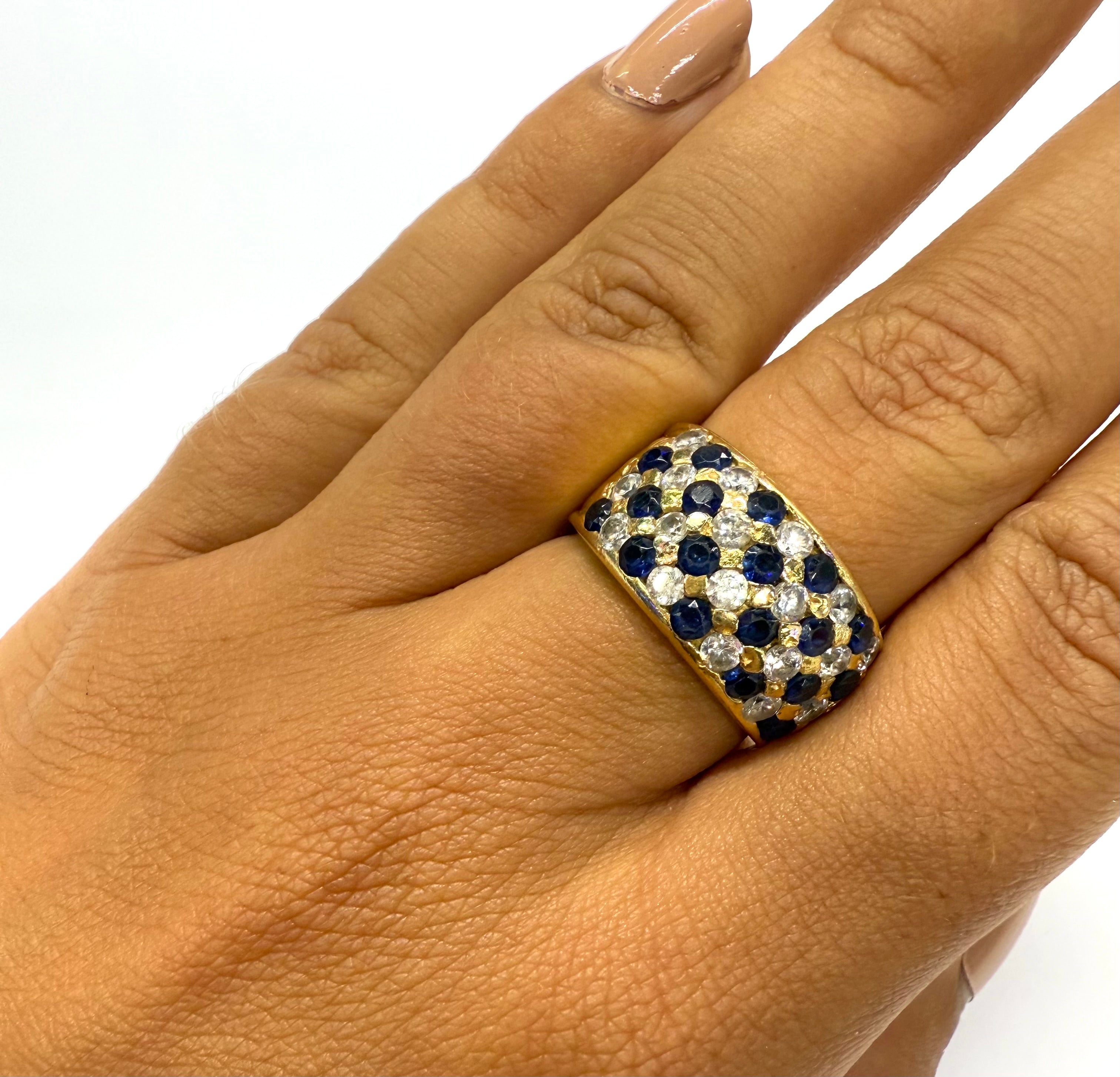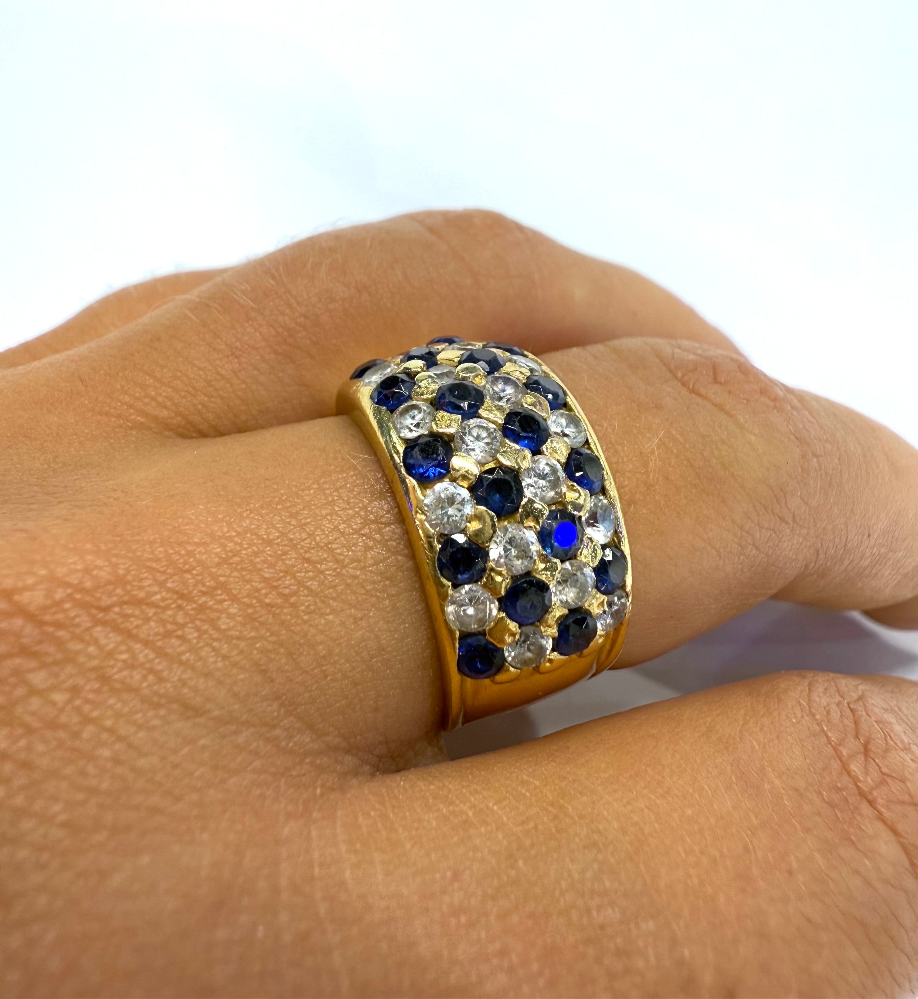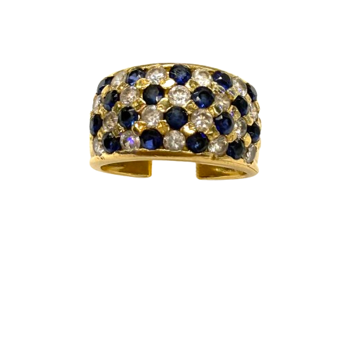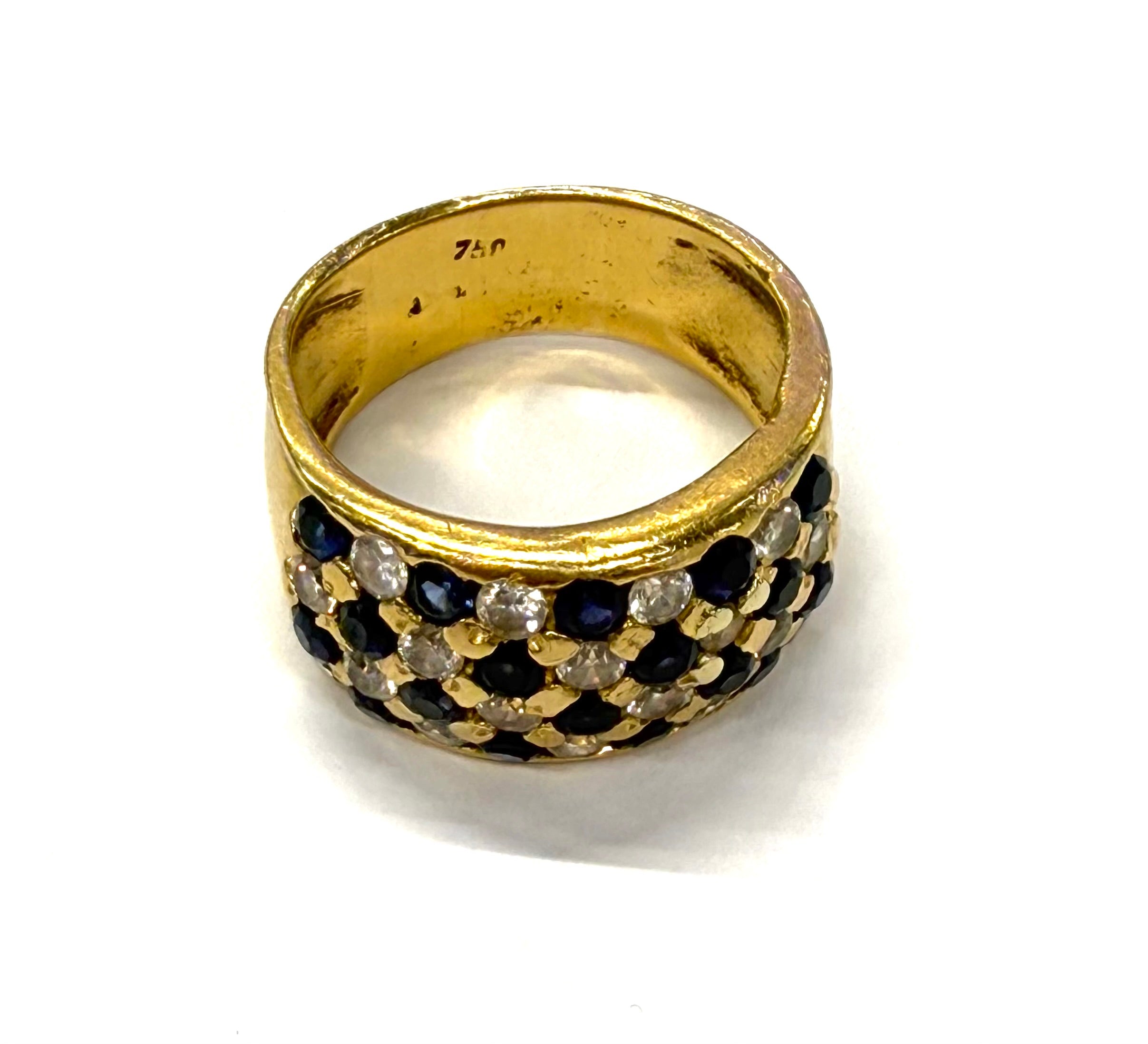 Bague empierrée en or jaune 750/1000 (18 carats), poinçonnée 750, d’un poids de 10,45 g et de taille 57. Elle est sertie de 18 saphirs et 18 oxydes de zirconium, offrant un bel équilibre entre couleur et éclat. La bague est en très bon état.