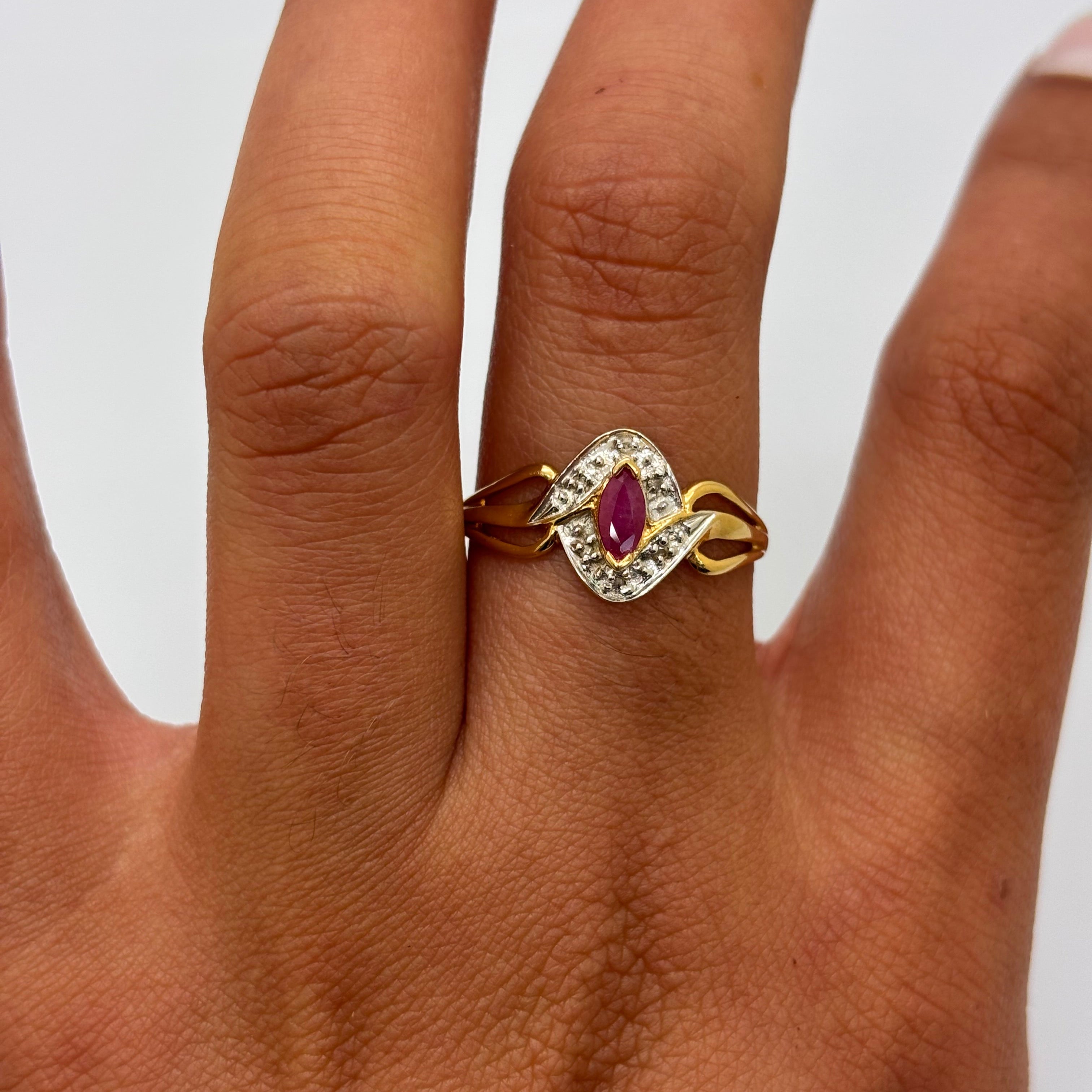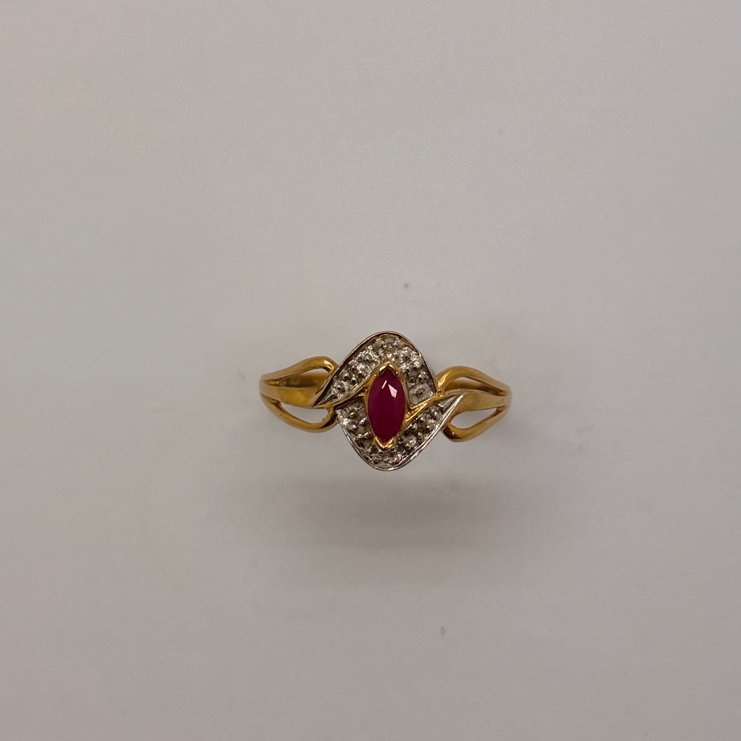 Bague empierrée en or jaune et or blanc 18 carats (750/1000) est ornée d’un rubis unique qui apporte une touche de couleur élégante à son design classique. Elle pèse 2,54 grammes et est proposée en taille 62. Le bijou porte le poinçon 750 et se trouve en bon état général.