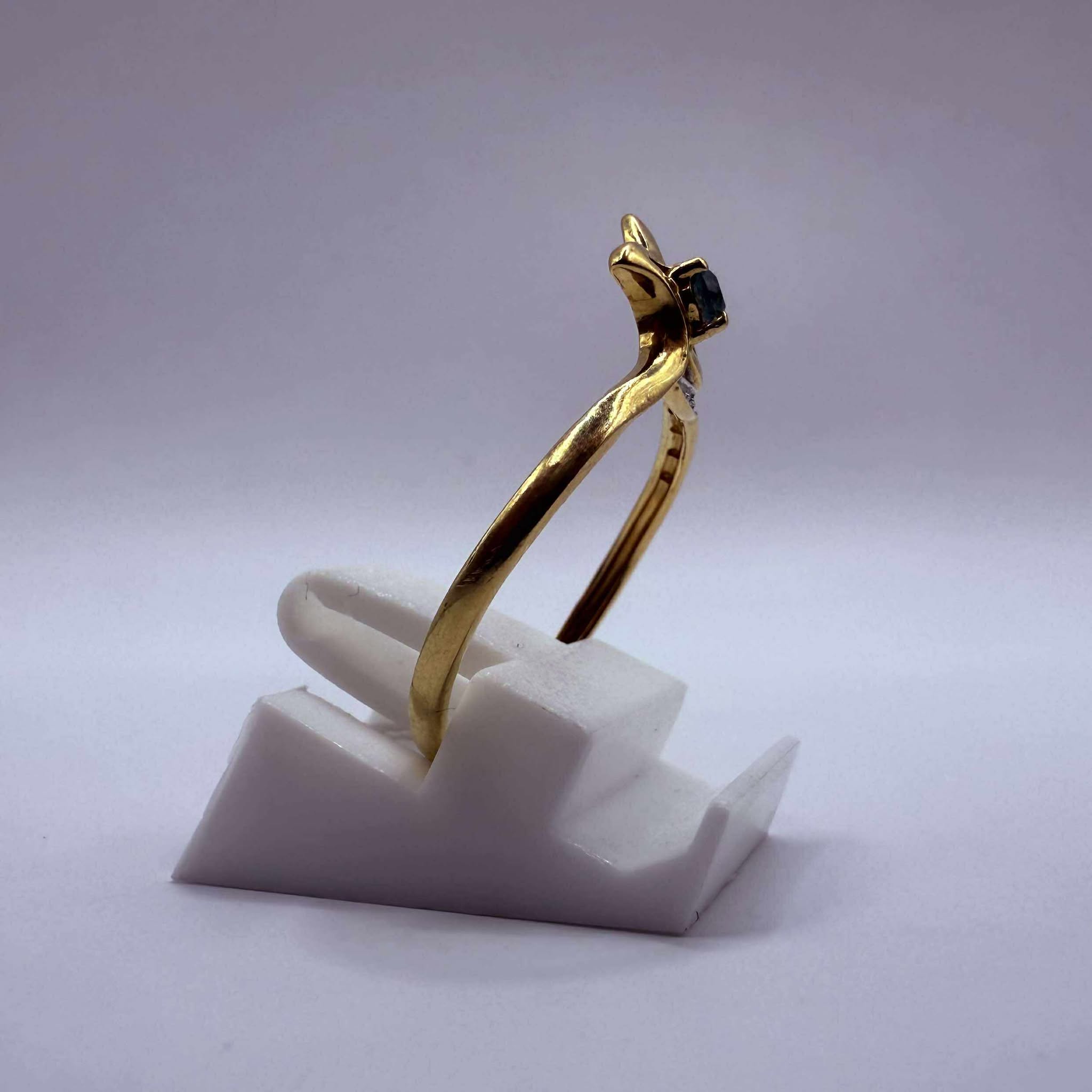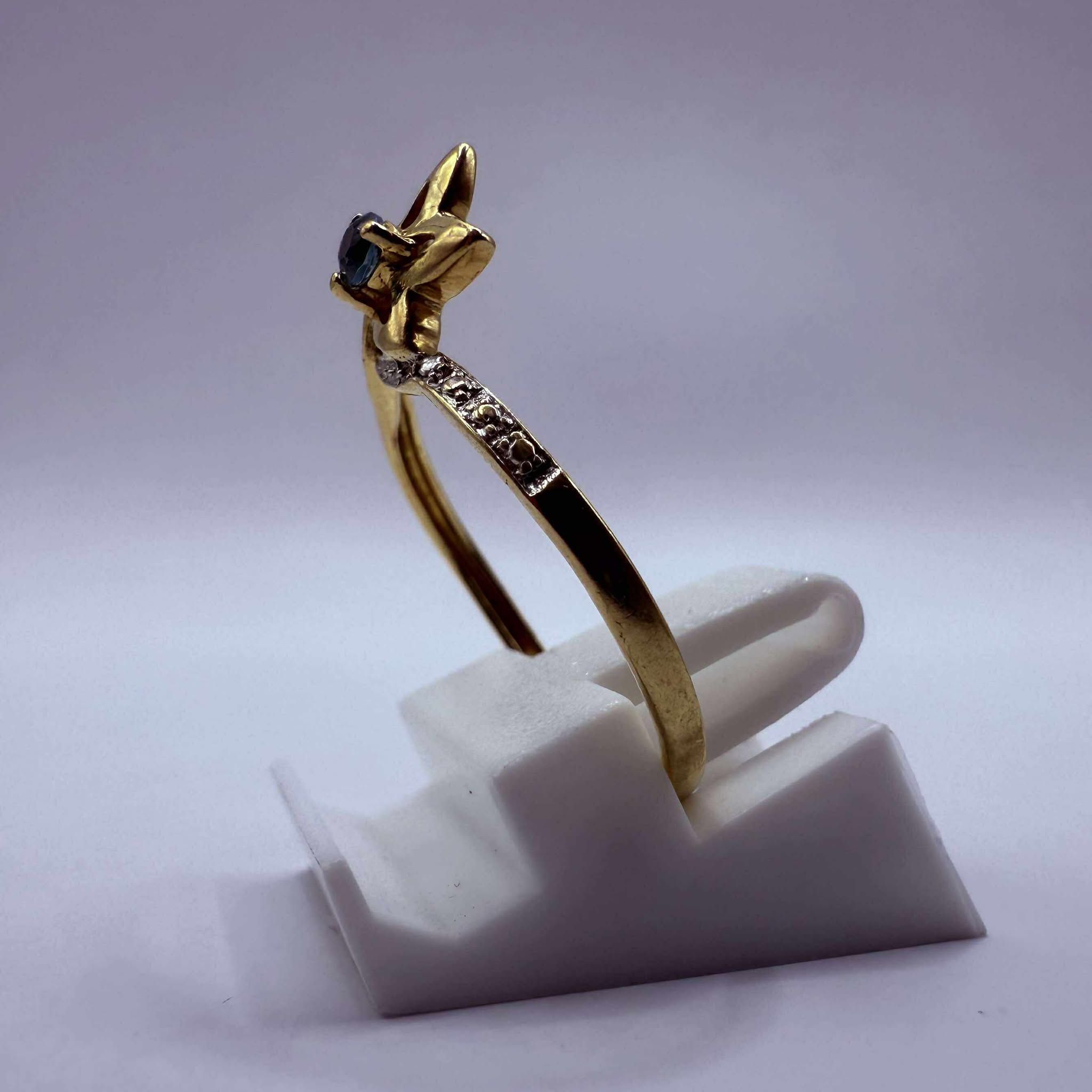 Bague de type étoile est en or jaune 18 carats (750/1000) et porte le poinçon 750. Elle est ornée d’un oxyde de zirconium, pèse 1,40 gramme et correspond à une taille 55. Elle est présentée en bon état.