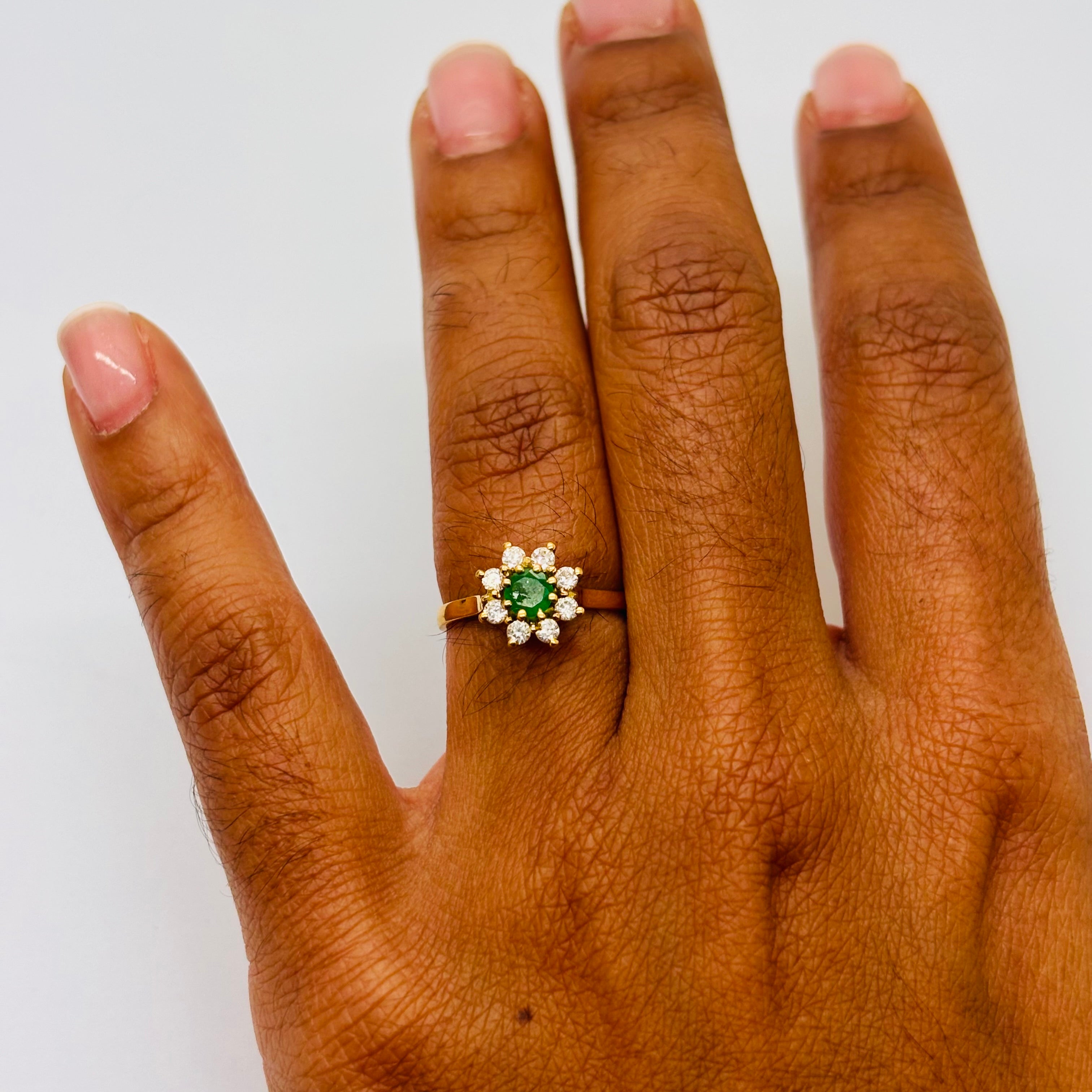 Bague marguerite en or jaune, sublimée par une émeraude centrale entourée de pierres étincelantes.