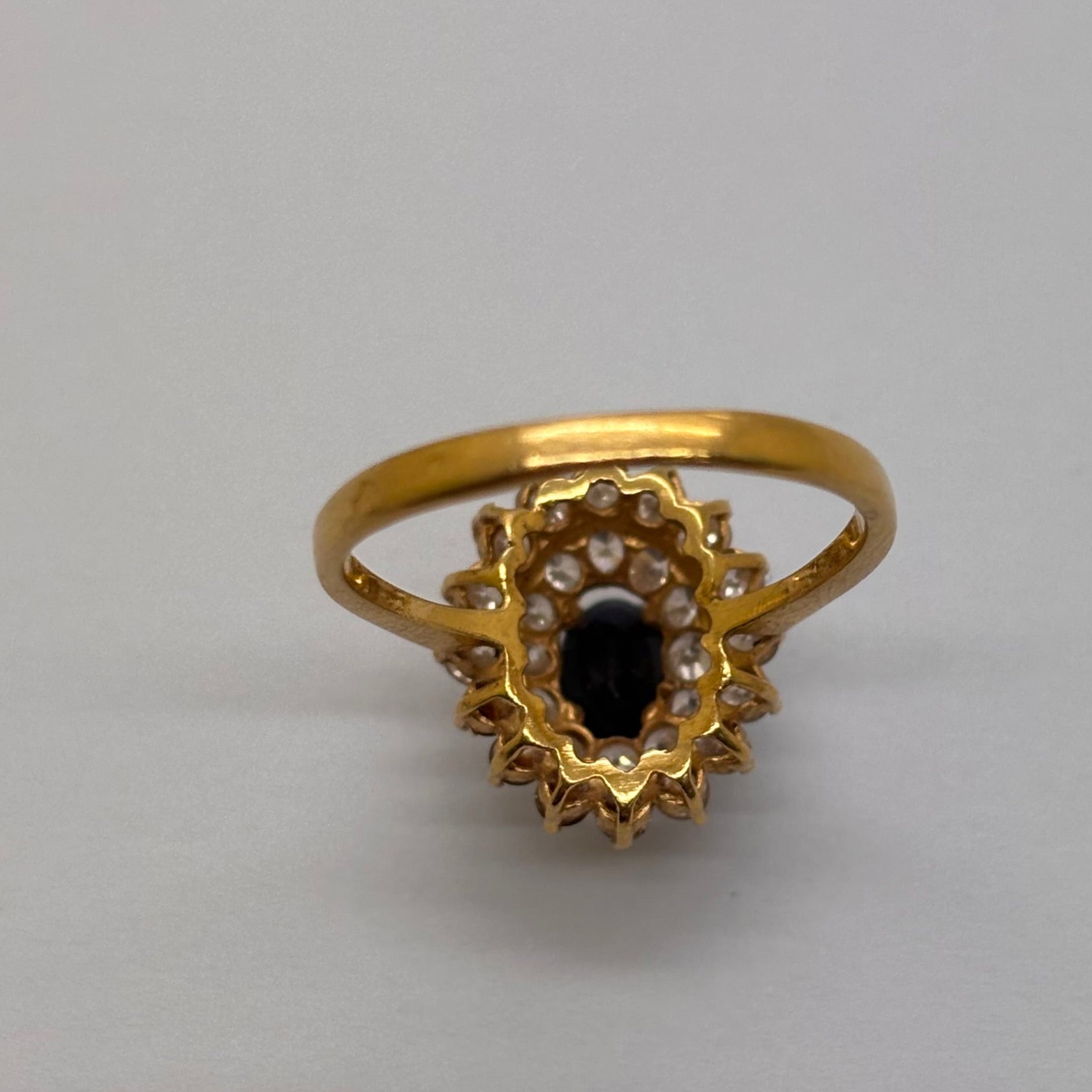 Magnifique bague marguerite en or jaune 18 carats (750/1000), sertie d’un saphir central de belle taille encadré par 28 zircons.