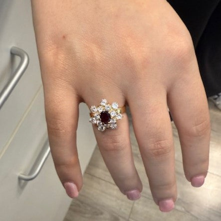 Éclatante de raffinement, cette bague marguerite en or 18 carats associe la profondeur d’un rubis central à la brillance éclatante de 14 diamants, un hommage intemporel à l’élégance.