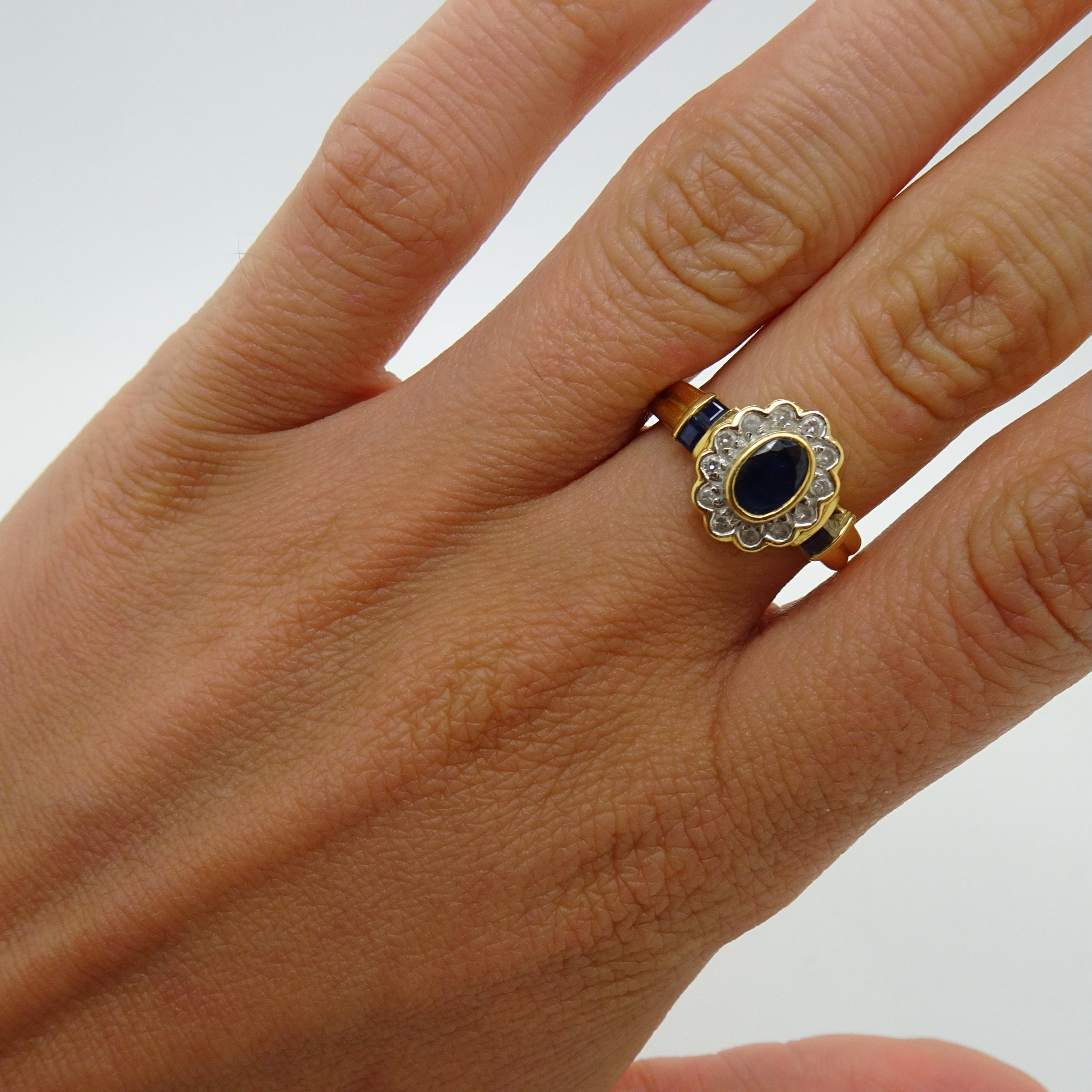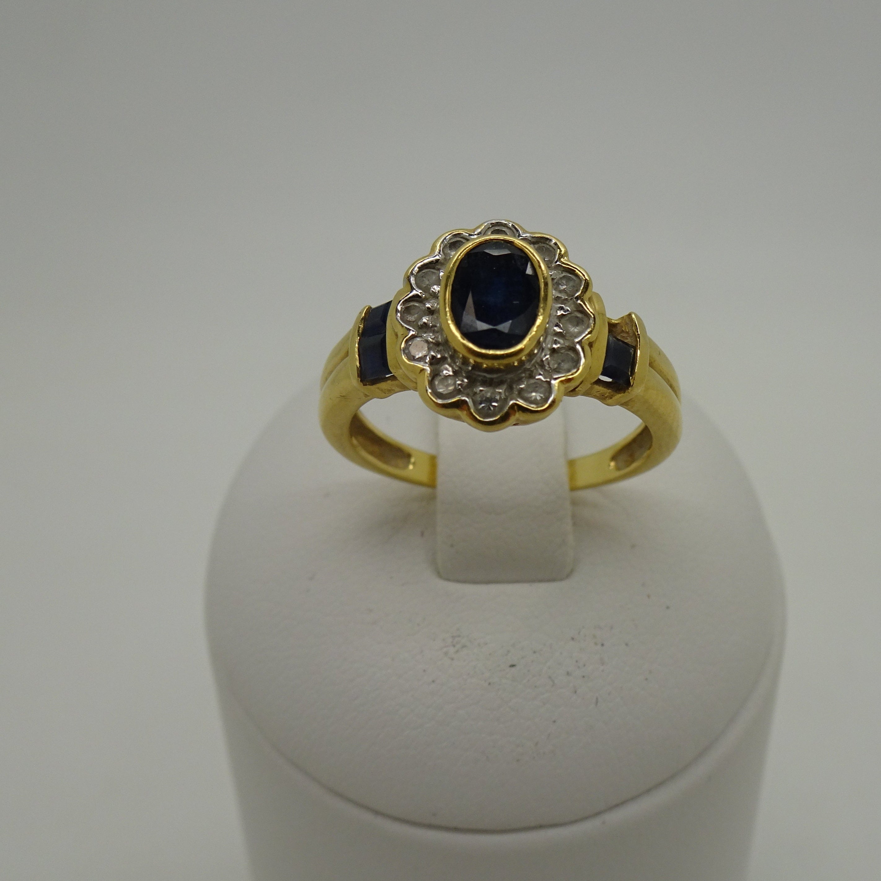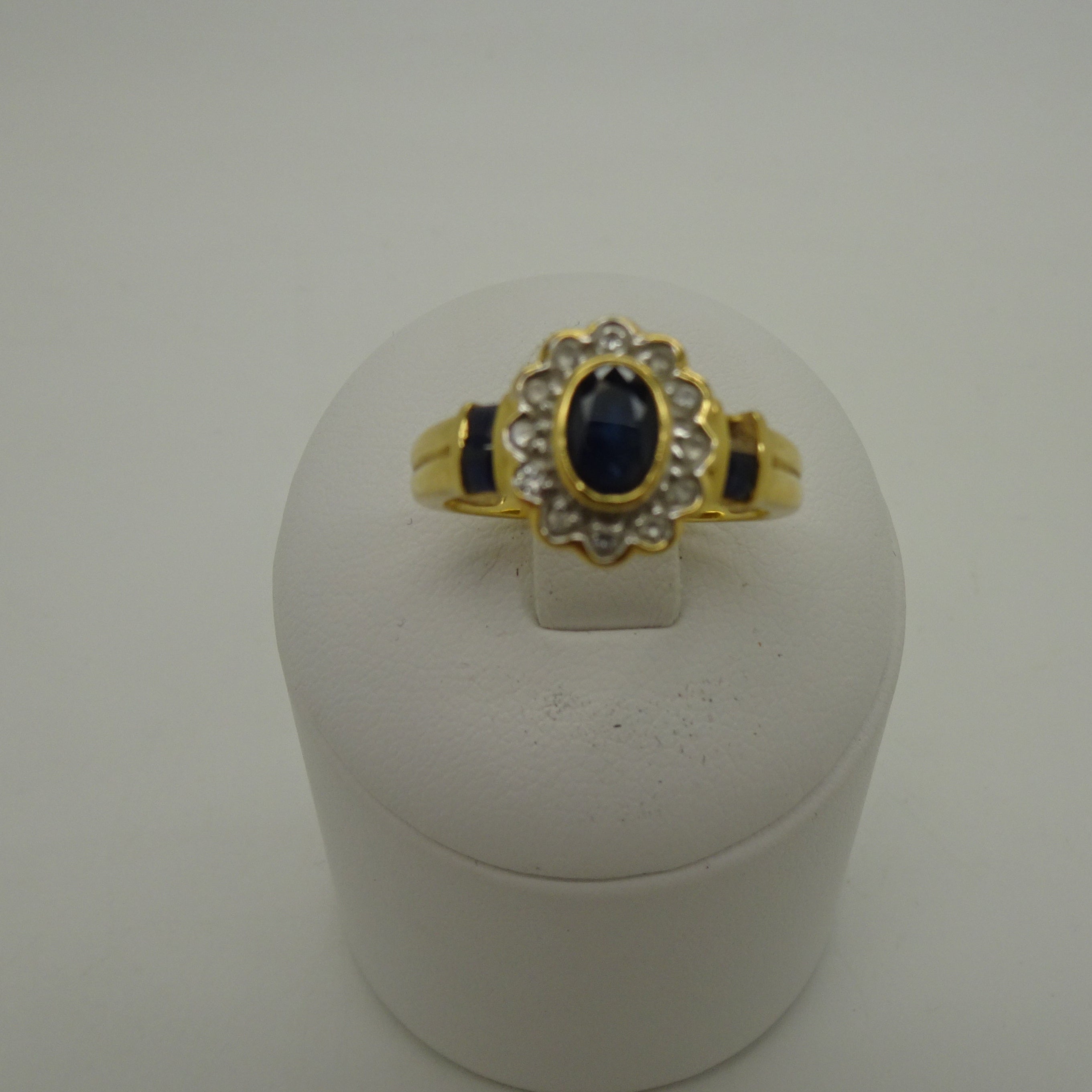 Bague marguerite en or jaune 18 carats (750/1000), poinçonnée tête d’aigle. Elle pèse 4,15 grammes et est de taille 55. Ce modèle est orné d’un saphir central, de 3 saphirs latéraux (dont un manquant) et de 13 diamants taille brillant. L’ensemble est en très bon état, malgré l’absence d’un saphir latéral.