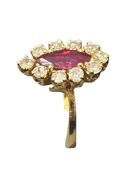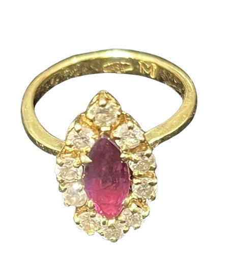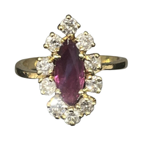 Bague marquise vintage rubis et diamants en or jaune 18 carats (750 millièmes) . Bague ancienne centrée d’un rubis naturels de taille ovale, pesant environ 0.5 carat. Le rubis est entouré de 10 diamants de 0.10 carats.