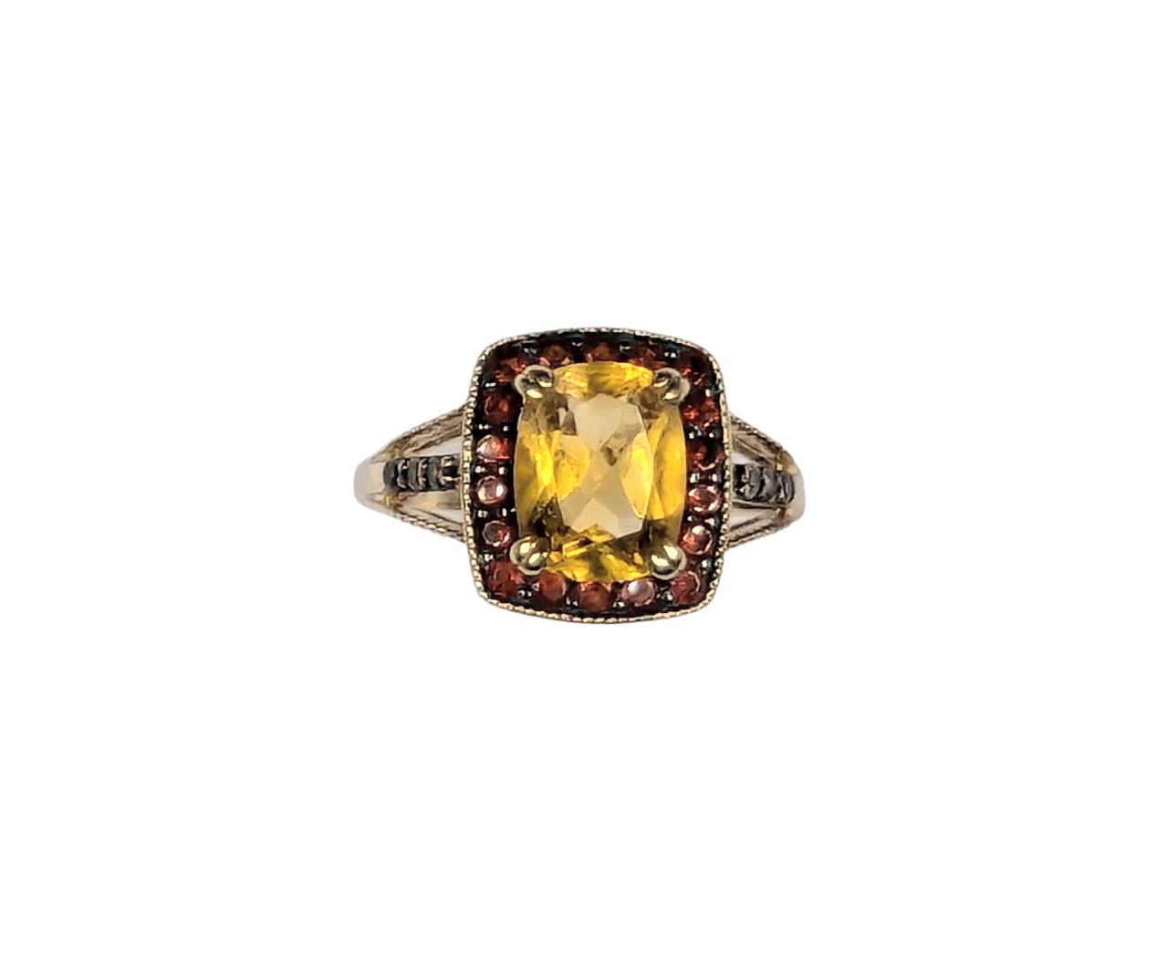 Pierres : 1 citrine 1,70 carat, 18 grenats total 60/100e de carat et 6 quartz fumés 10/100e de carat, et diamants