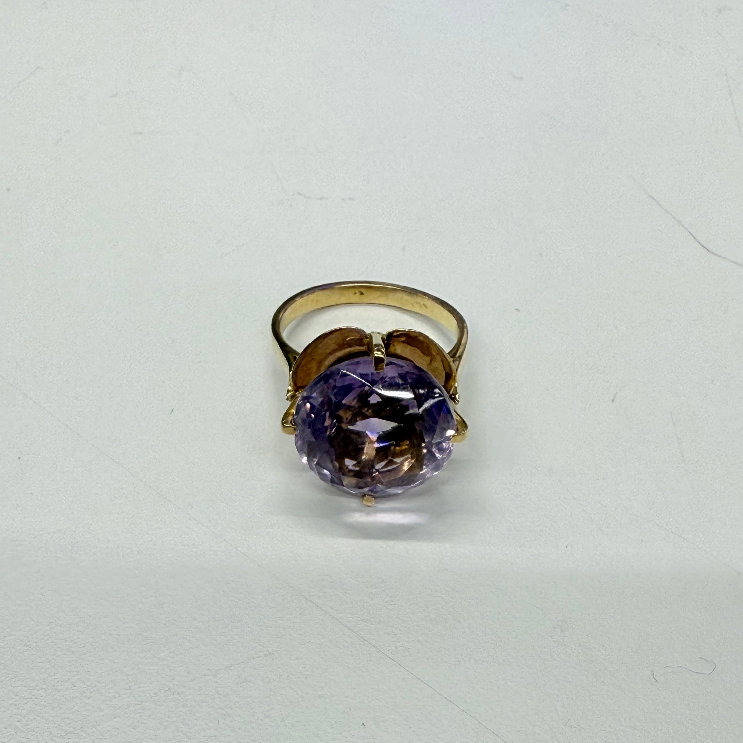 Élégance et éclat se rencontrent dans cette bague en or jaune 18 carats, sublimée par une somptueuse améthyste de 1,3 cm de diamètre. Son poinçon Tête d’Aigle garantit son authenticité, tandis que son poids de 6,24 g lui confère une belle présence.