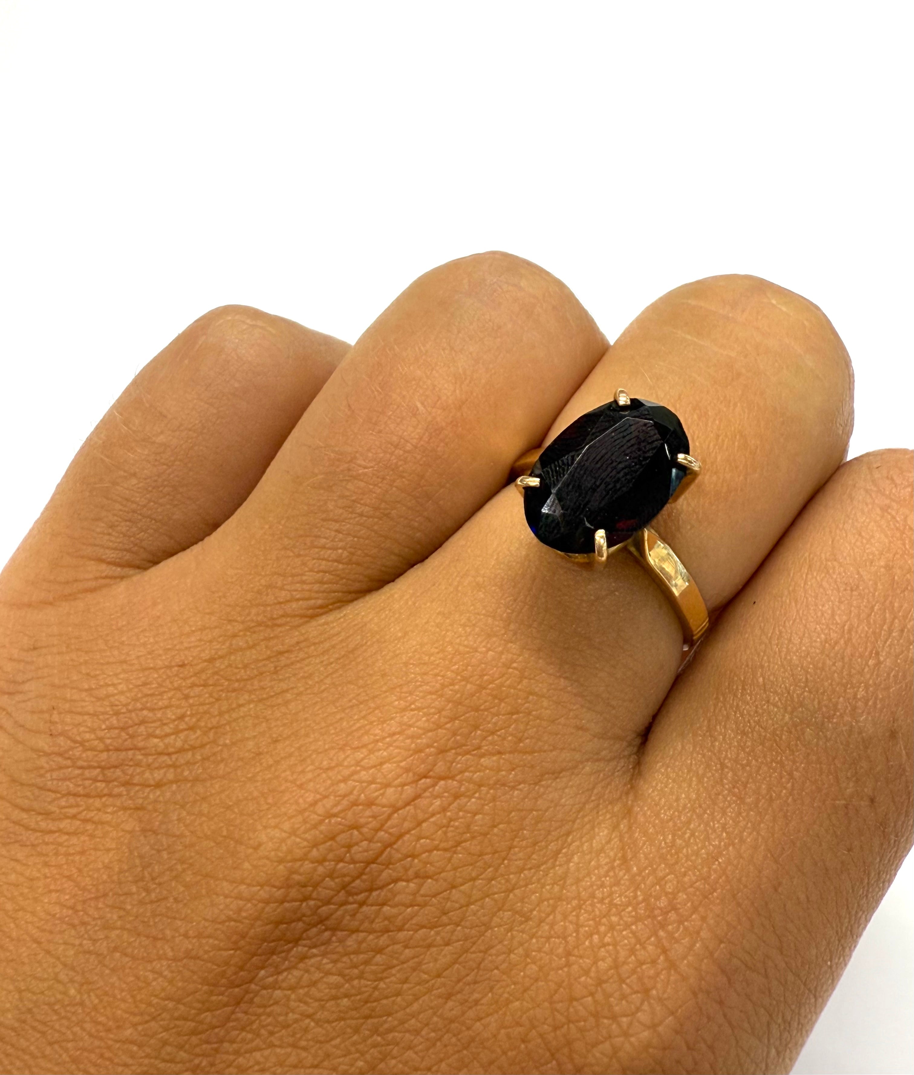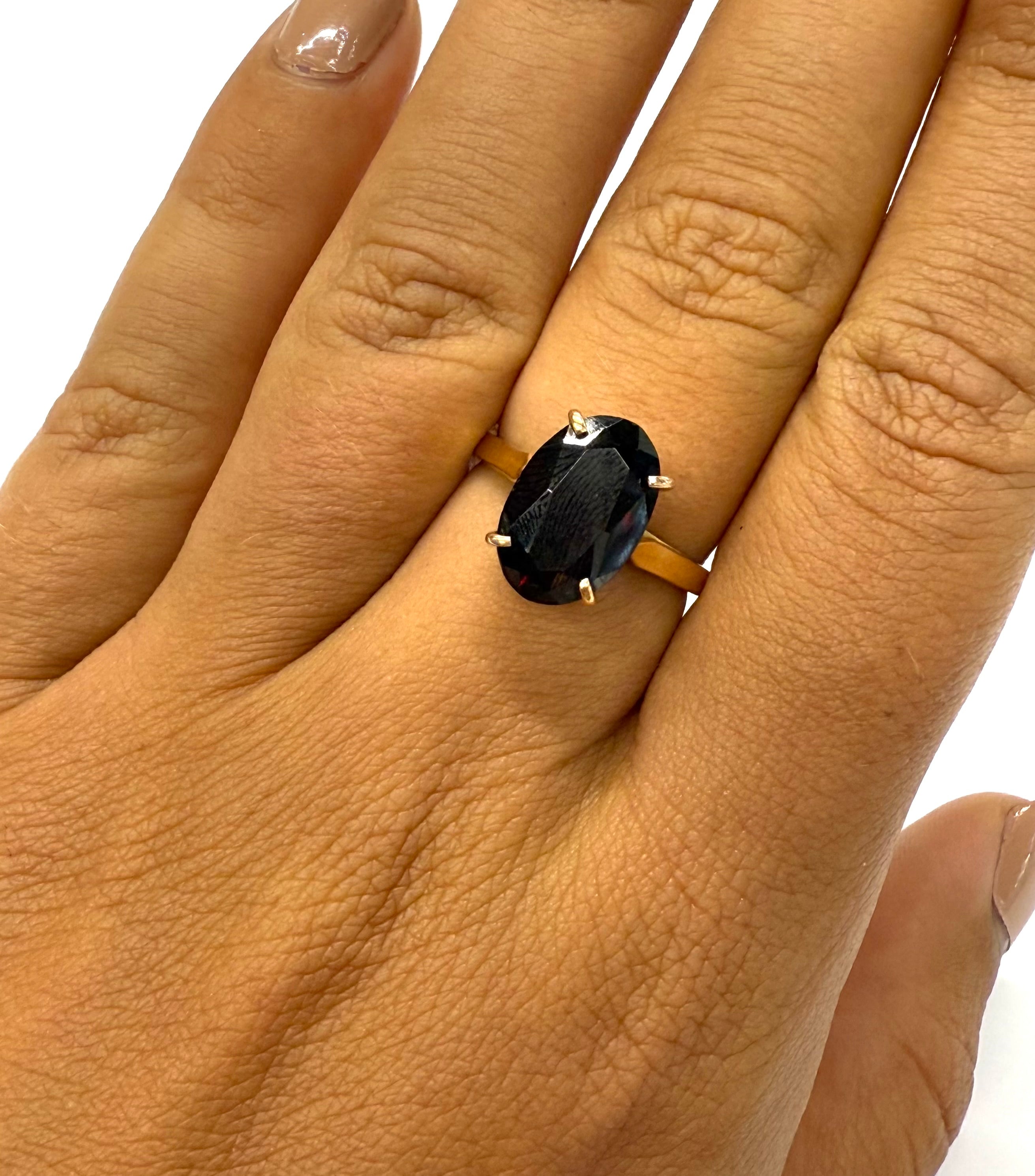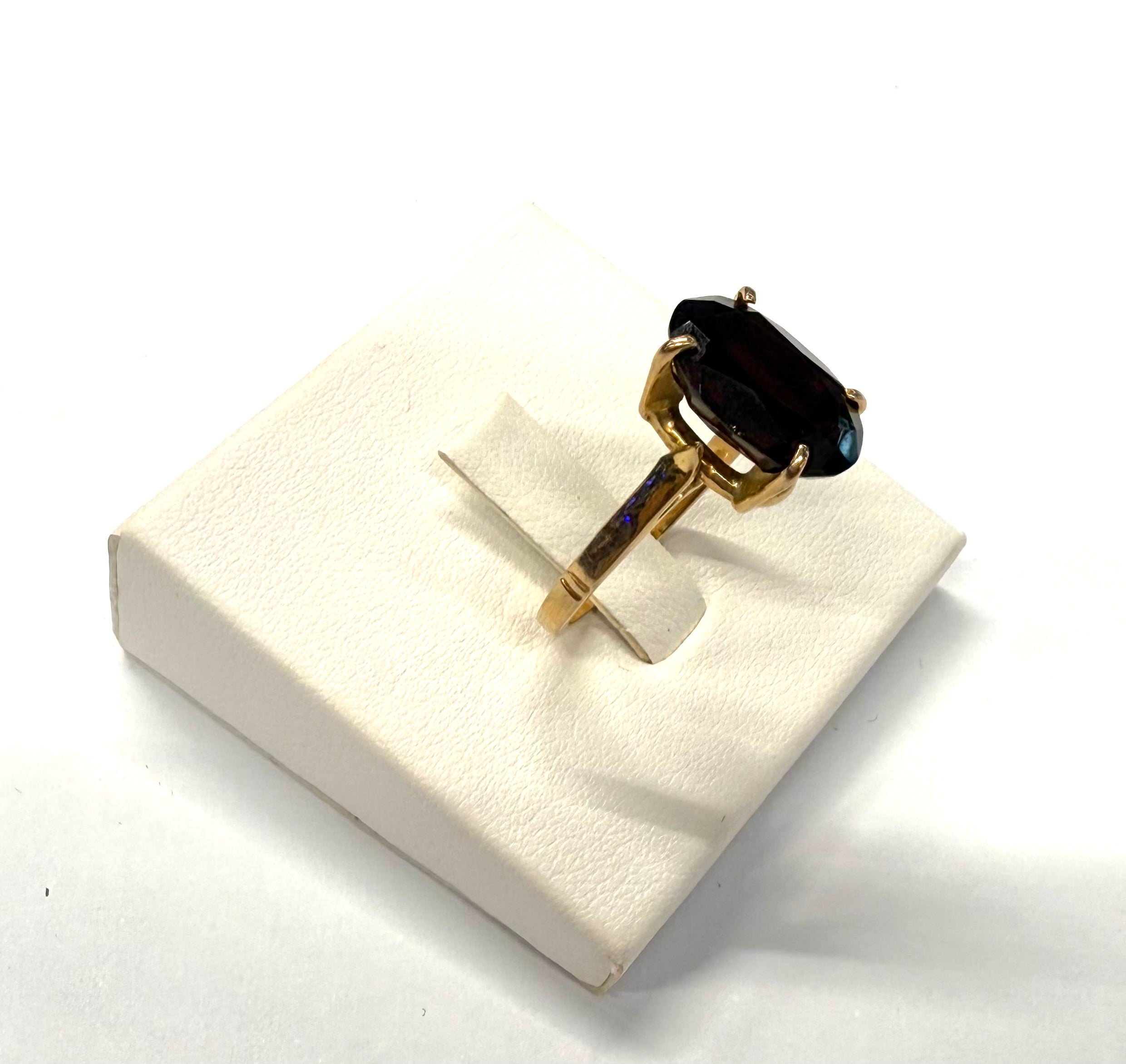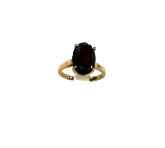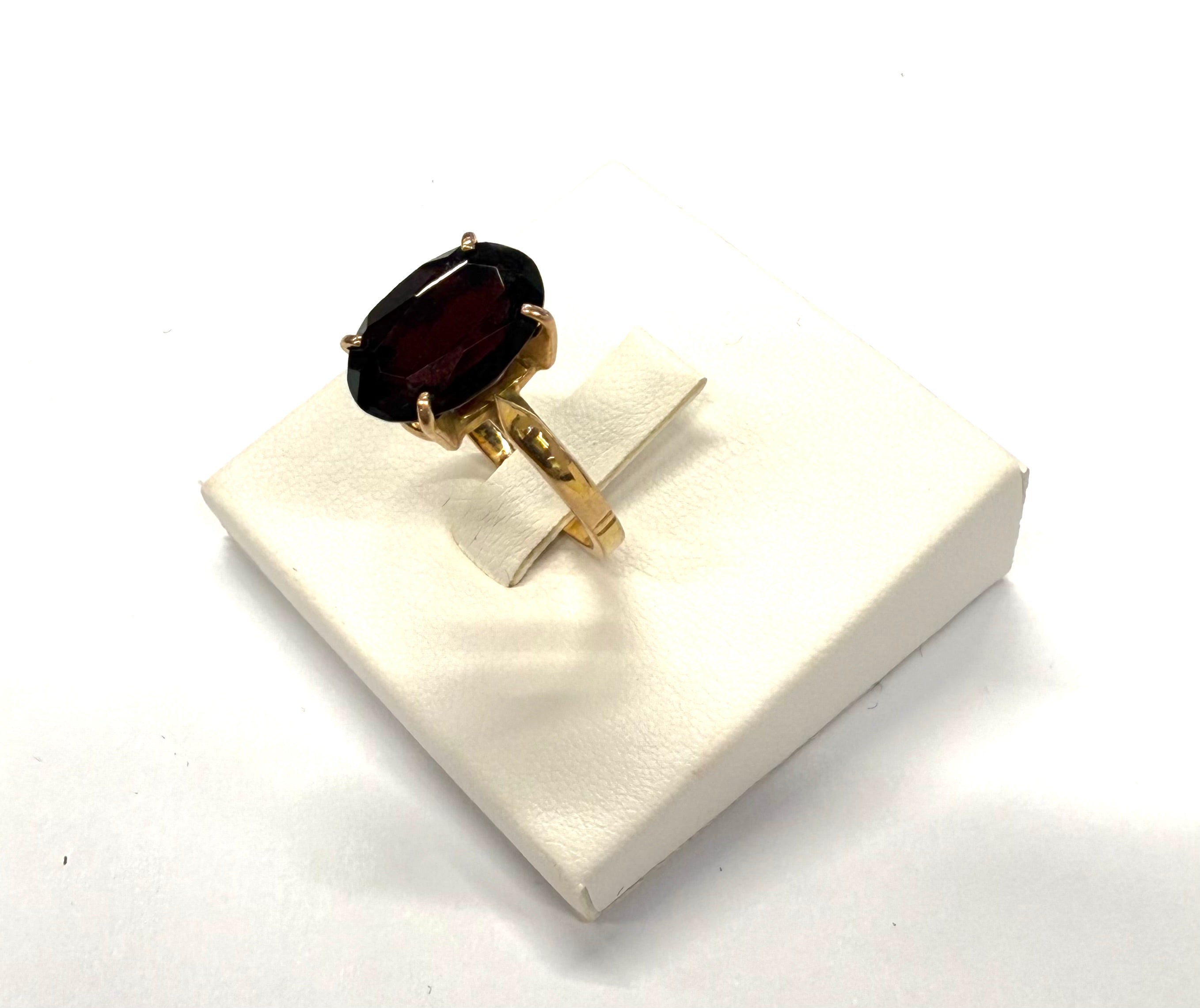 Bague empierrée en or jaune 18 carats (750/1000), poinçonnée Tête d’Aigle, de taille 53 et d’un poids de 4,34 g. Elle est sertie d’un grenat mesurant 1,2 cm de long sur 0,8 cm de large. En très bon état.