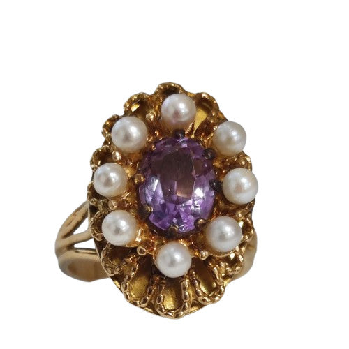 Magnifique bague or 750/1000 avec pierre violette et perles blanches
