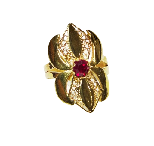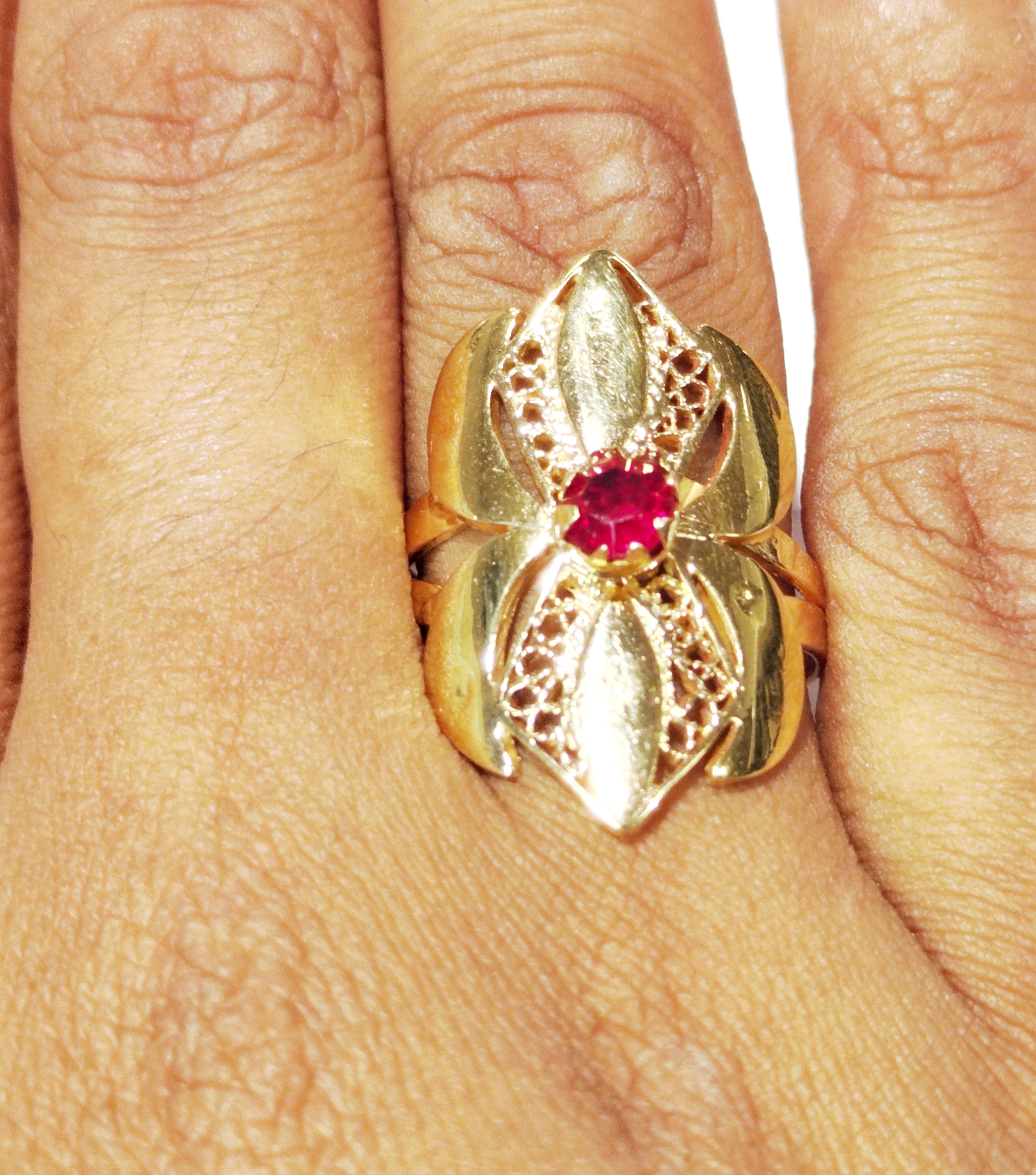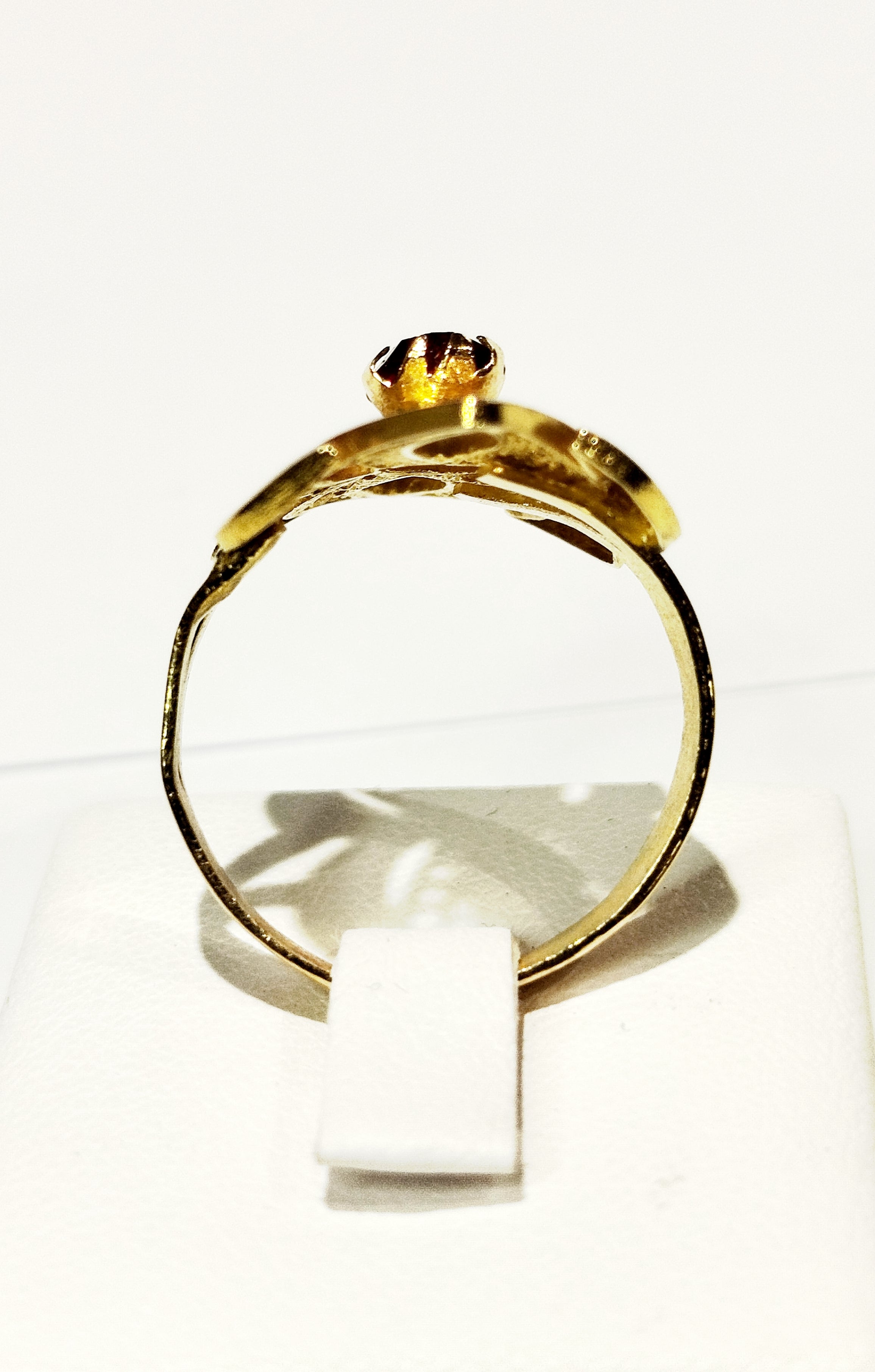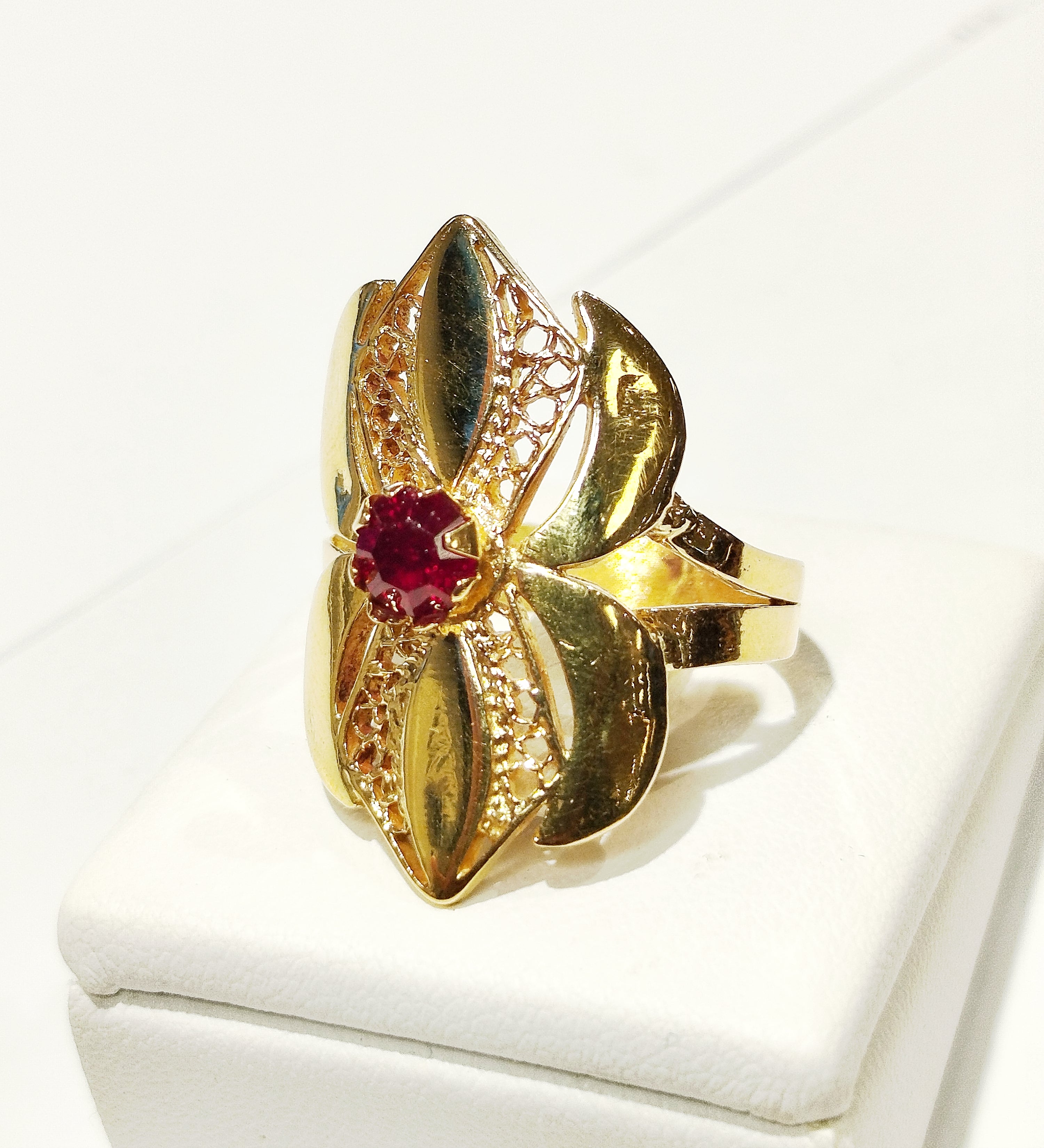 Bague en or jaune 14 carats (585/1000). Pesant 4.46 grammes. Ornée d'une pierre en oxyde de zirconium rouge. Taille 56.