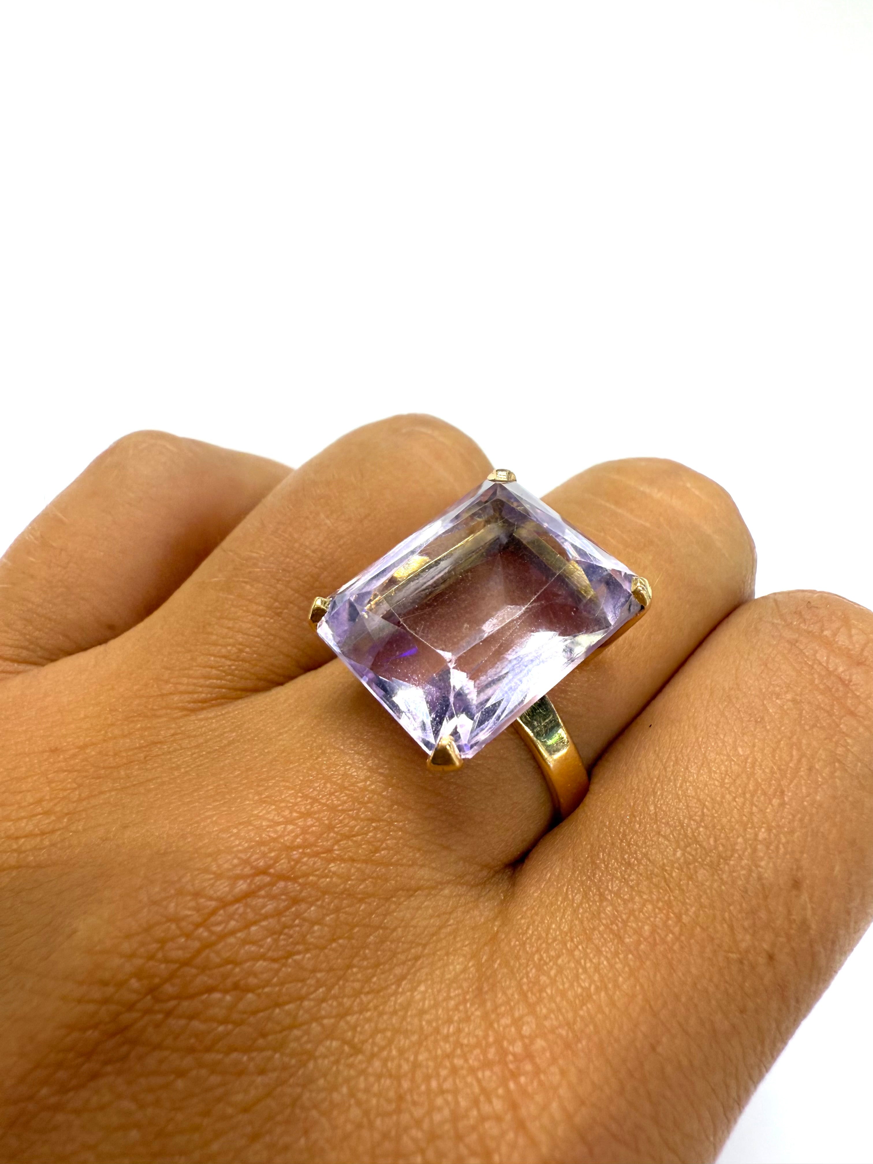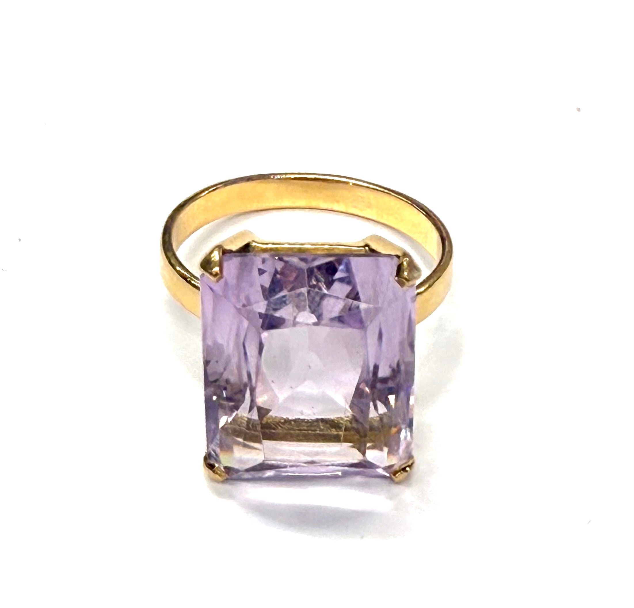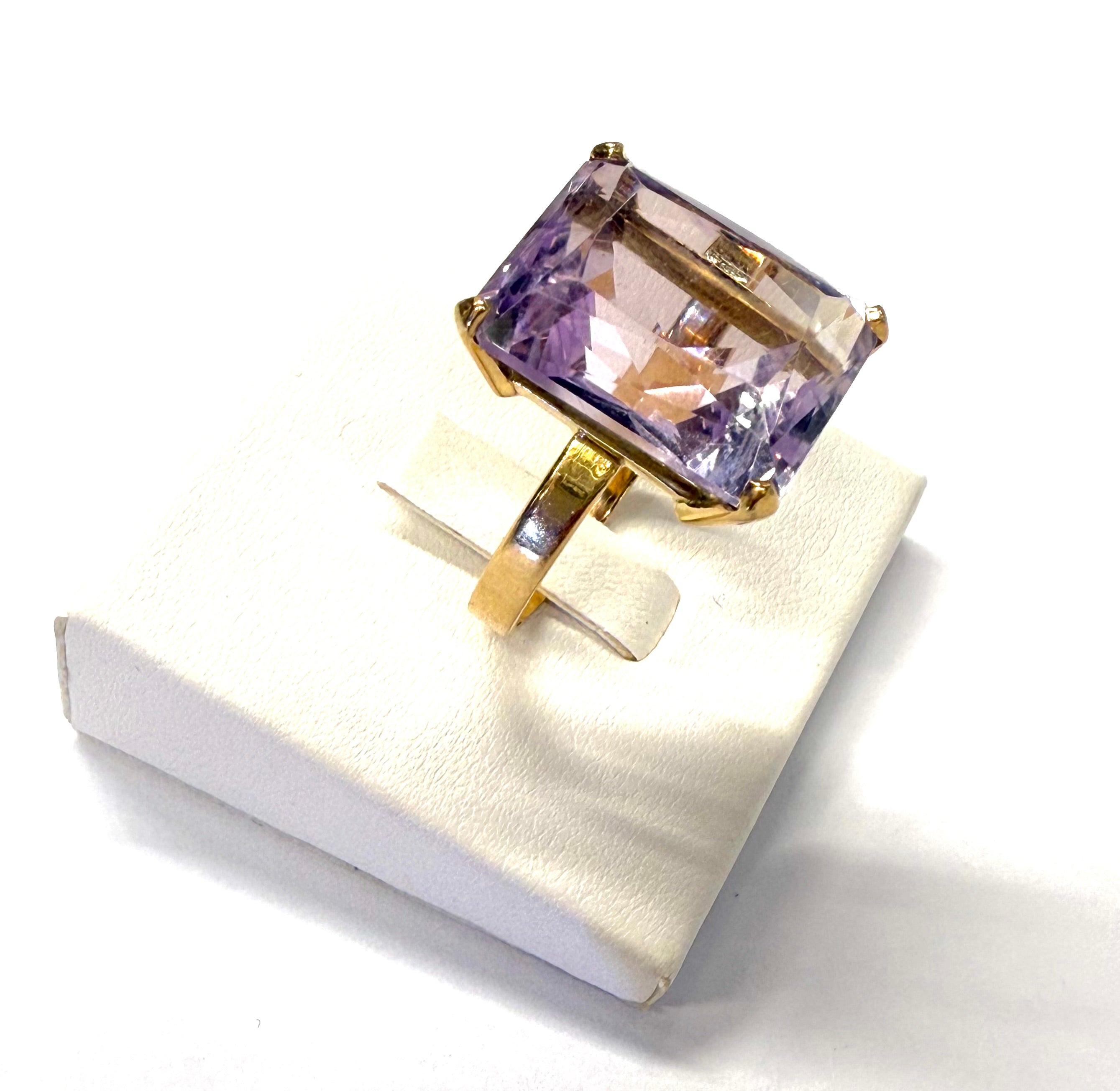 Bague empierrée en or jaune 18 carats (750/1000), poinçonnée Tête d’Aigle, taille 62, pour un poids de 8,45 g. Elle est ornée d’une améthyste de 1,9 cm de long sur 1,5 cm de large. En très bon état.