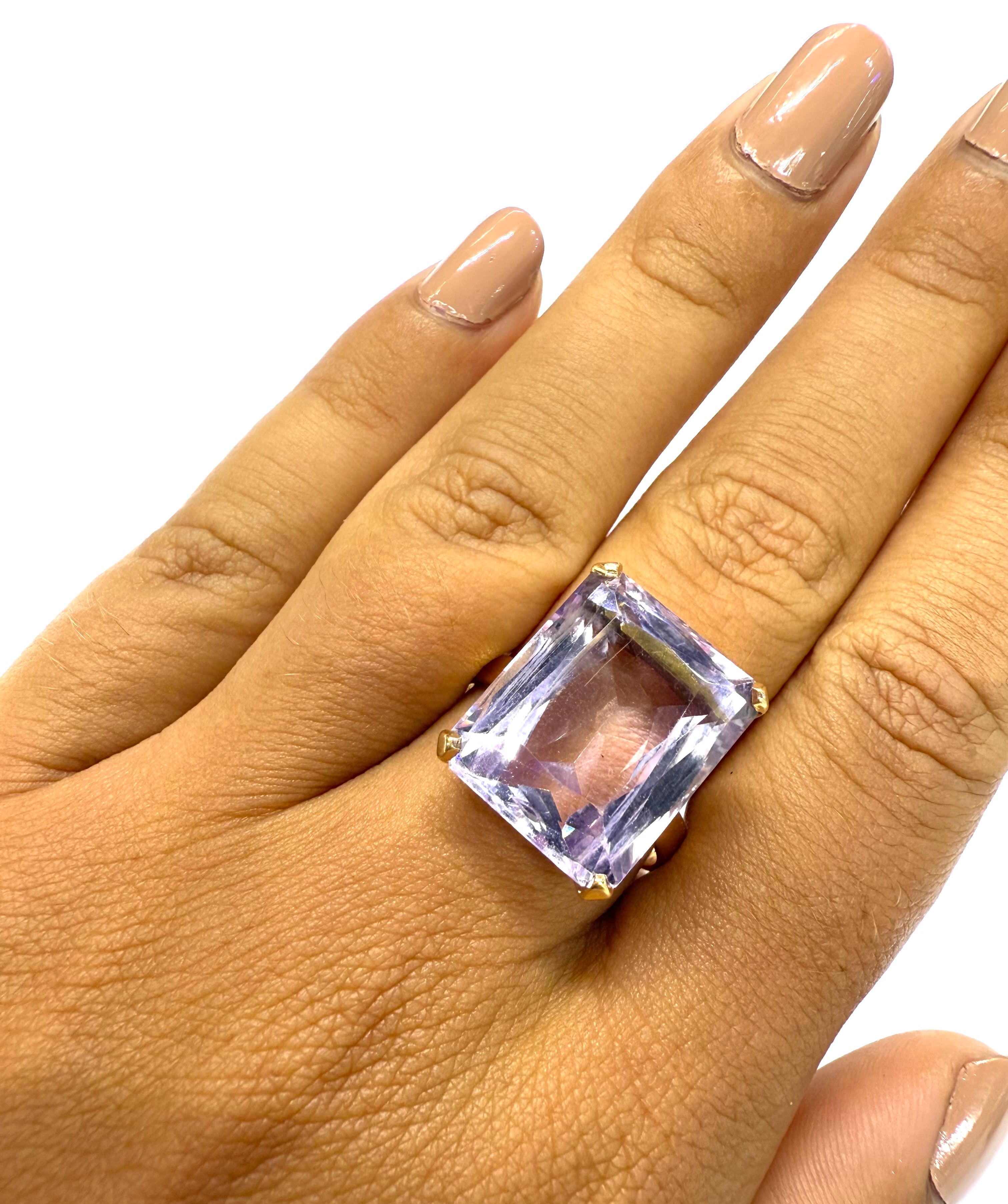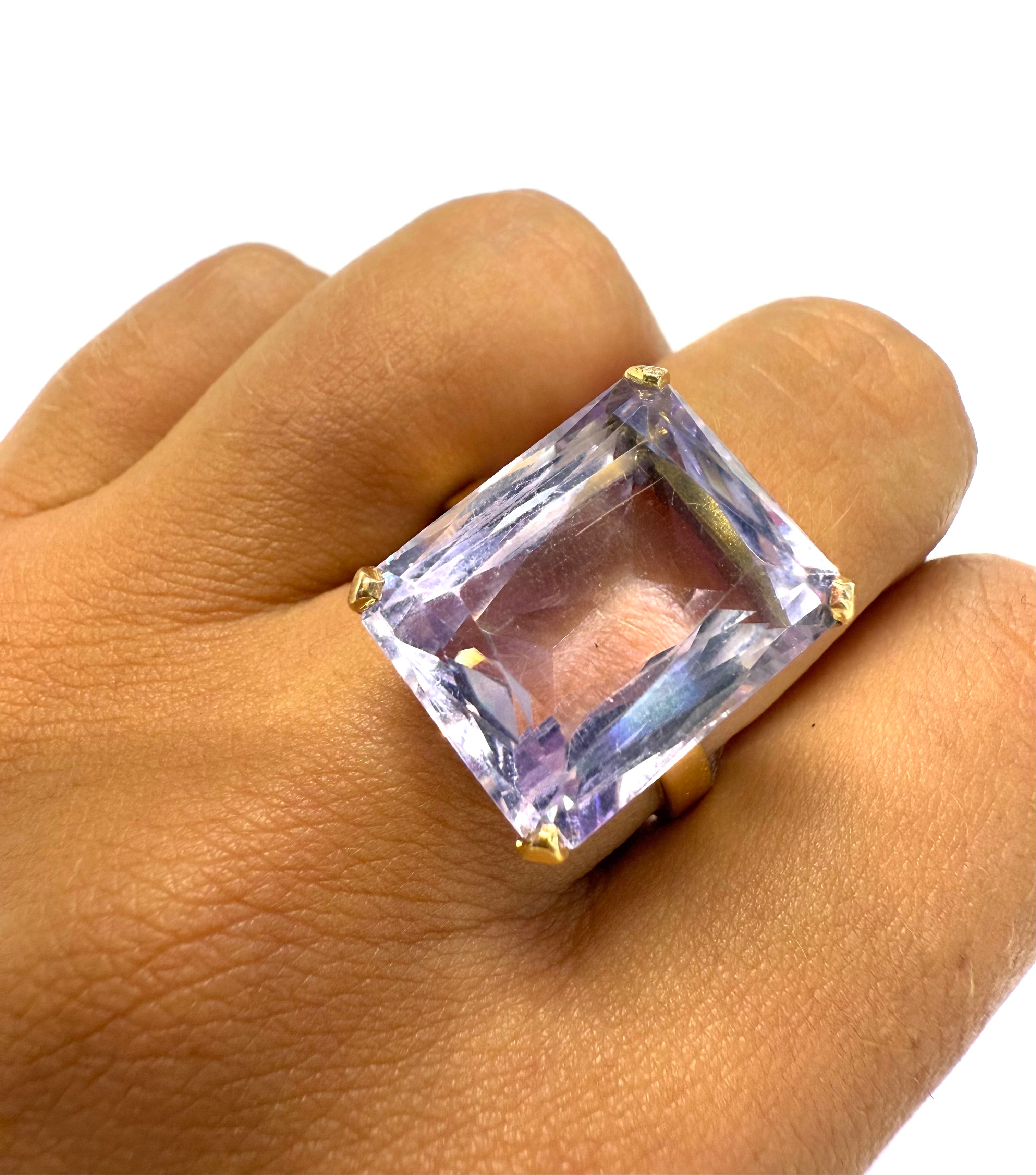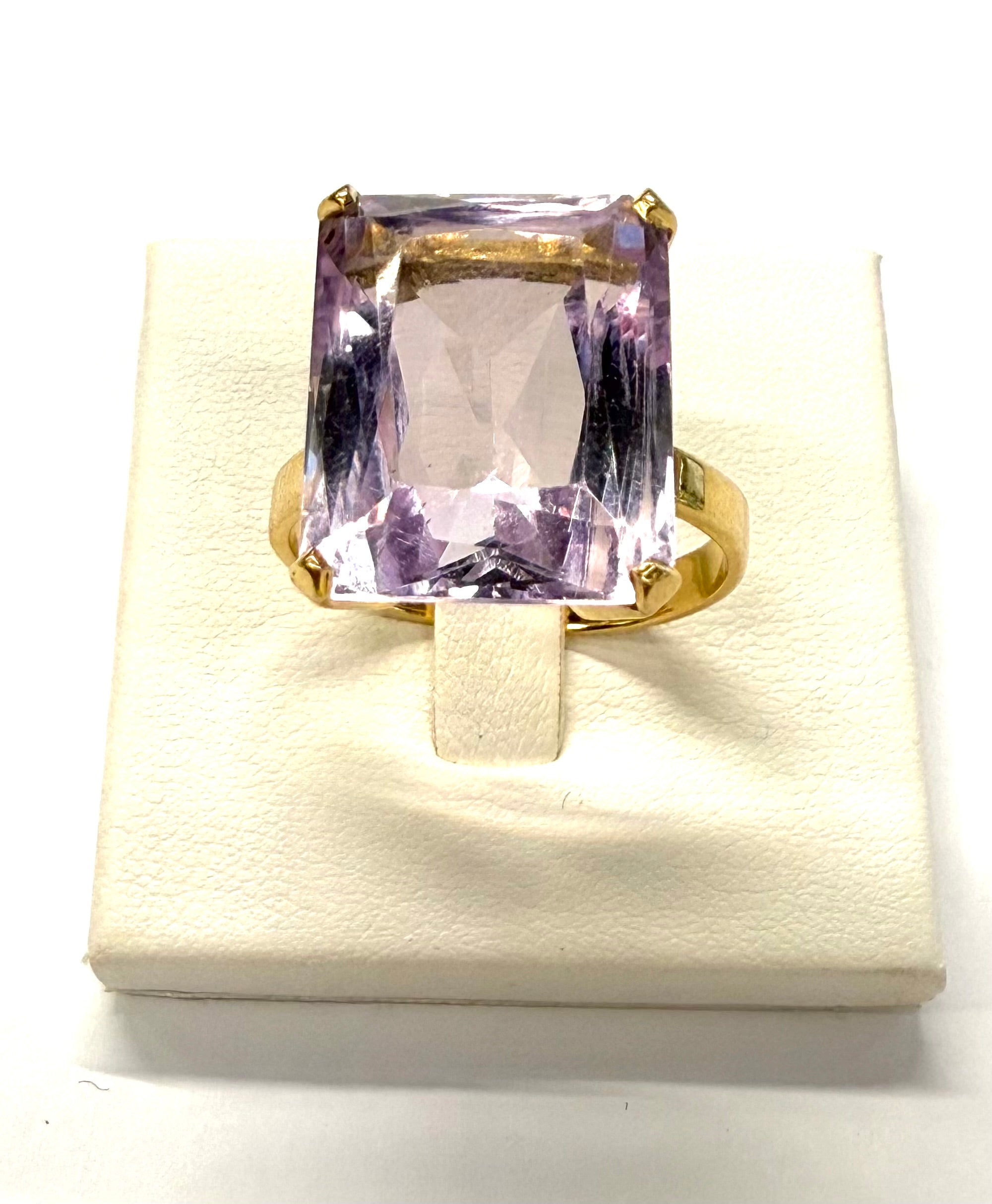Bague empierrée en or jaune 18 carats (750/1000), poinçonnée Tête d’Aigle, taille 62, pour un poids de 8,45 g. Elle est ornée d’une améthyste de 1,9 cm de long sur 1,5 cm de large. En très bon état.