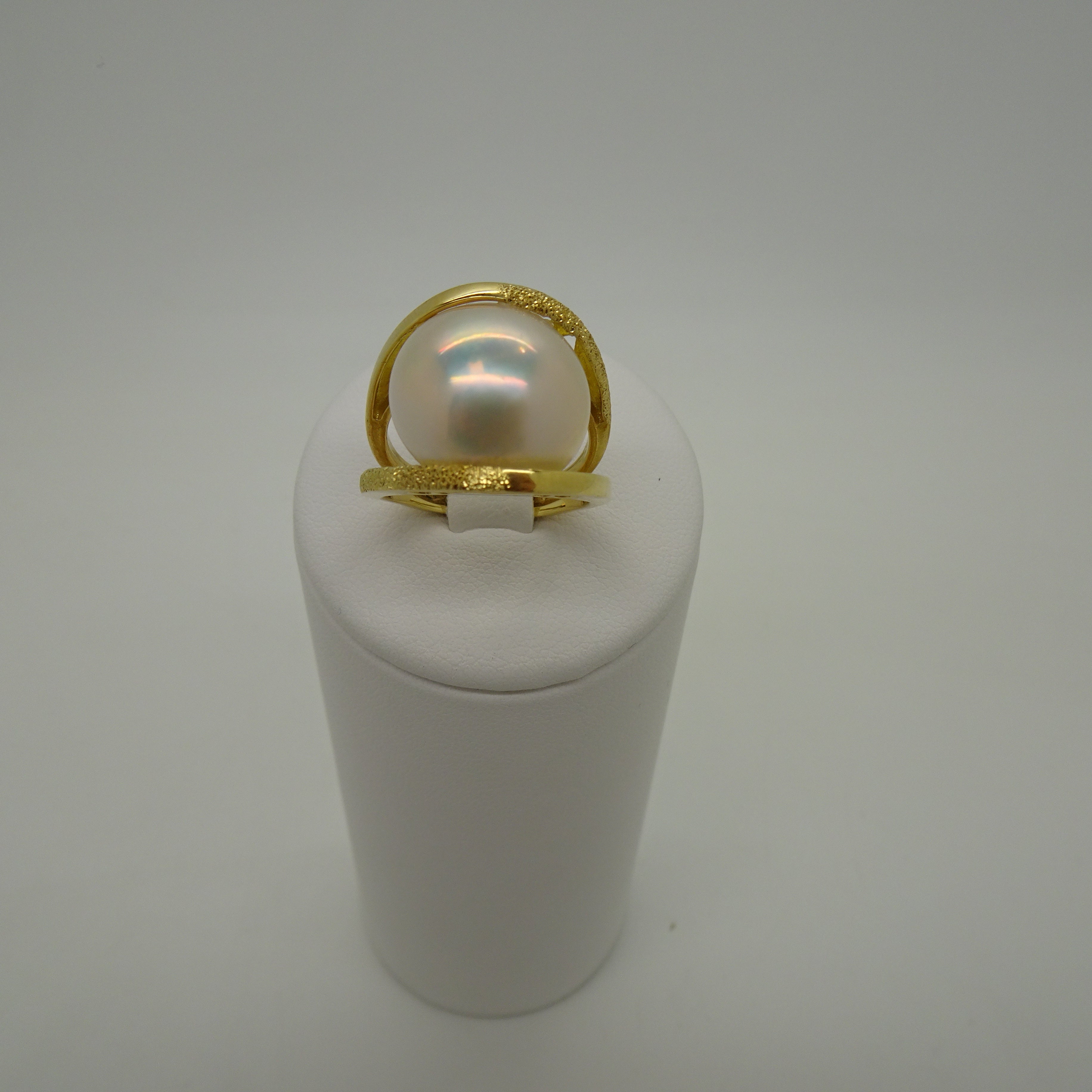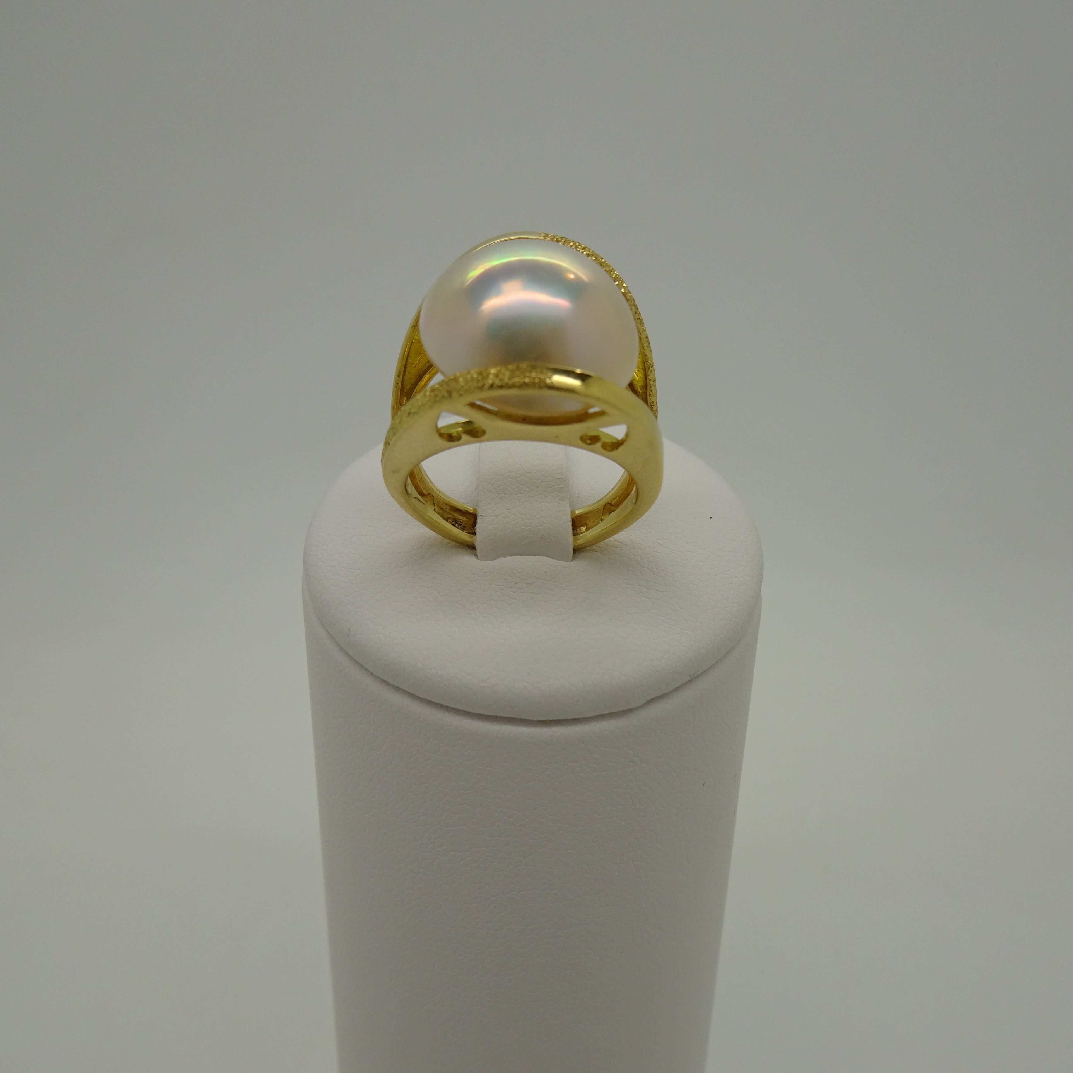 Bague empierrée en or jaune 18 carats (750/1000), poinçonnée tête d’aigle. D’un poids de 8,44 grammes et de taille 54, elle est ornée d’une perle de nacre. L’ensemble est en très bon état.