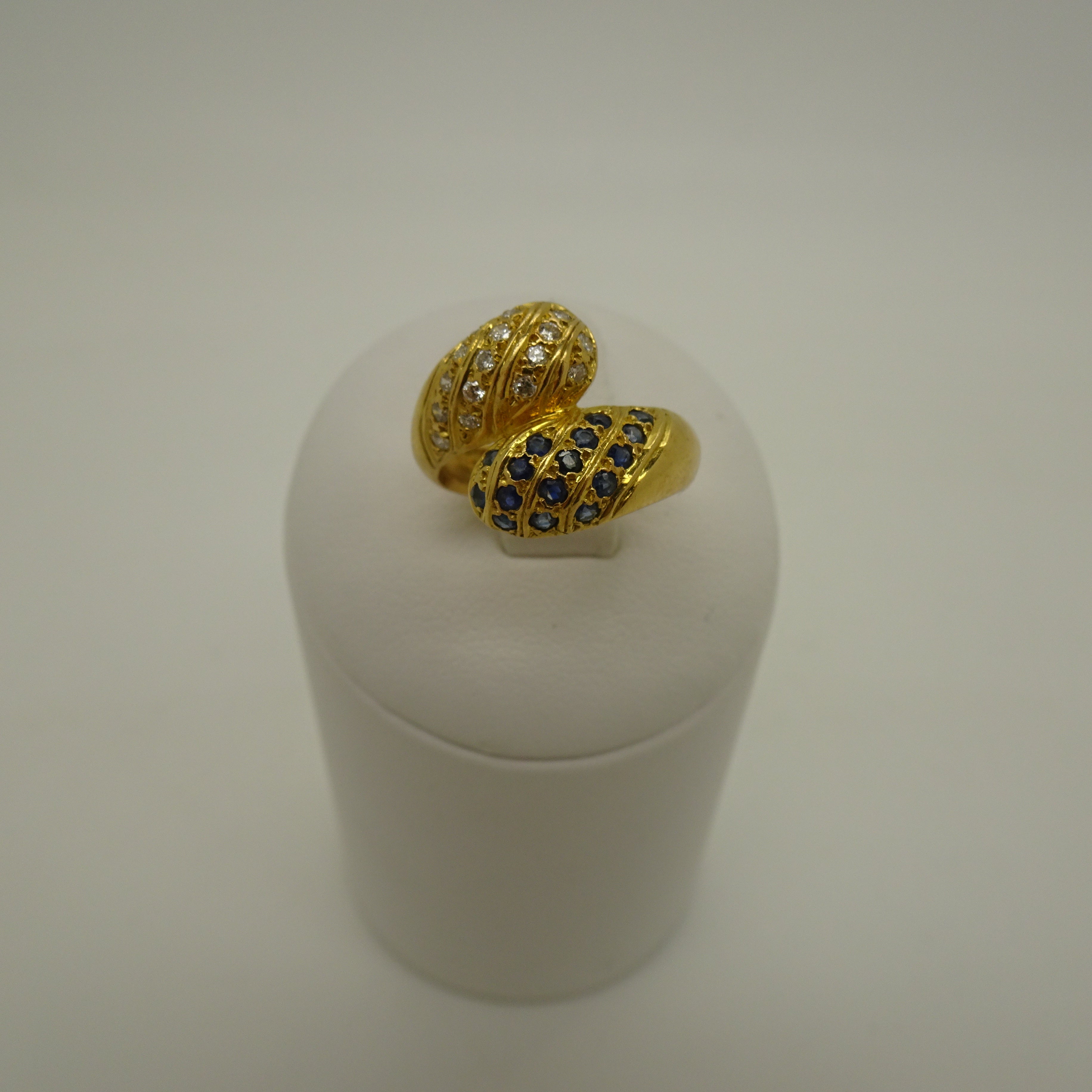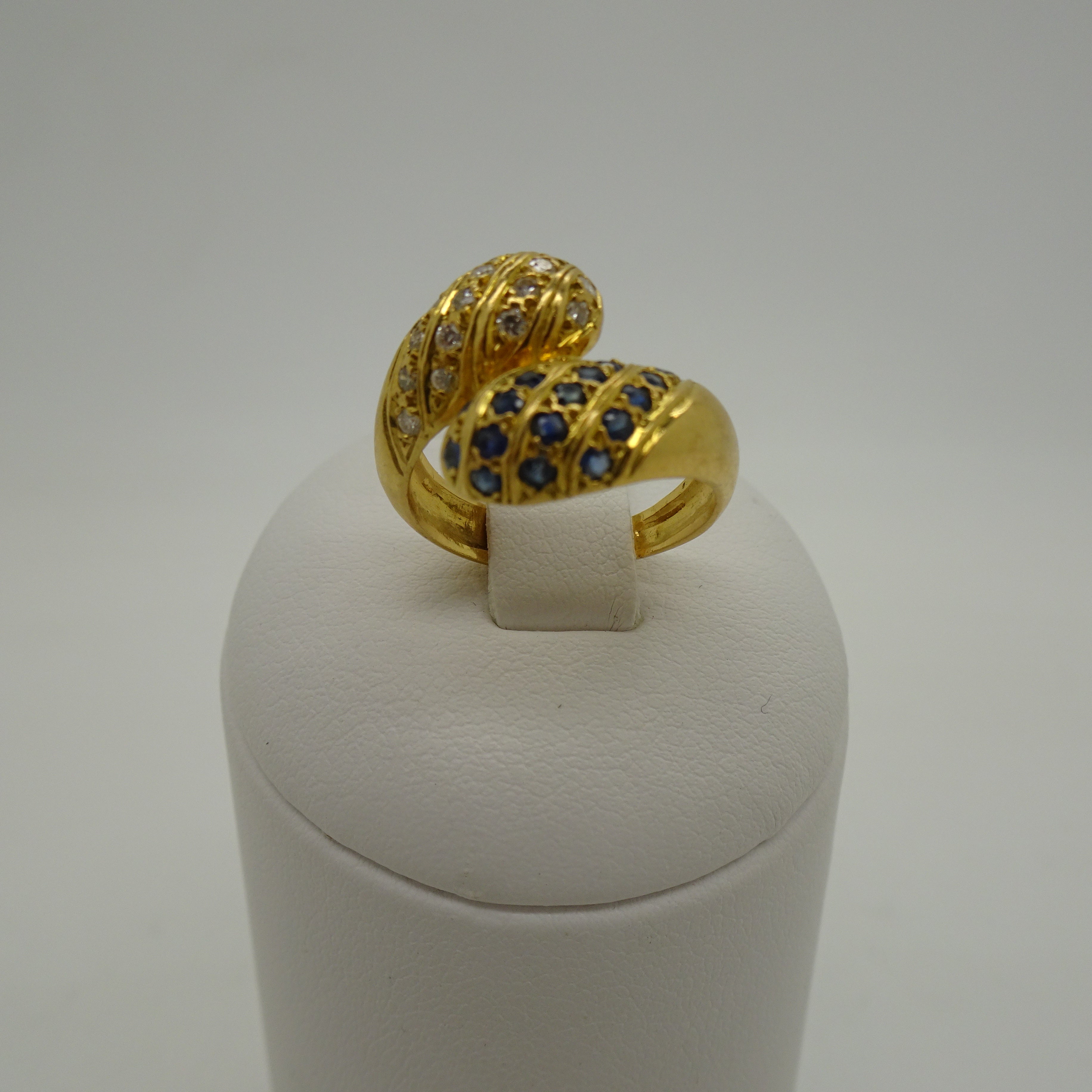 Bague empierrée en or jaune 18 carats (750/1000), poinçonnée tête d’aigle. Taille 48, poids 4,68 g. Sertie de 16 pierres bleues type spinelle et 16 diamants taille brillant. En très bon état, colorée et raffinée.