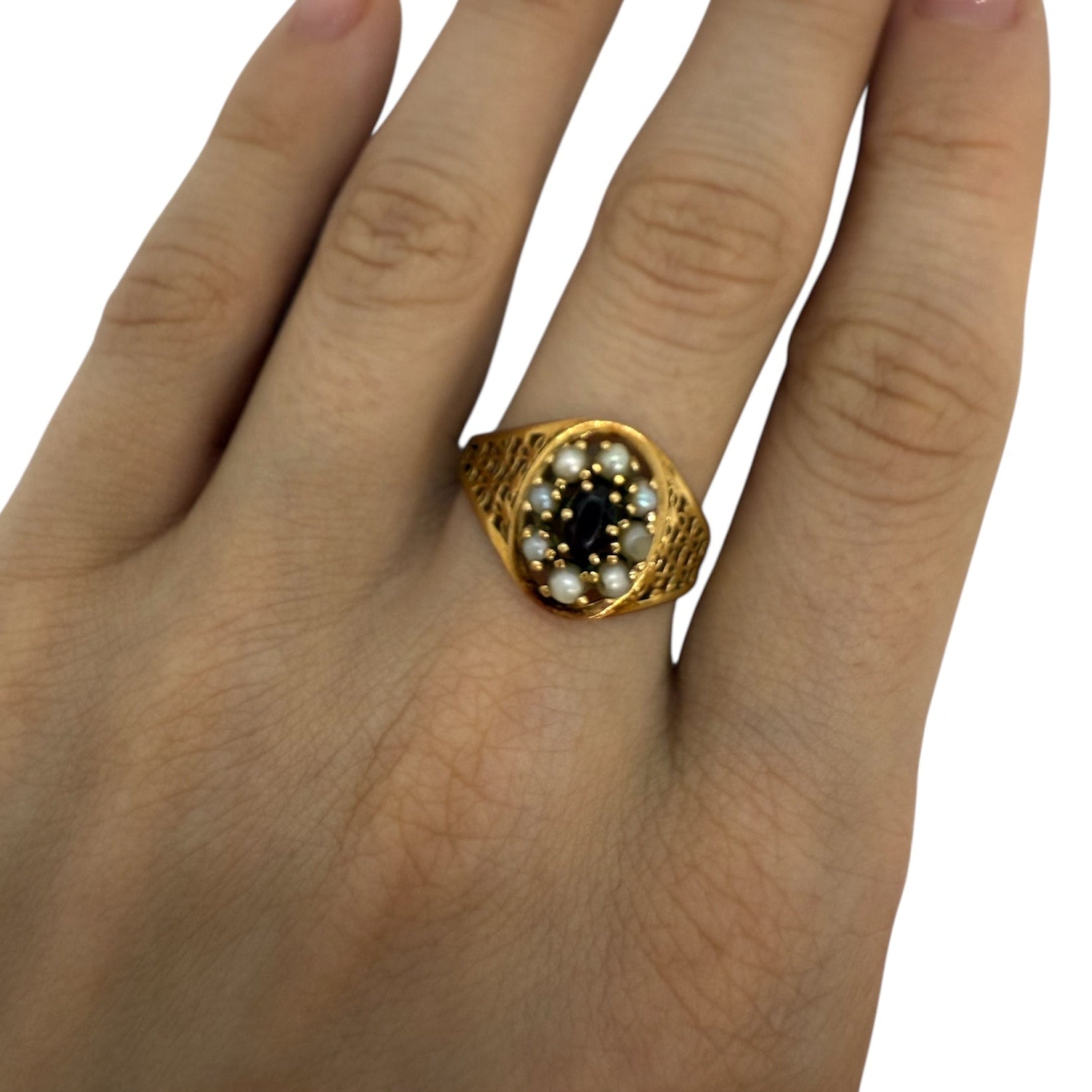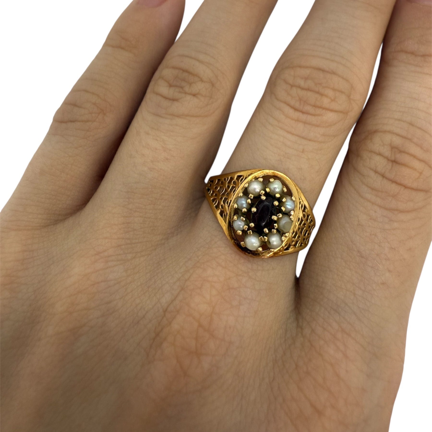 Bague empierrée en or jaune 18 carats (750/1000), sans poinçon, ornée d’un grenat de 0,10 carat et de huit perles. Taille 56, pour un poids total de 3,43 grammes. État général : bon.