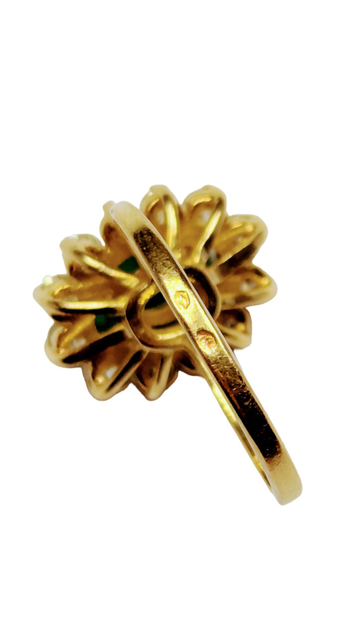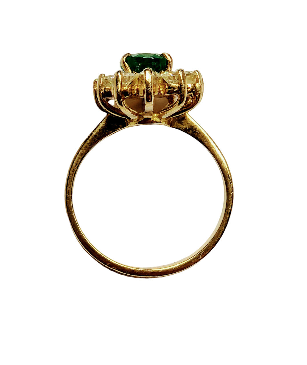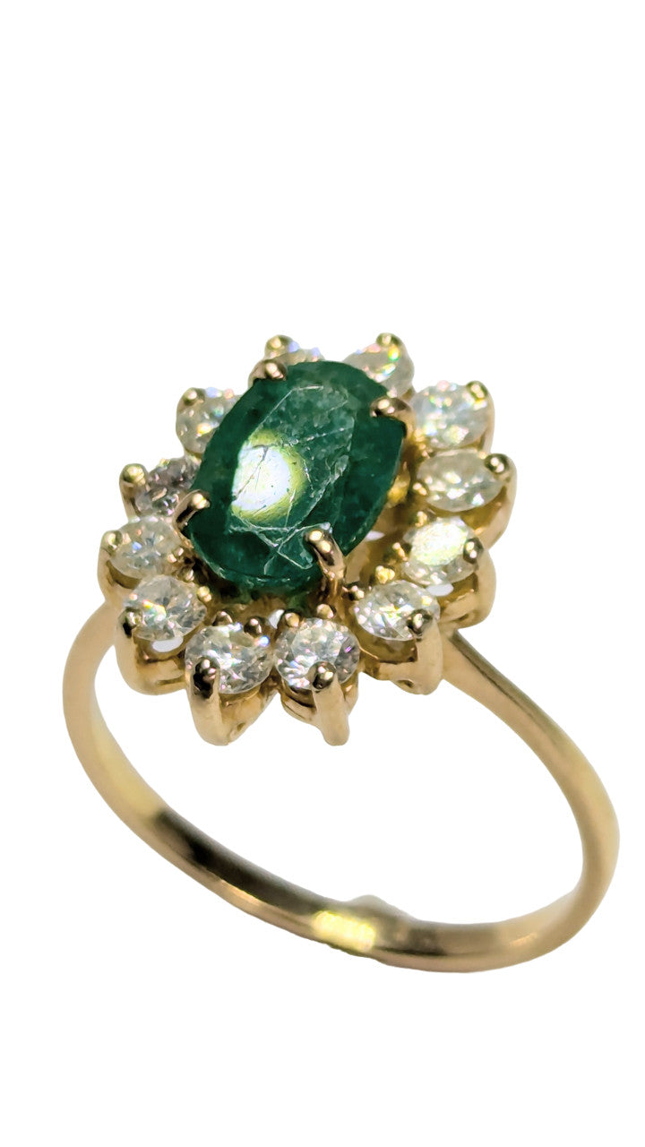 Etat : pierre vertes non certifiée - rayée Ravissante bague avec 12 diamants qui mettent en valeur la pierre centrale.