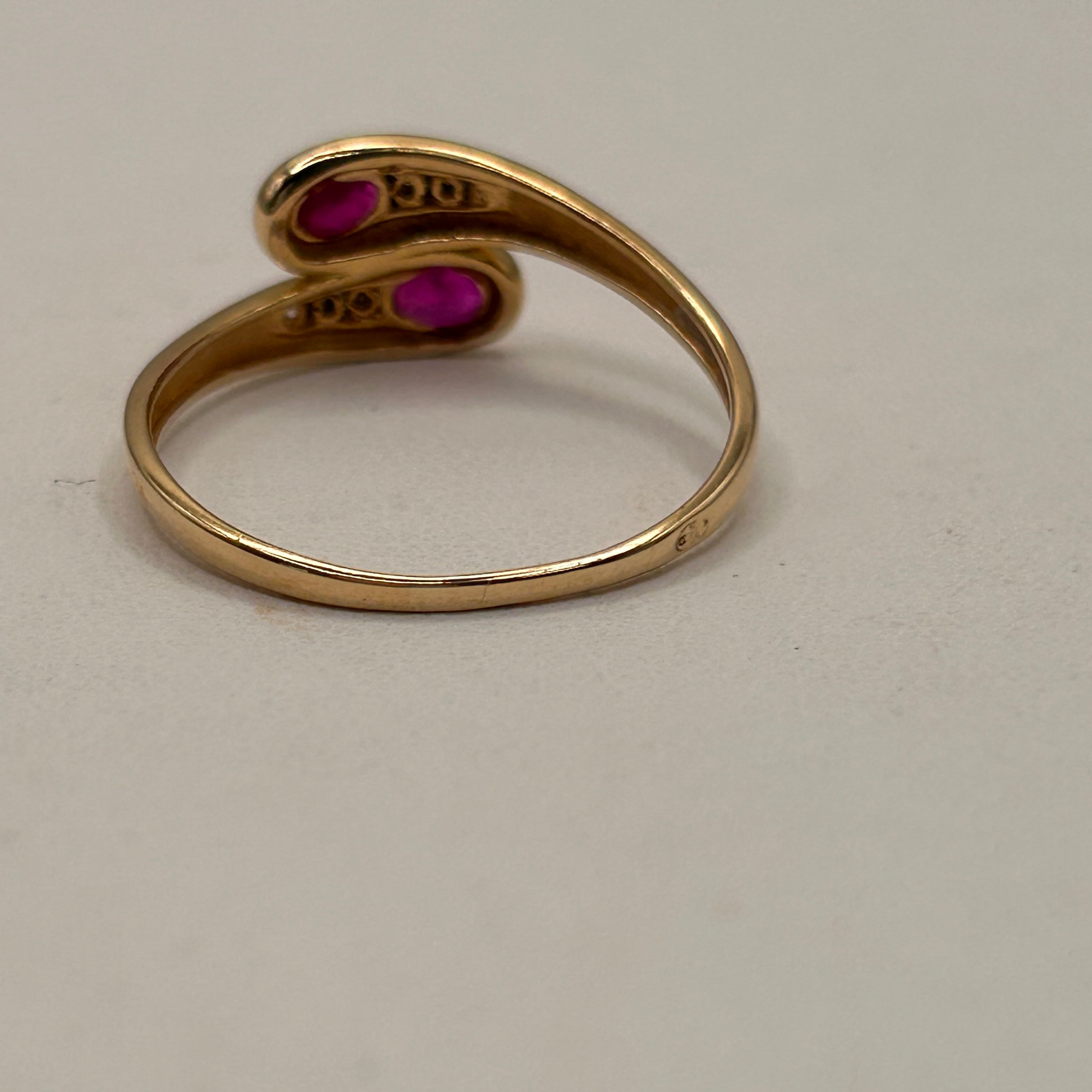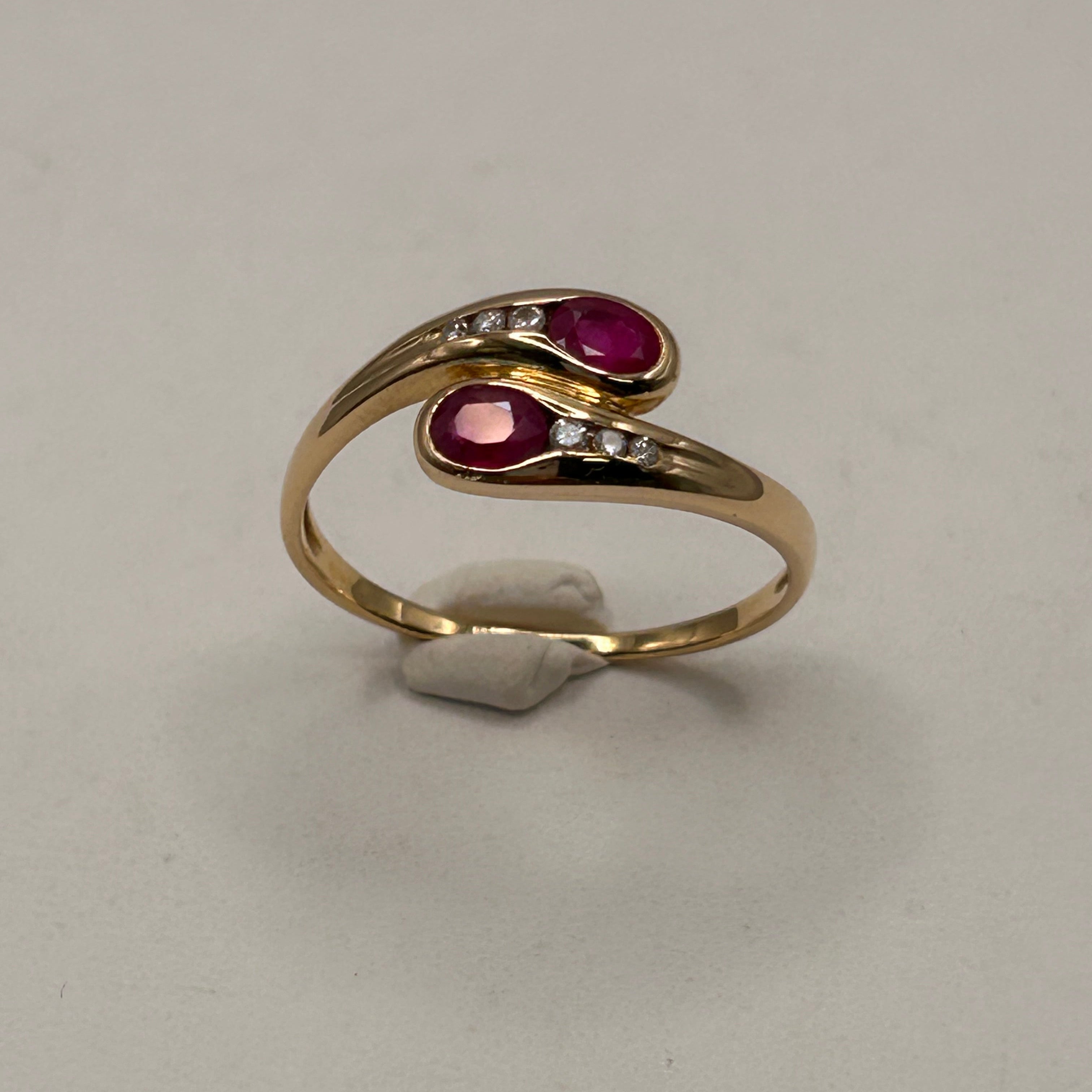 Bague empierrée en or jaune 18 carats (750/1000), sans poinçon officiel mais portant un poinçon de fabricant. Elle pèse 2,50 grammes et est de taille 61. Elle est sertie de 2 rubis de 0,18 carat chacun, accompagnés de 6 diamants brillants. Très bon état.