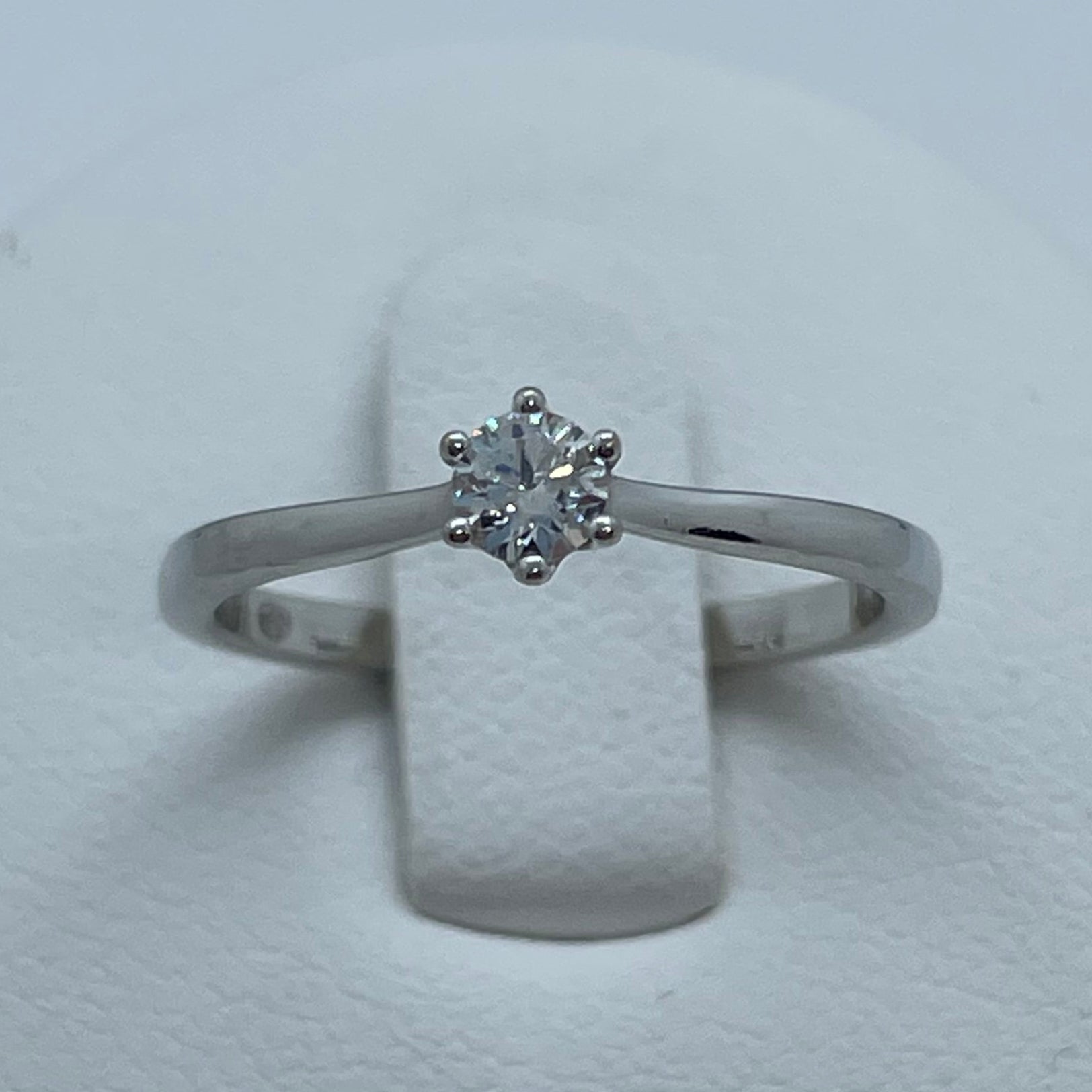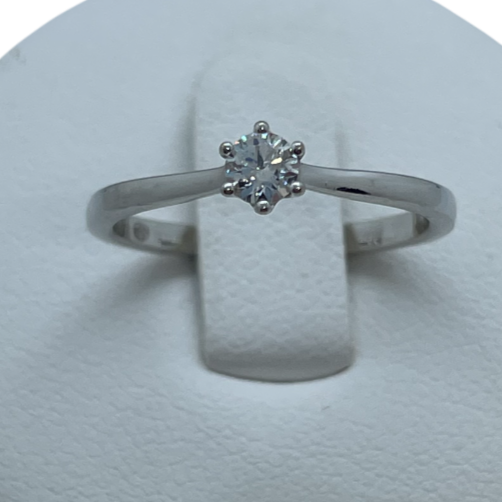 Bague solitaire en or blanc 18 carats (750/1000), sans poinçon, pesant 1,79 g. Taille 50. Ornée d’un diamant de 0,15 ct. Très bon état.