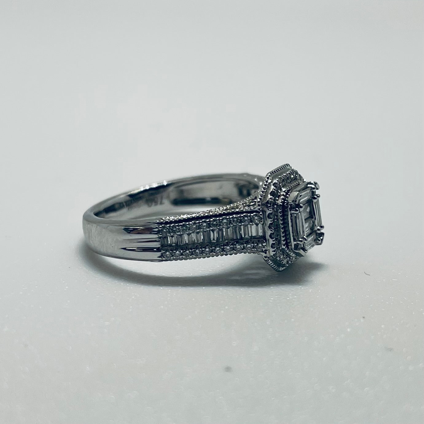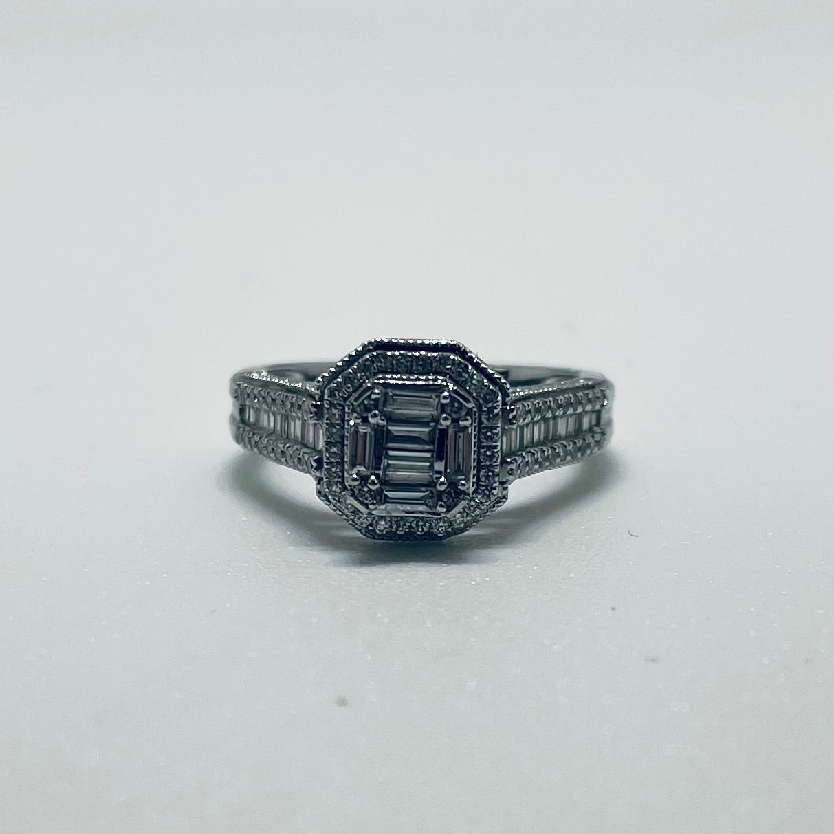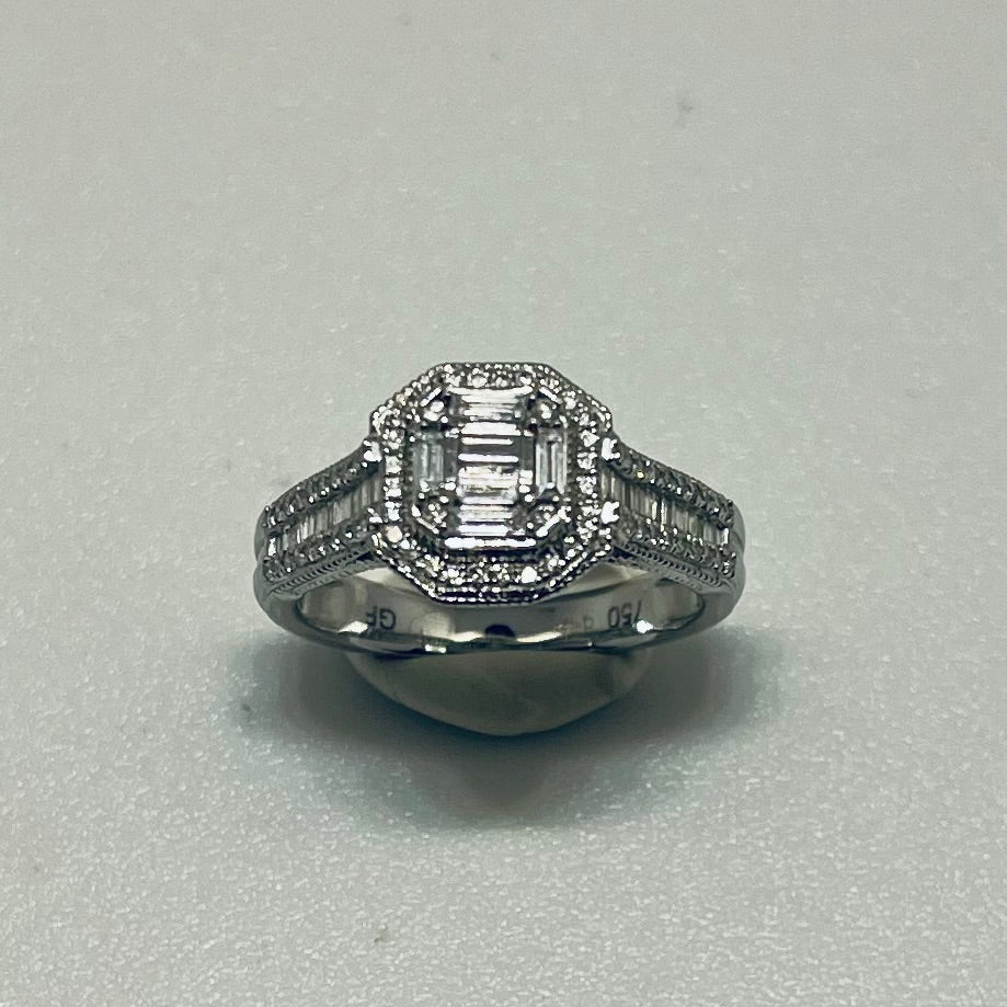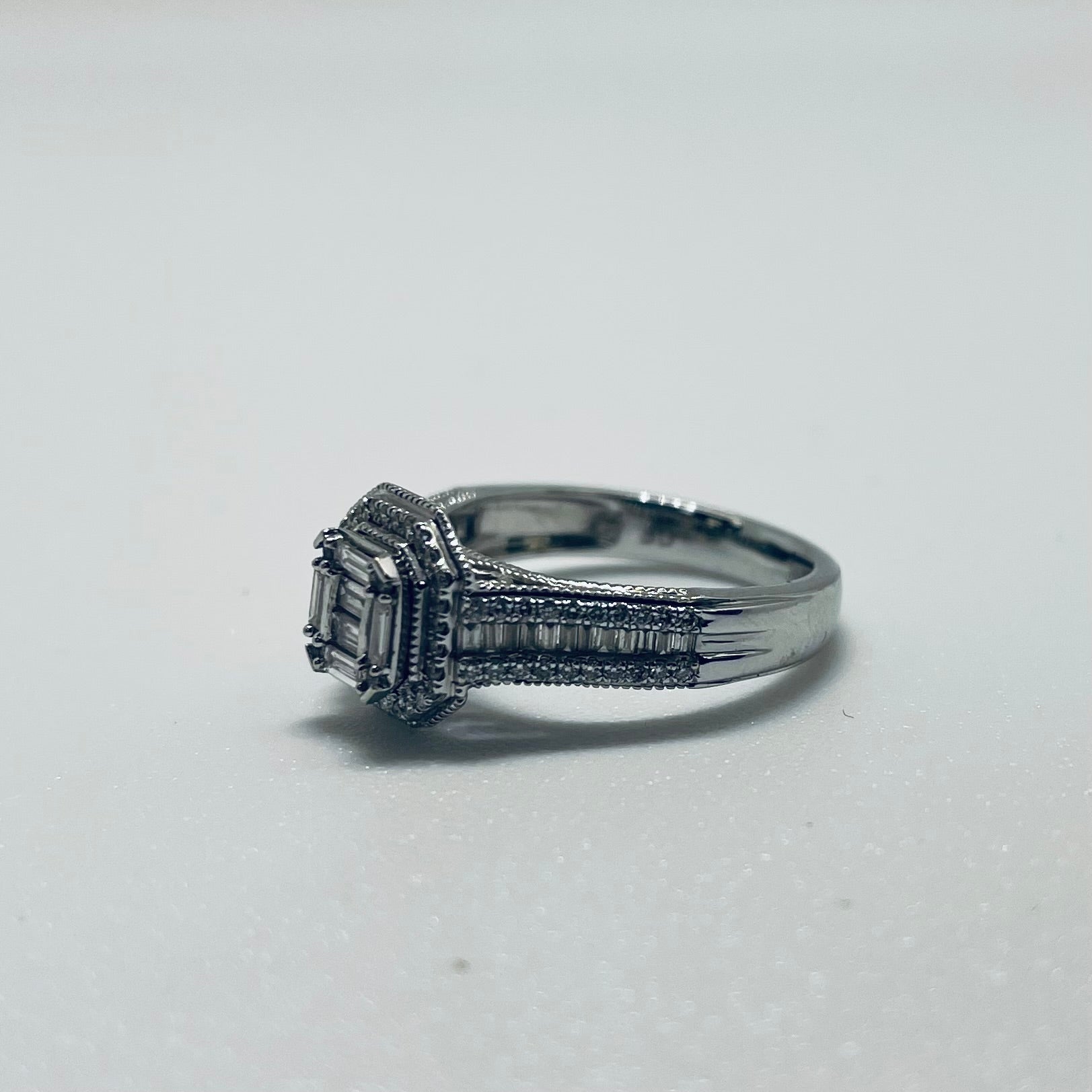 Bague solitaire en or gris 750/1000 (18 carats) ornée de 102 diamants, alliant éclat et élégance. Ce modèle sophistiqué présente 72 brillants totalisant 0,27 ct et 30 baguettes pour 0,35 ct,