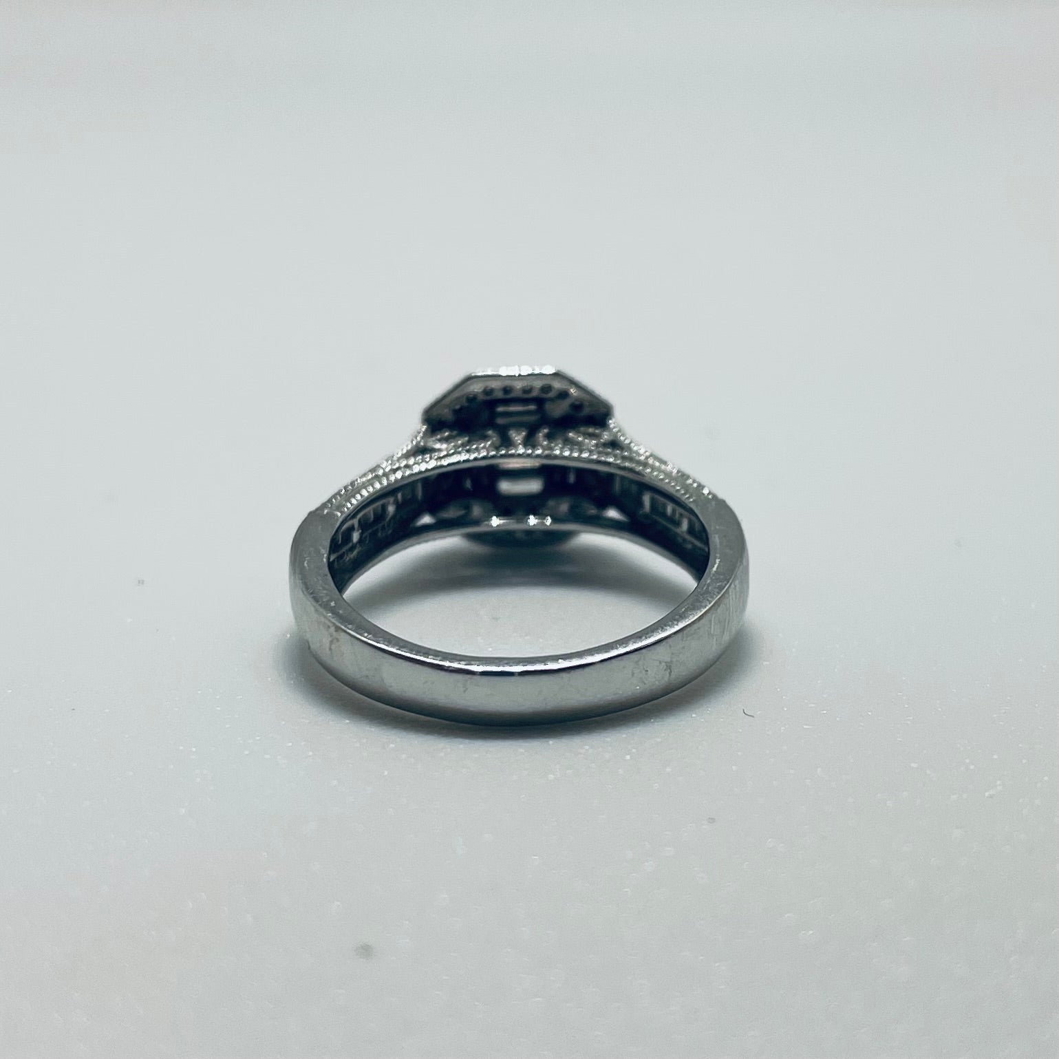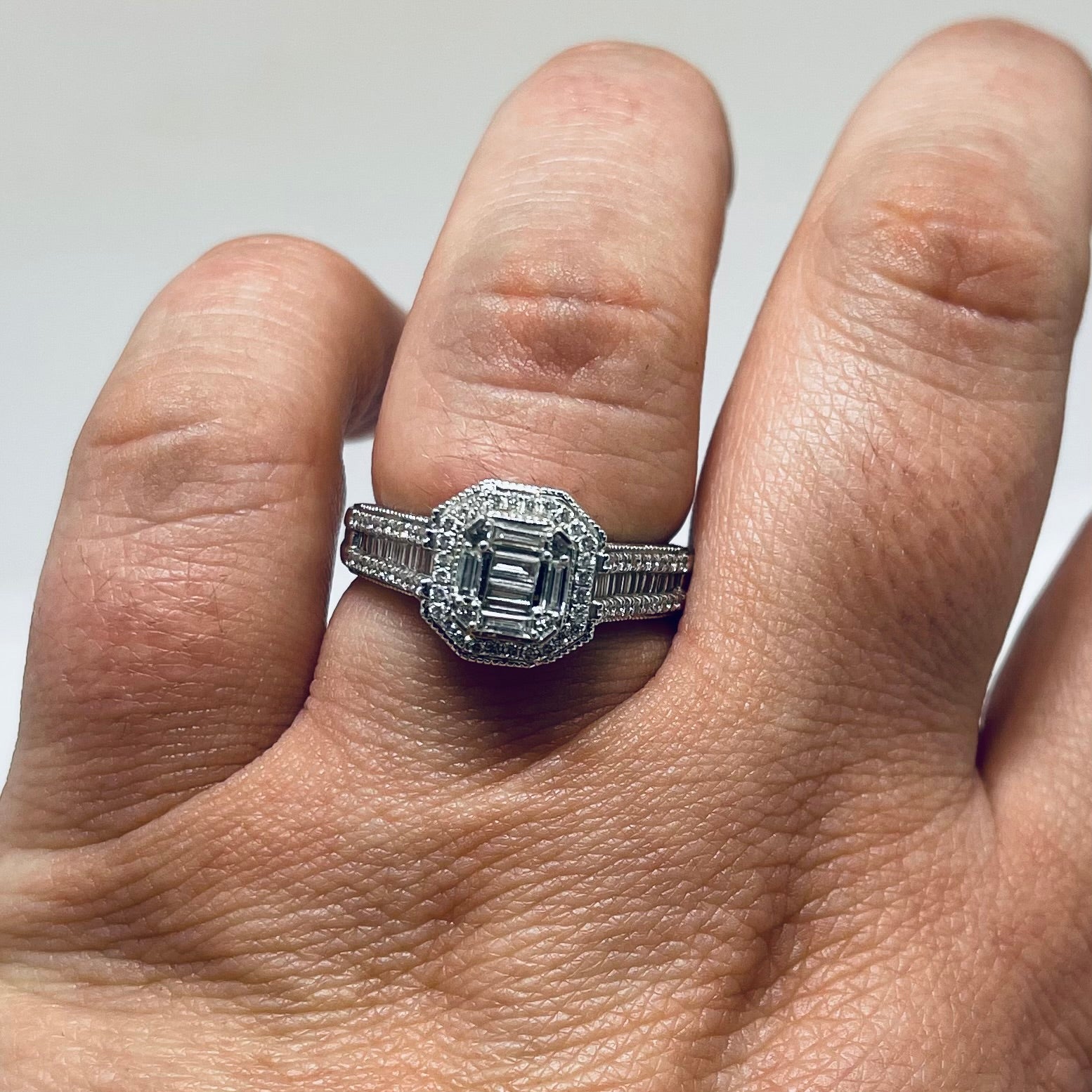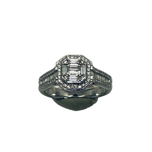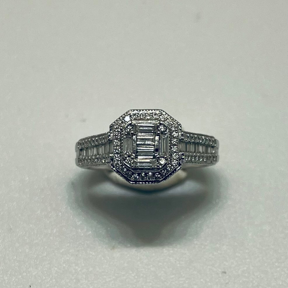 Bague solitaire en or gris 750/1000 (18 carats) ornée de 102 diamants, alliant éclat et élégance. Ce modèle sophistiqué présente 72 brillants totalisant 0,27 ct et 30 baguettes pour 0,35 ct,