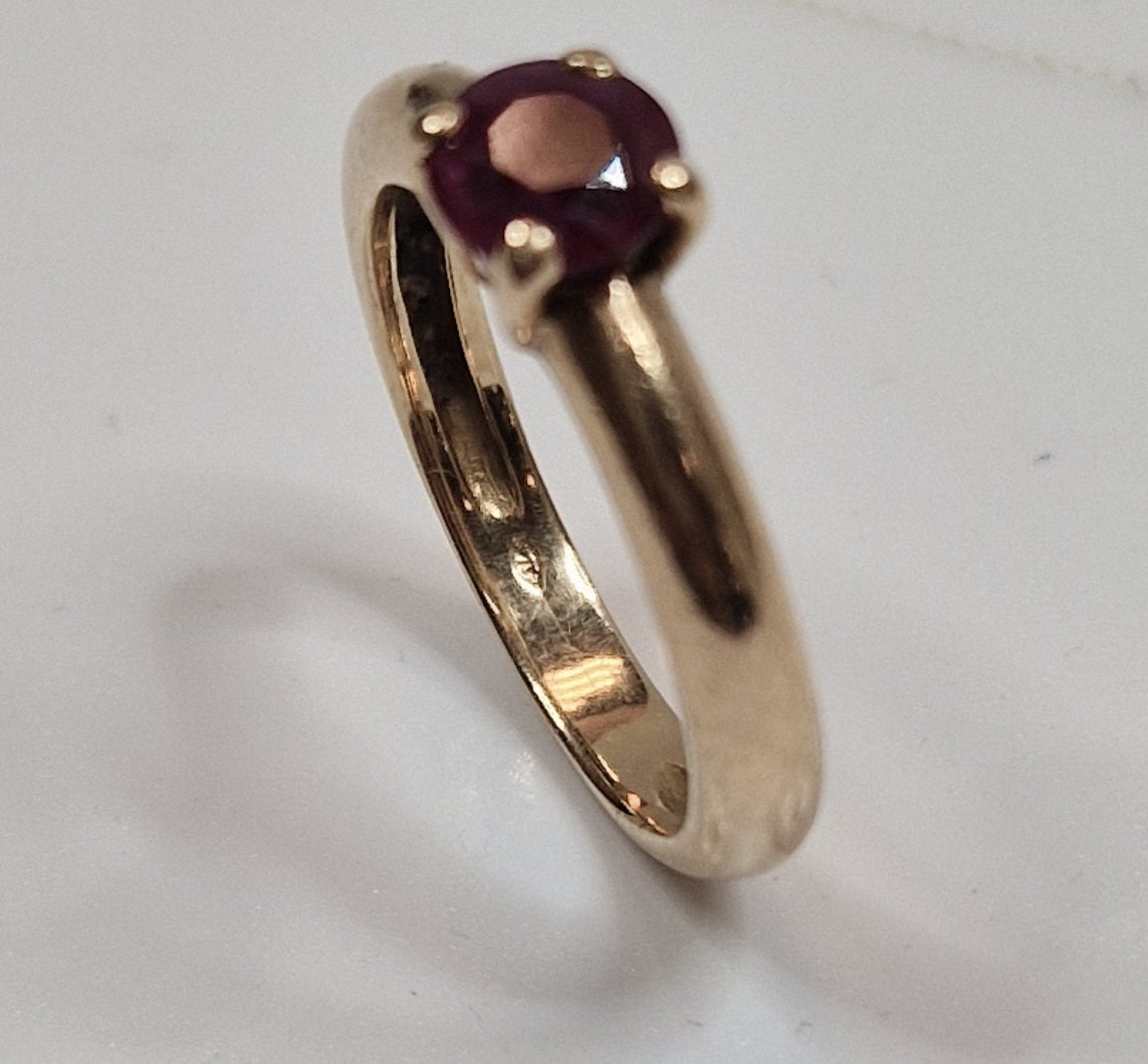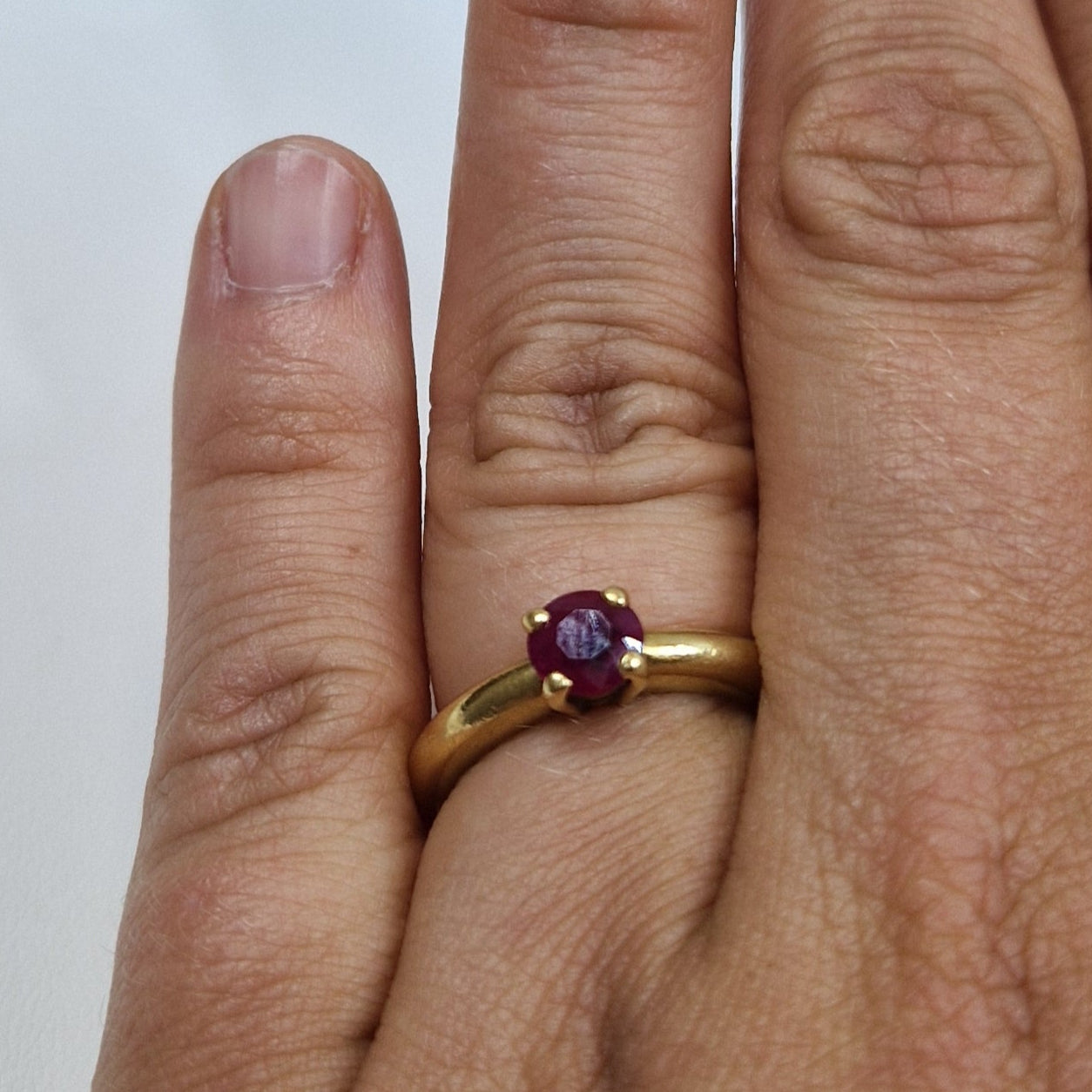 Bague solitaire en or jaune 18 carats (750/1000), poinçonnée 750. Poids : 4,88 g. Taille : 54. Ornée d’un rubis rouge. Bon état.