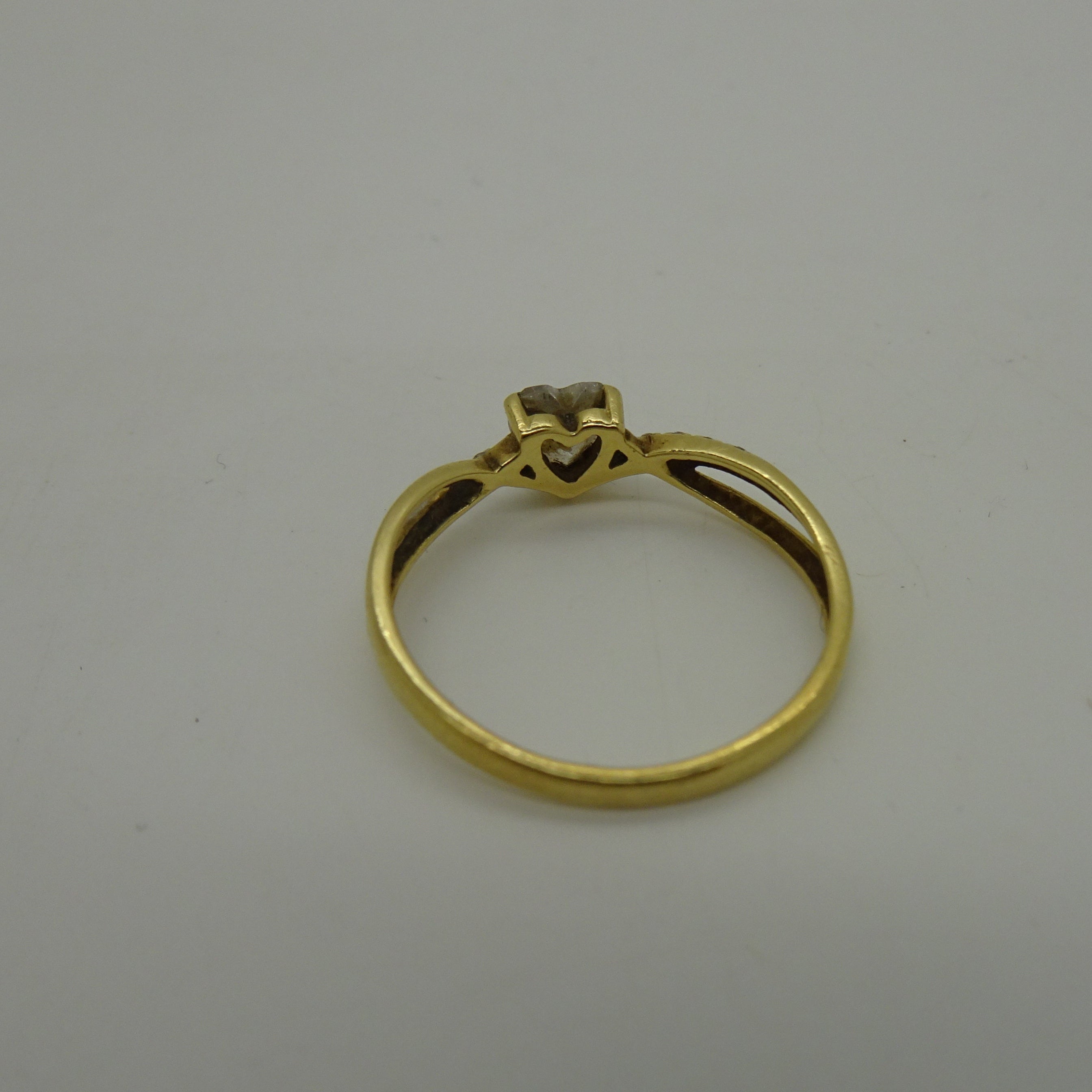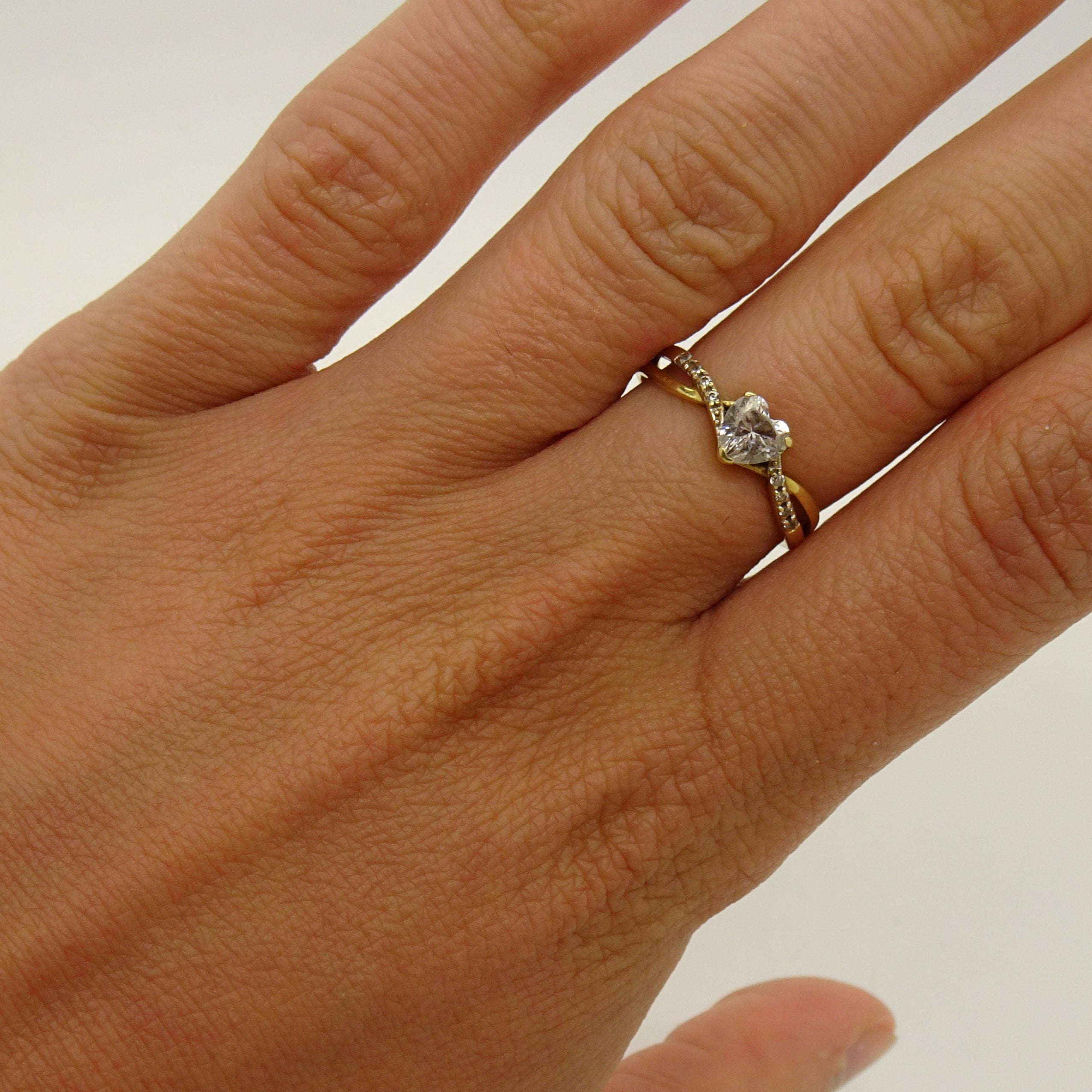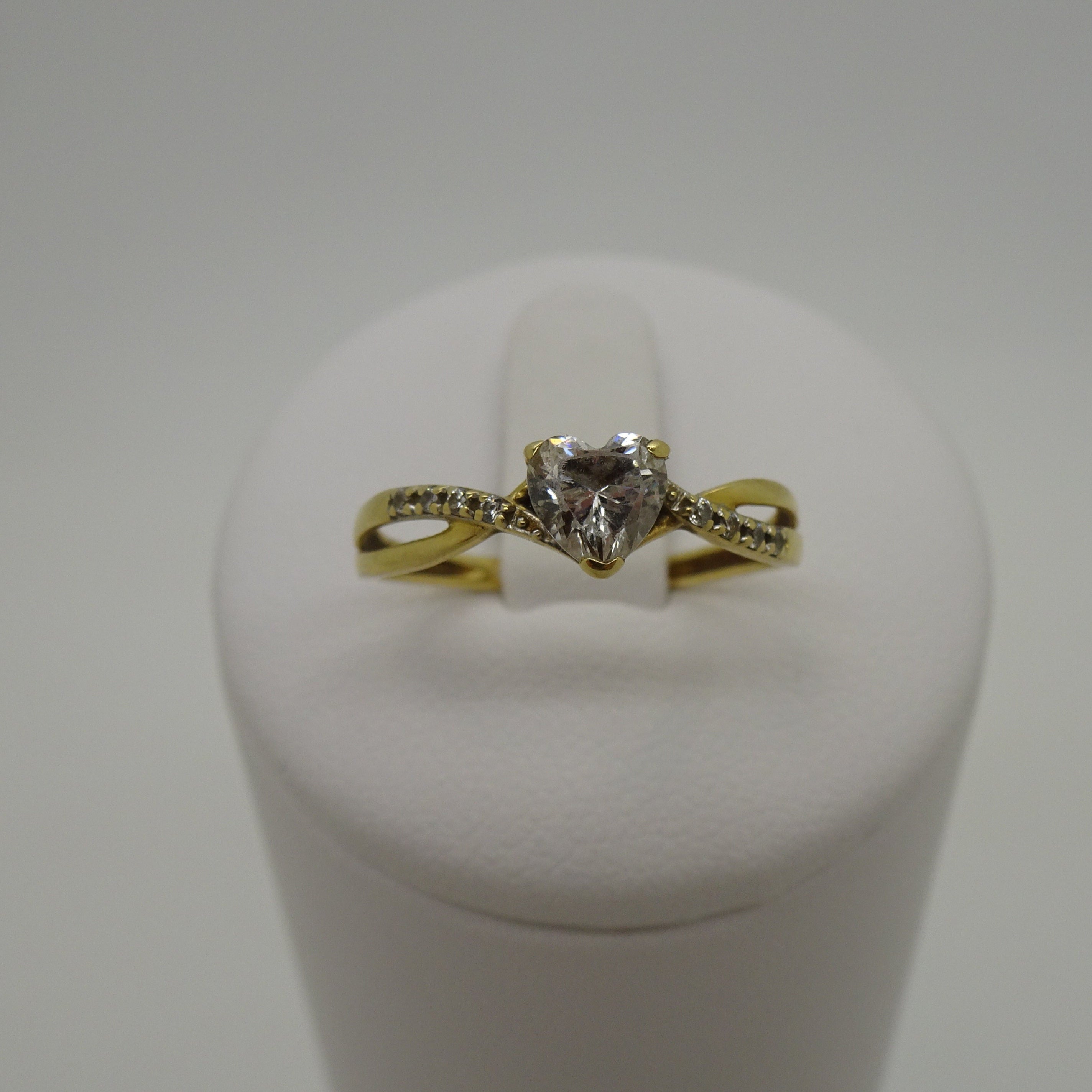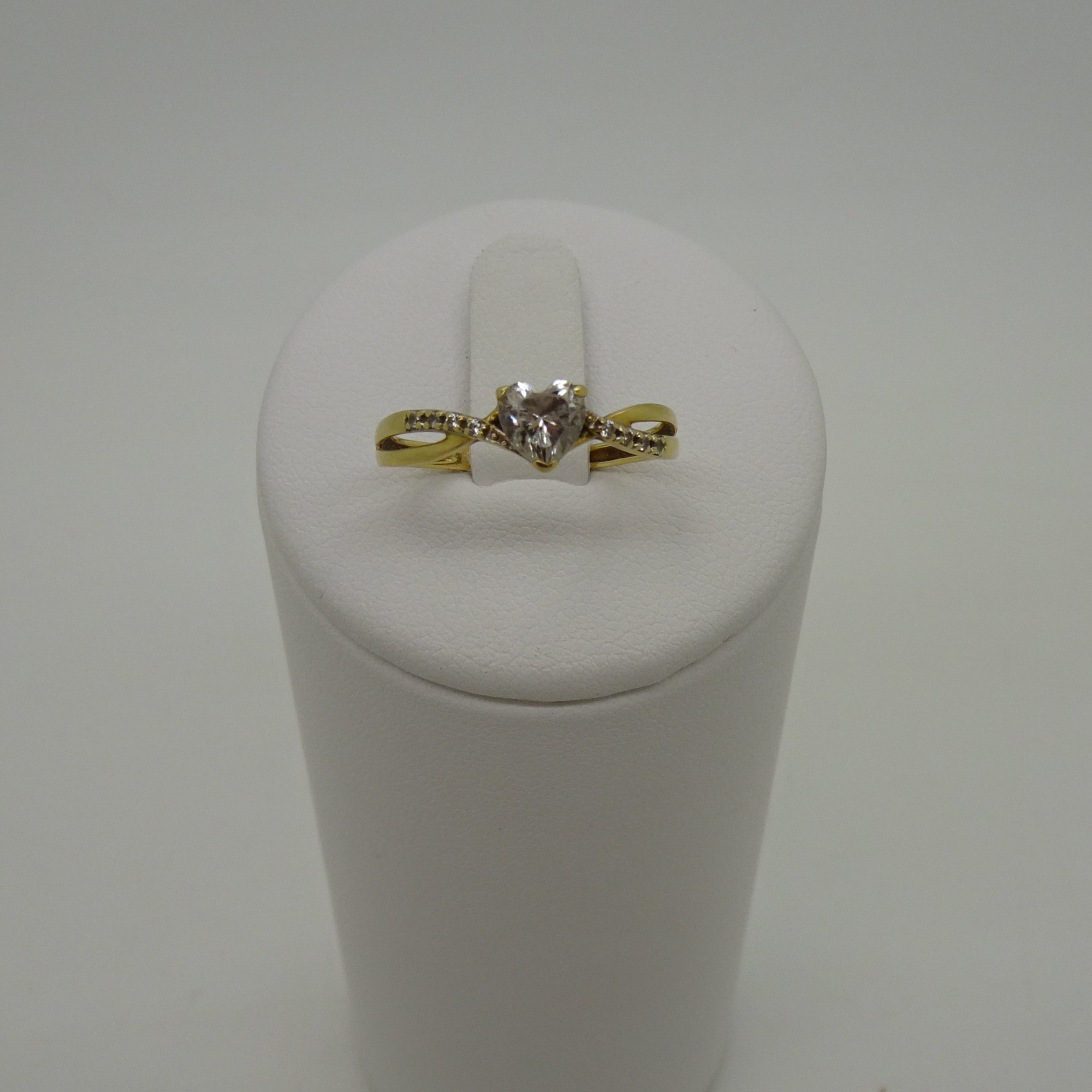 Bague empierrée en or jaune 18 carats (750/1000), poinçonnée 750. Elle pèse 1,69 gramme et est de taille 54. Le modèle est orné d’une pierre centrale accompagnée de 8 éclats d’oxyde de zirconium taillés en brillant. L’ensemble est en très bon état.