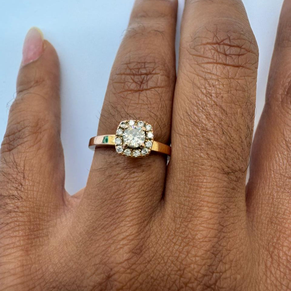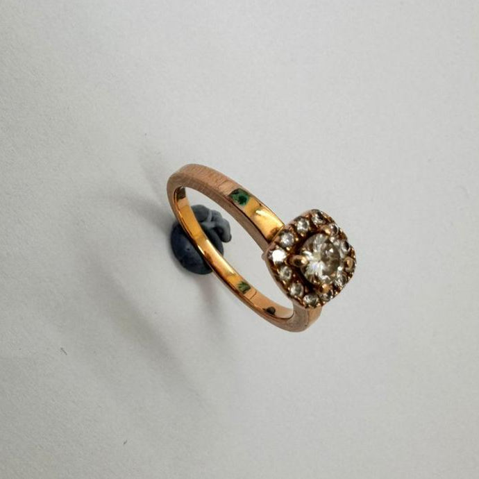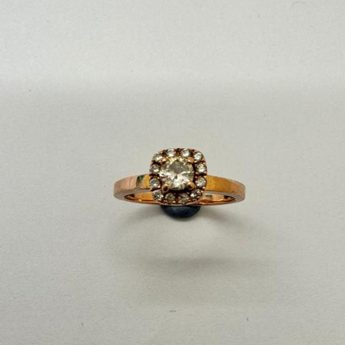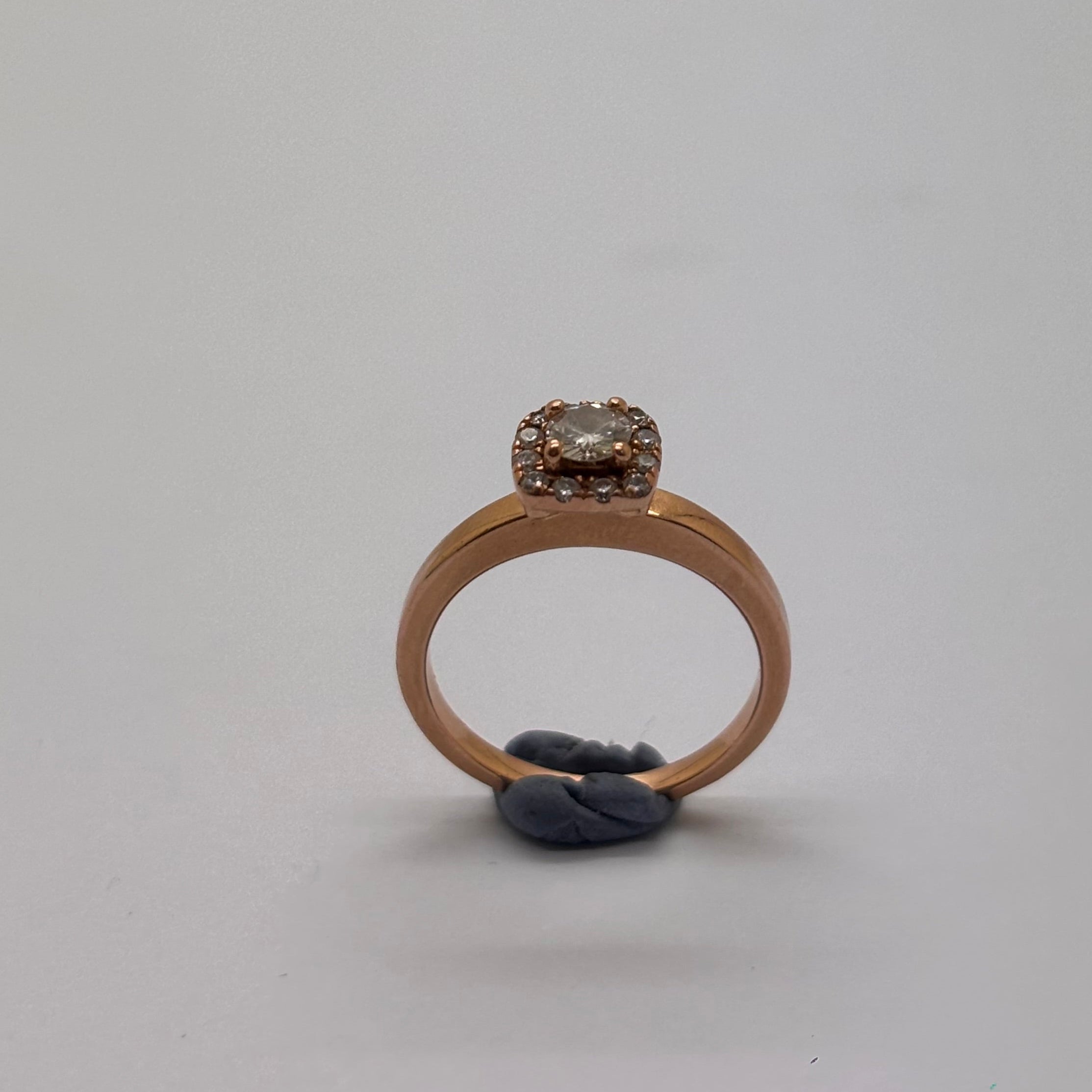 Bague solitaire en or rose 18 carats (750/1000), poinçonnée à la tête d’aigle, se distingue par son élégance classique. Elle est ornée de 12 petits diamants entourant un diamant central plus imposant. D’un poids de 3,53 grammes, elle est proposée en taille 50 et se présente en bon état général.
