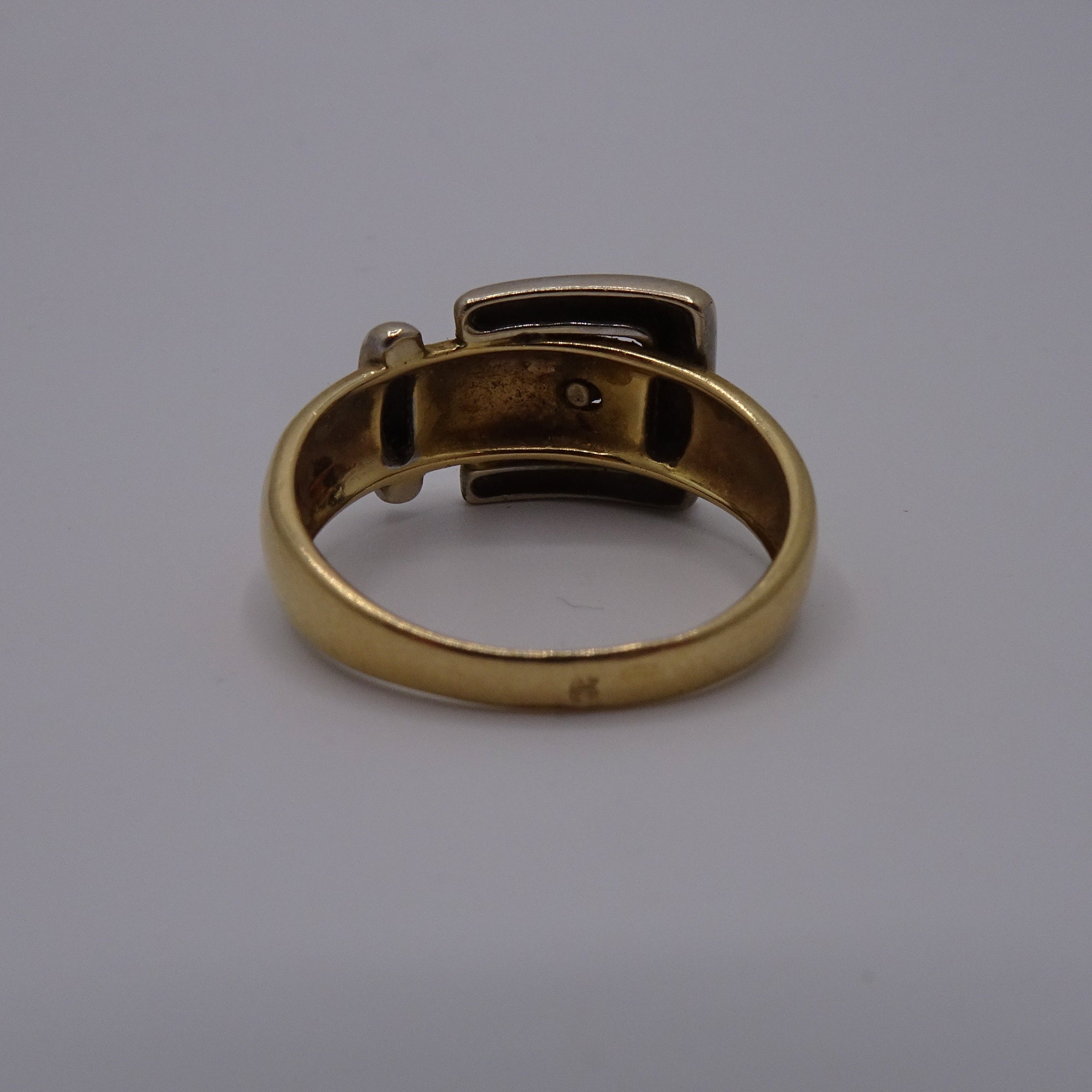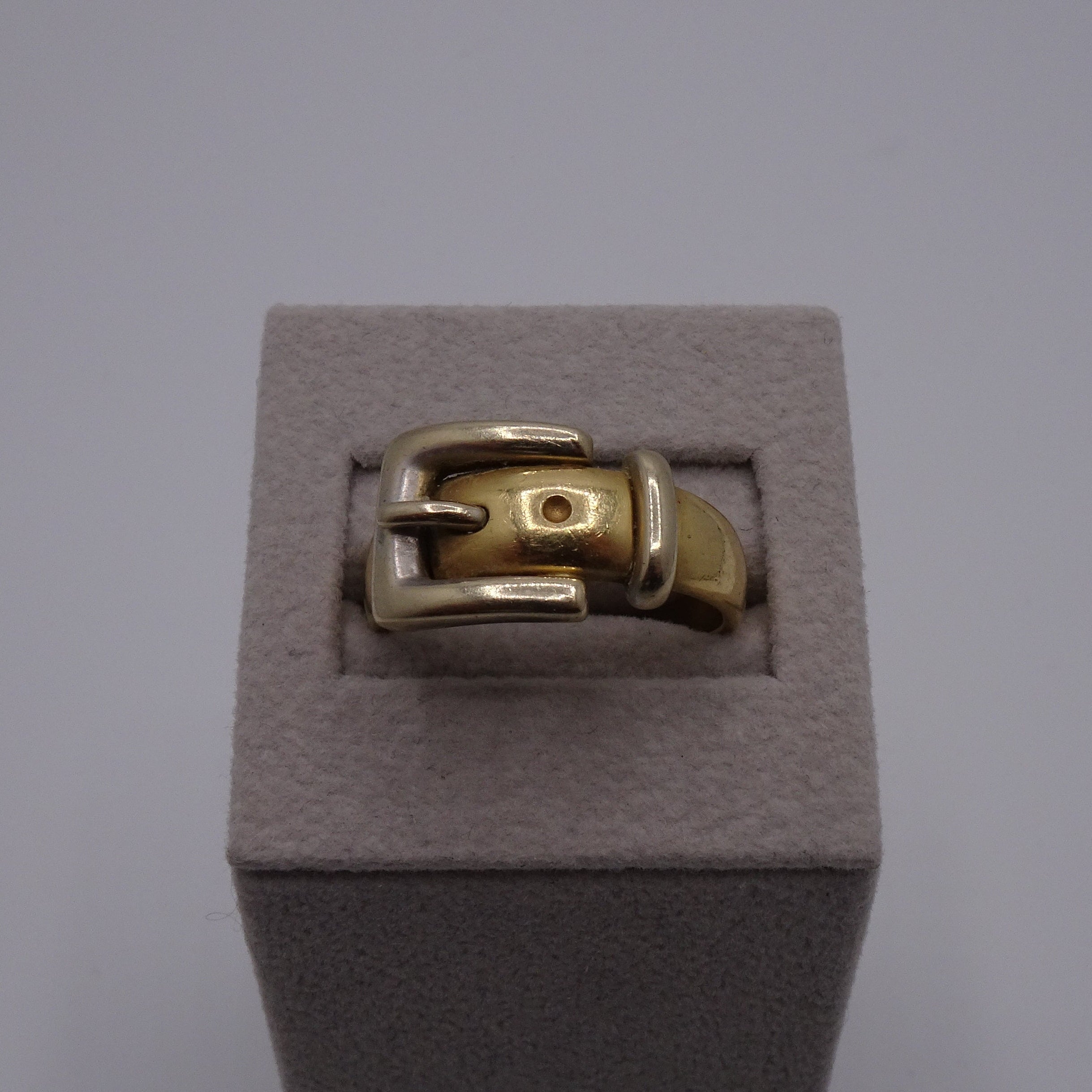 Bague Tank en or jaune et gris 750/1000, poinçon Tête d’Aigle. Poids 5.17 g, taille 59, en très bon état. Un bijou au style rétro et affirmé. Ce bijou sera livré dans un écrin avec son certificat d'authenticité