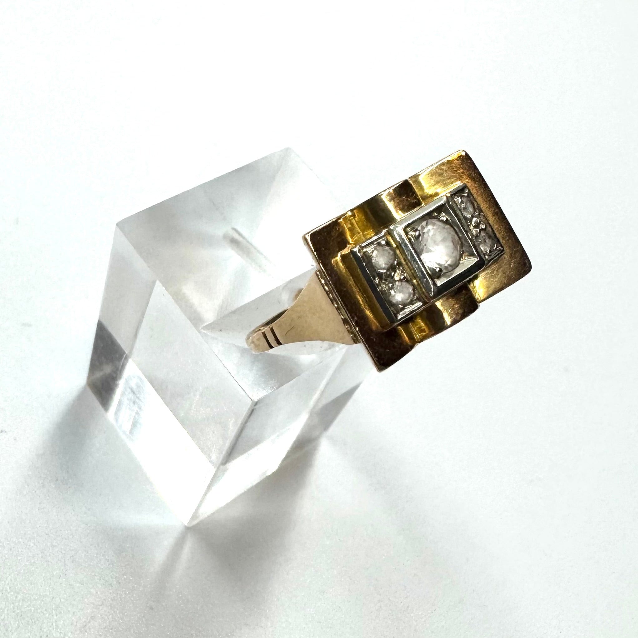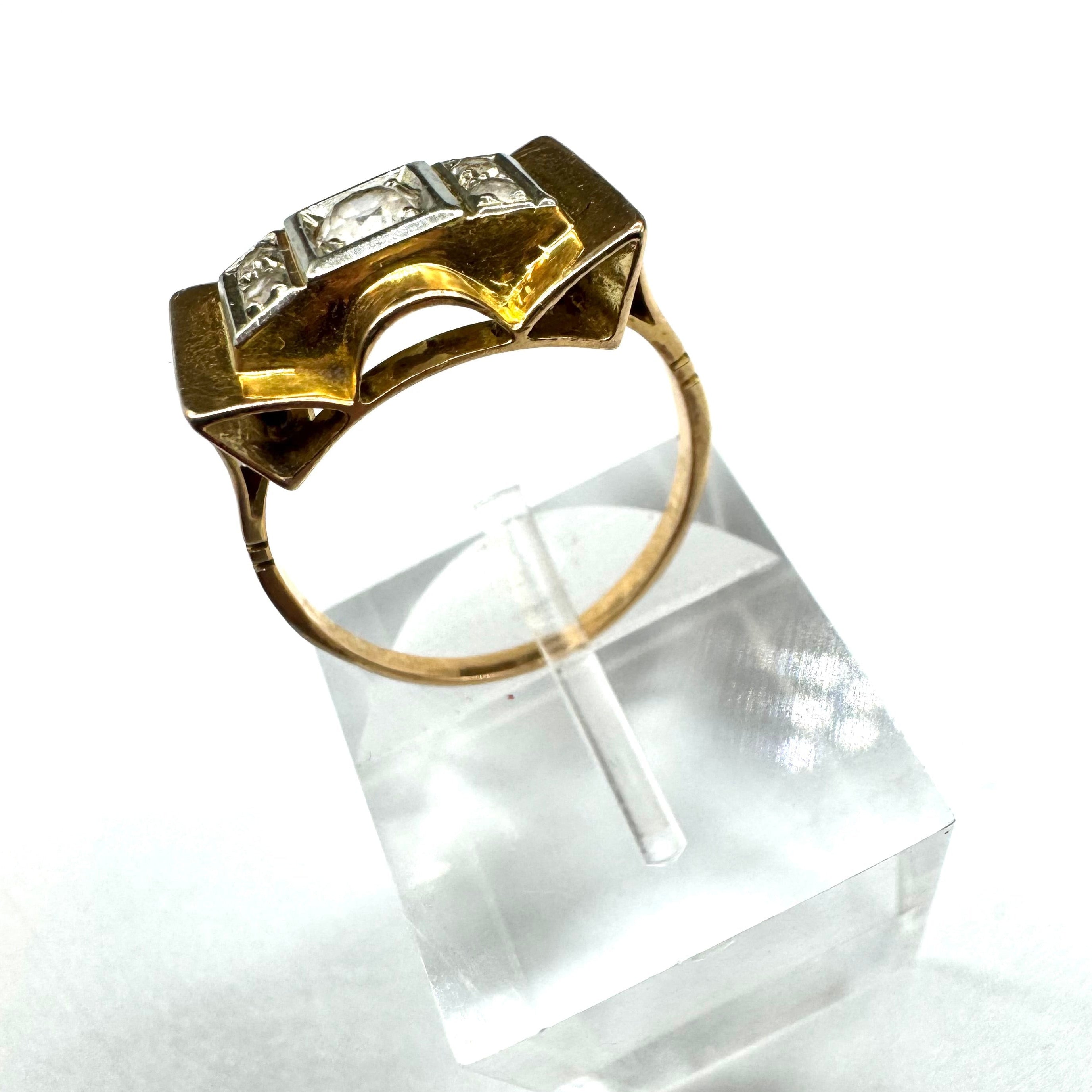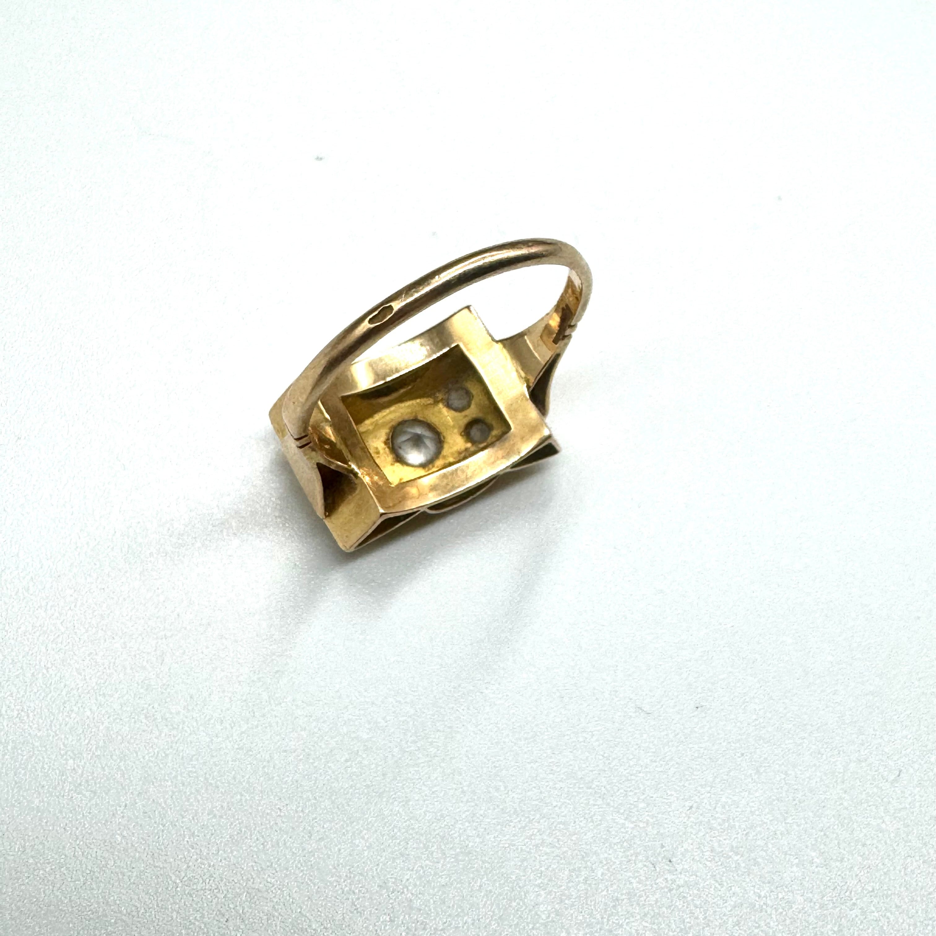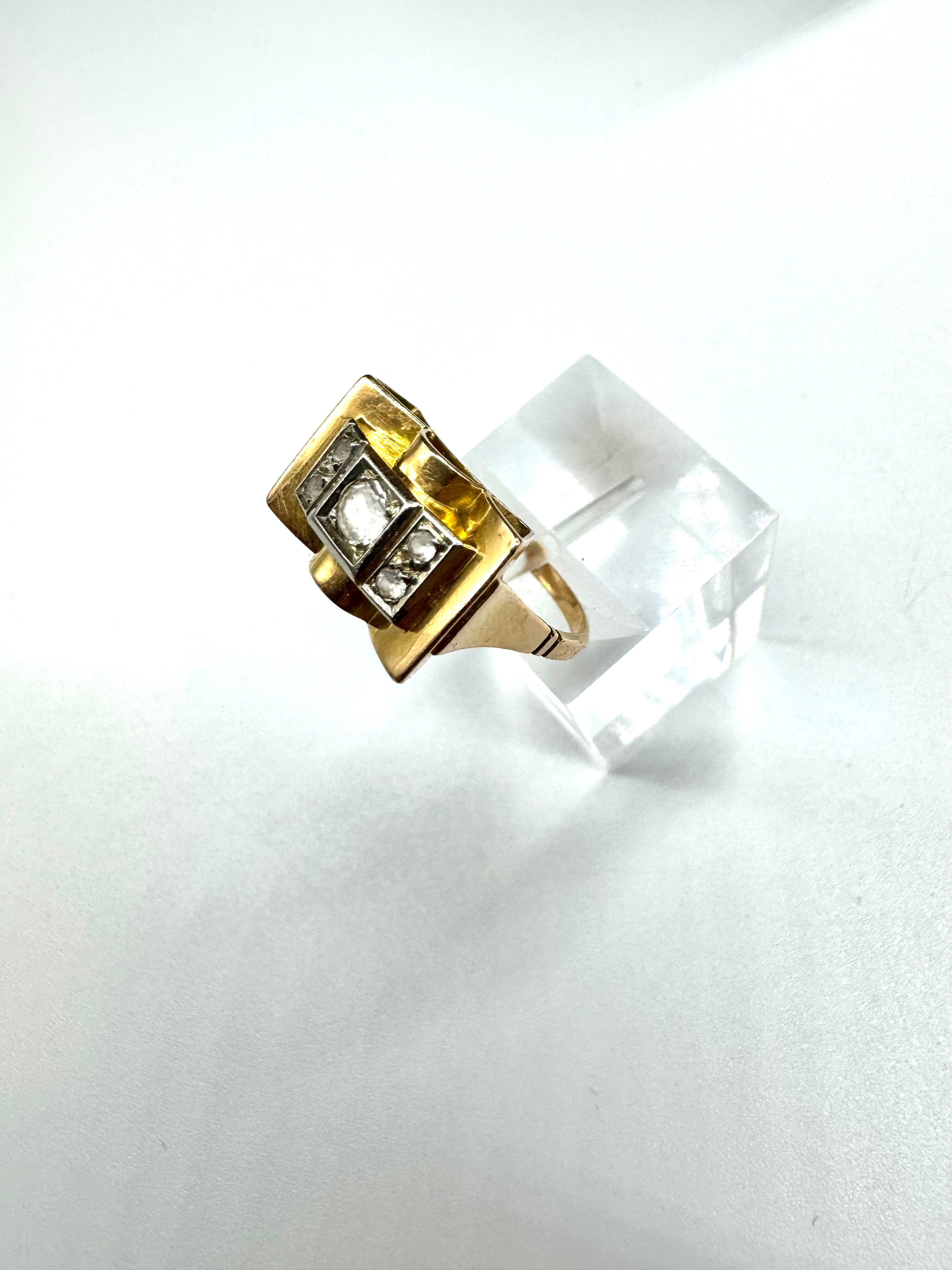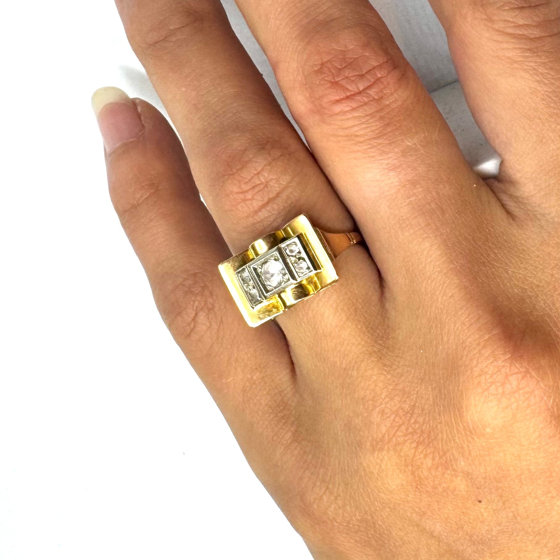 Bague « Tank » en or jaune 18 carats (750/1000), poinçonnée tête d’aigle. Monture raffinée de style Tank, sertie de 5 oxydes de zirconium, poids 3,60 g, taille 54. En bon état.