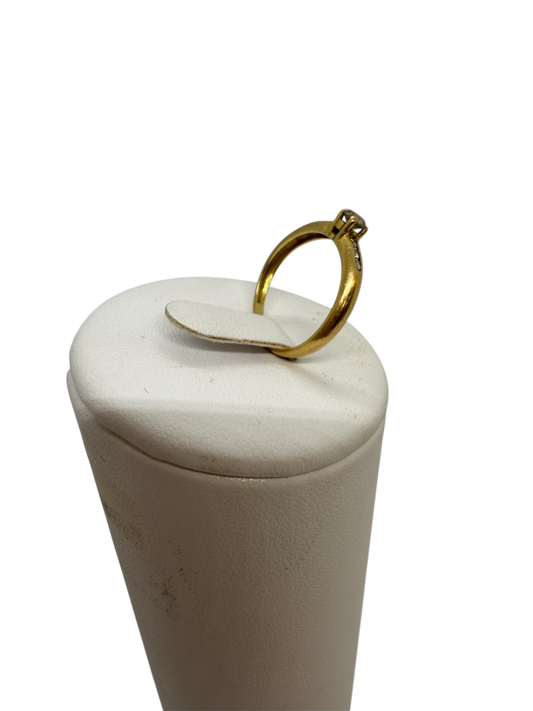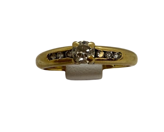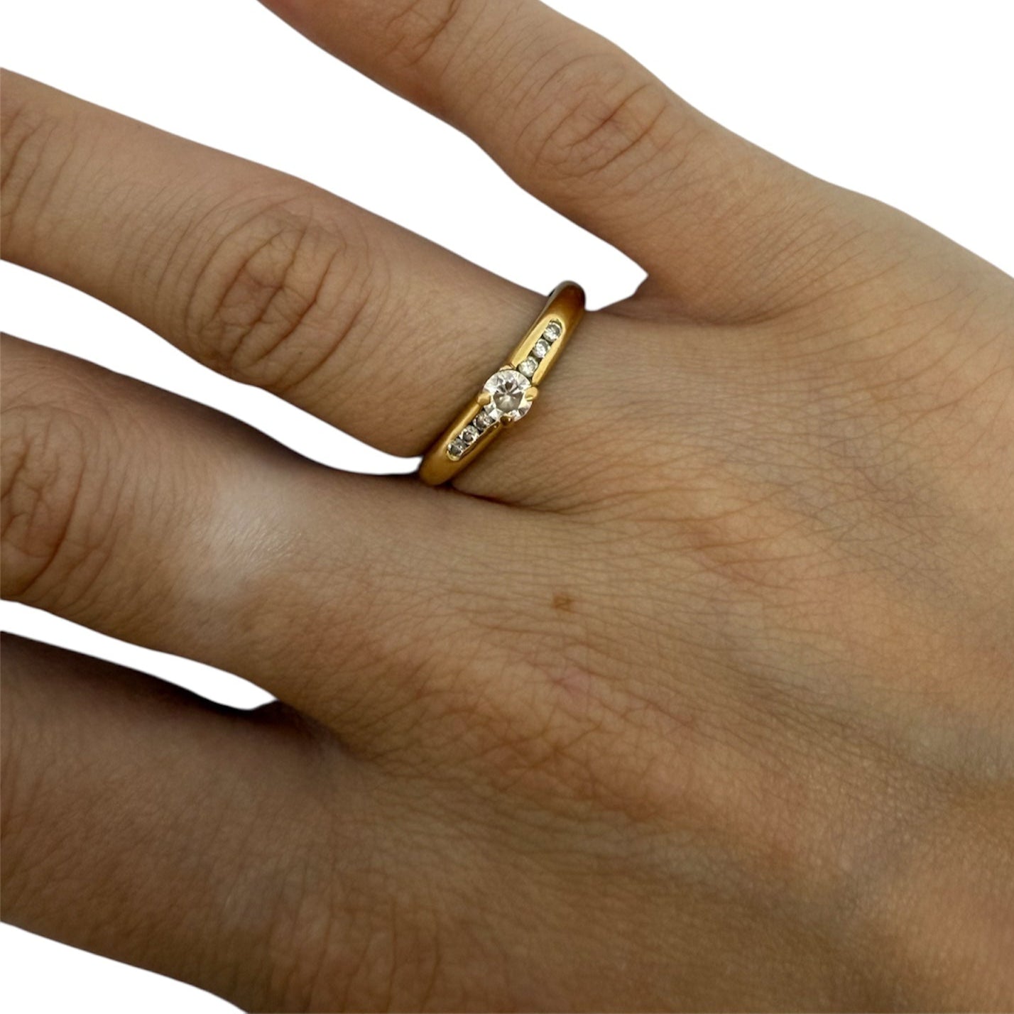 Bague alliance empierrée en or jaune 18 carats (750/1000), bien que sans poinçon, est en très bon état. Elle est sertie d’un diamant central de 0,15 carat accompagné de six diamants de 0,02 carat chacun, offrant un bel éclat tout en finesse. Avec un poids de 2,02 grammes et une taille 51.