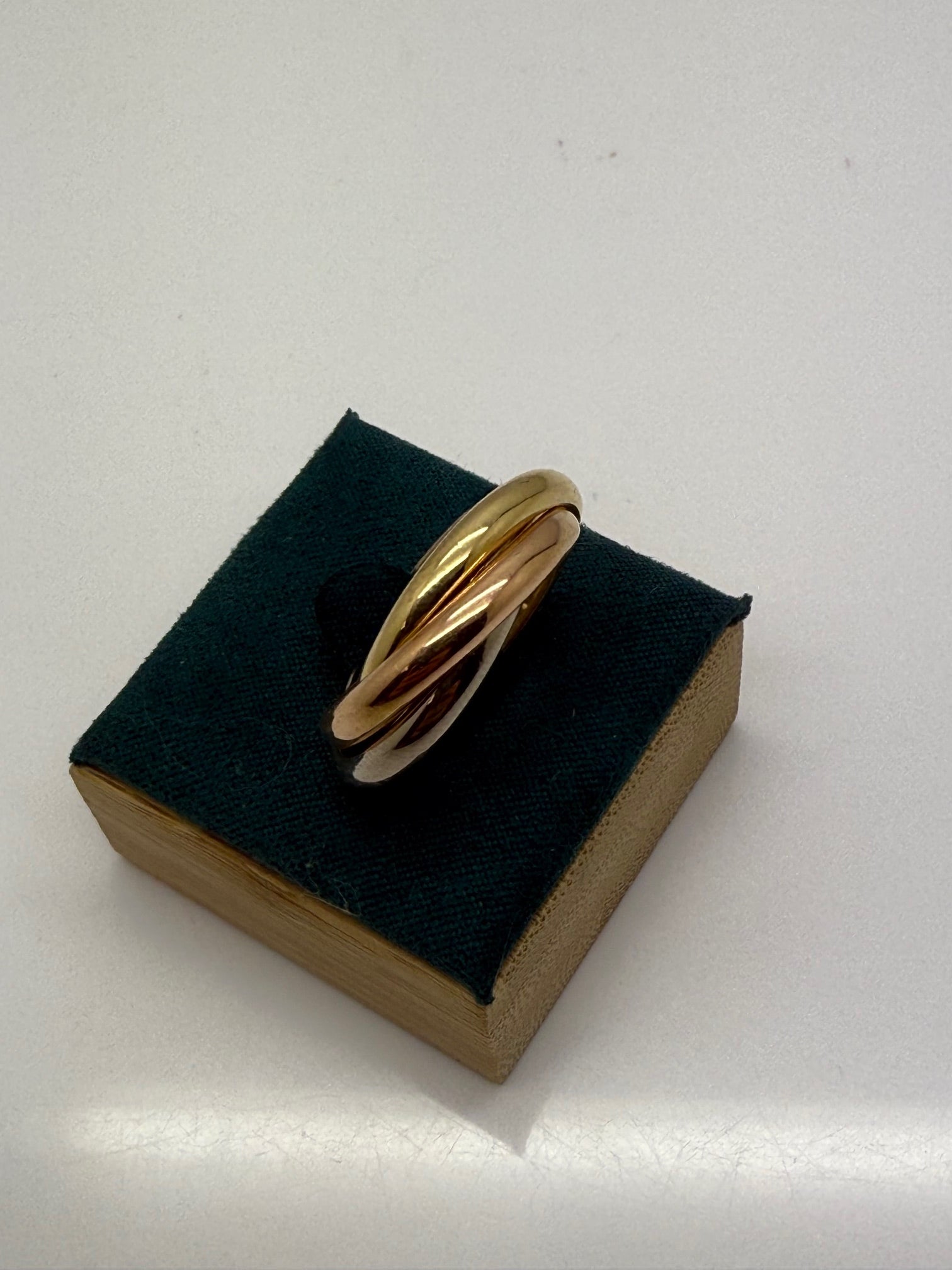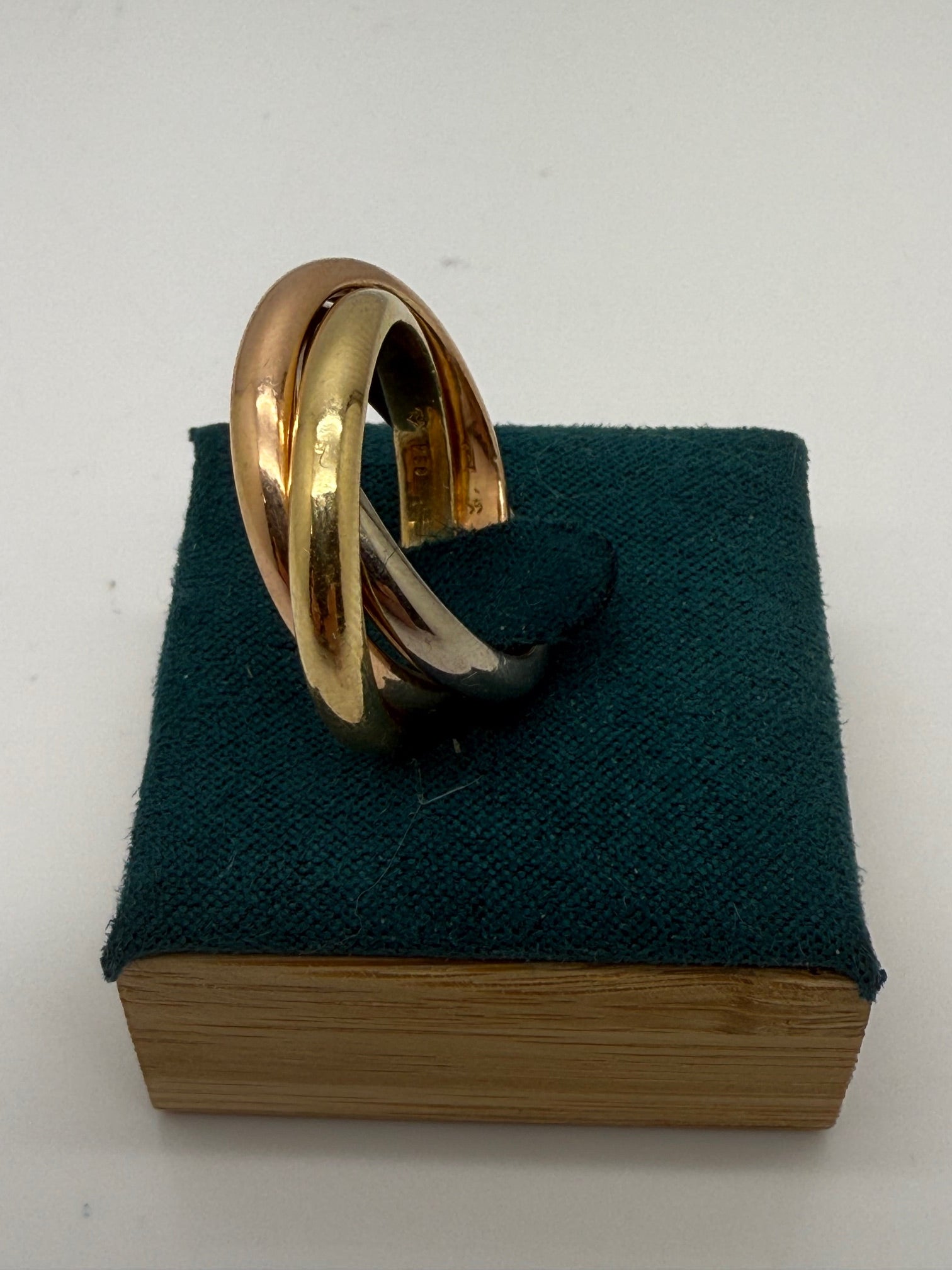 Alliance en or 18 carats (750/1000), composée de trois ors : jaune, rose et blanc. Un design intemporel et élégant, sans pierres. Elle est en taille 52 et pèse 14,33 grammes. Poinçonnée 750 et en très bon état, cette bague convient aussi bien pour une occasion spéciale que pour un port quotidien.