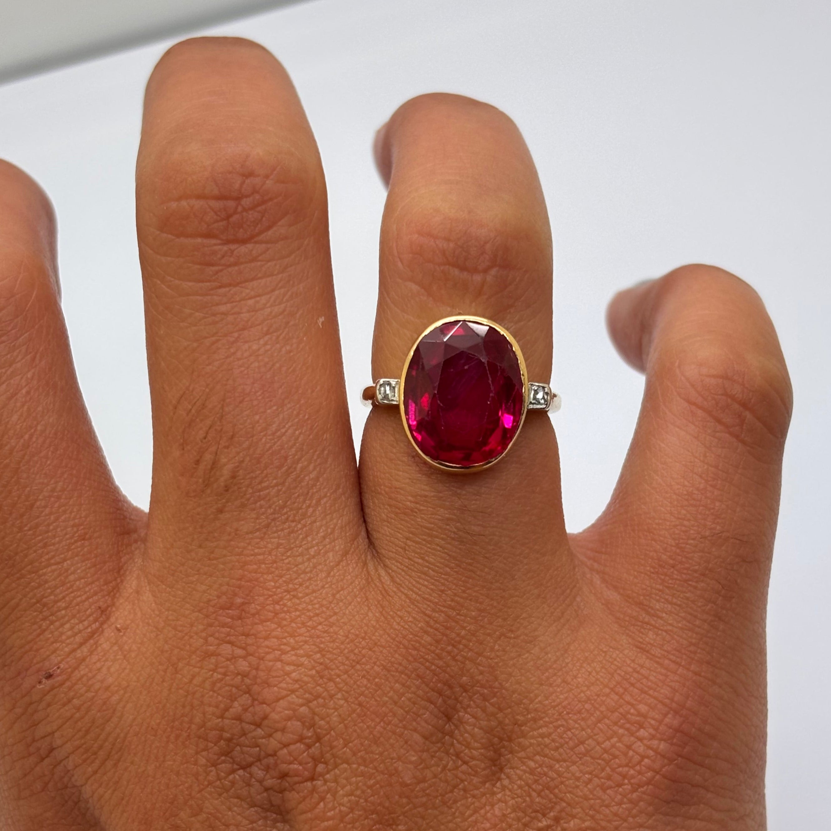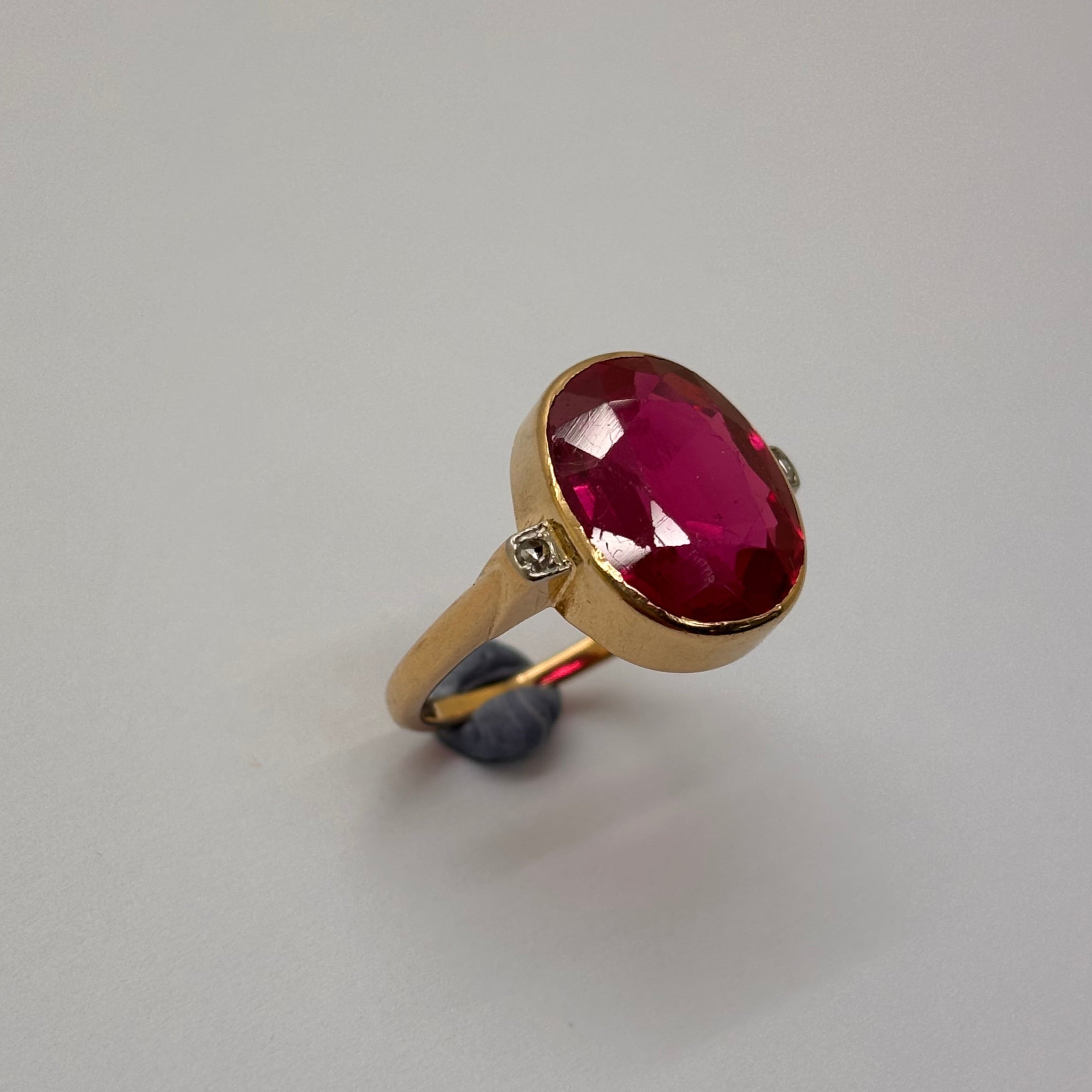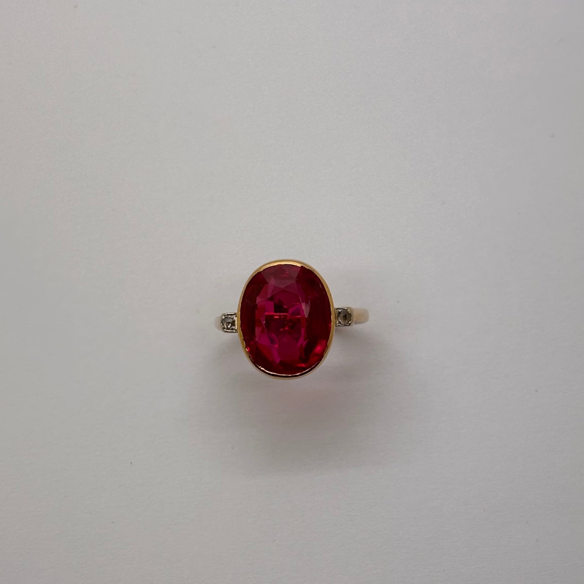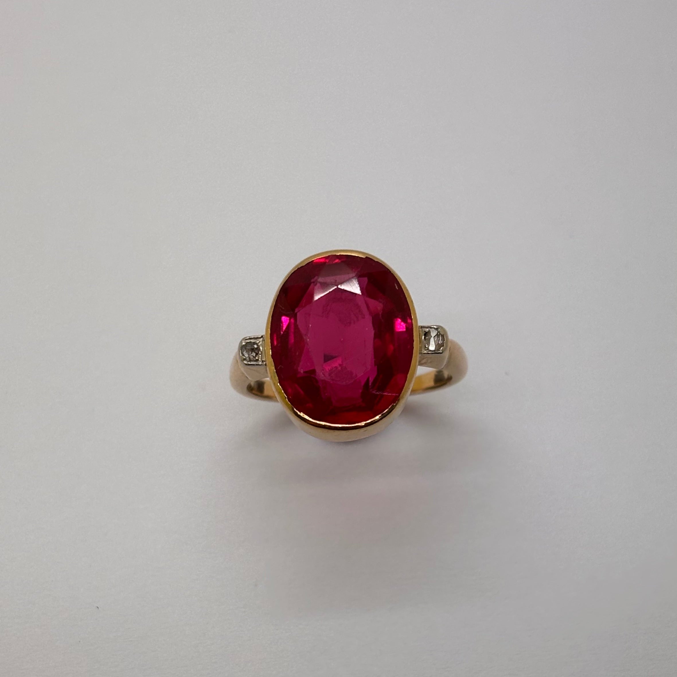 Charmante bague ancienne en or jaune 18 carats (750/1000), ornée d’un saphir central de belle taille encadré par deux petits diamants. Avec un poids de 4,82 grammes et une taille 50, cette pièce au style classique et raffiné est en bon état, idéale pour les amateurs de bijoux anciens à caractère.