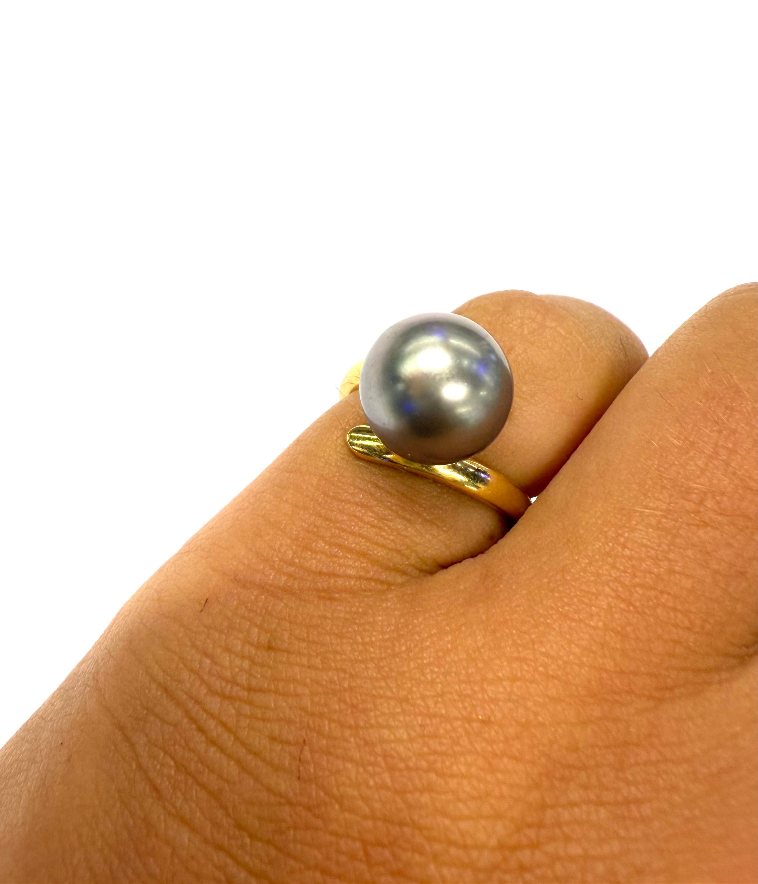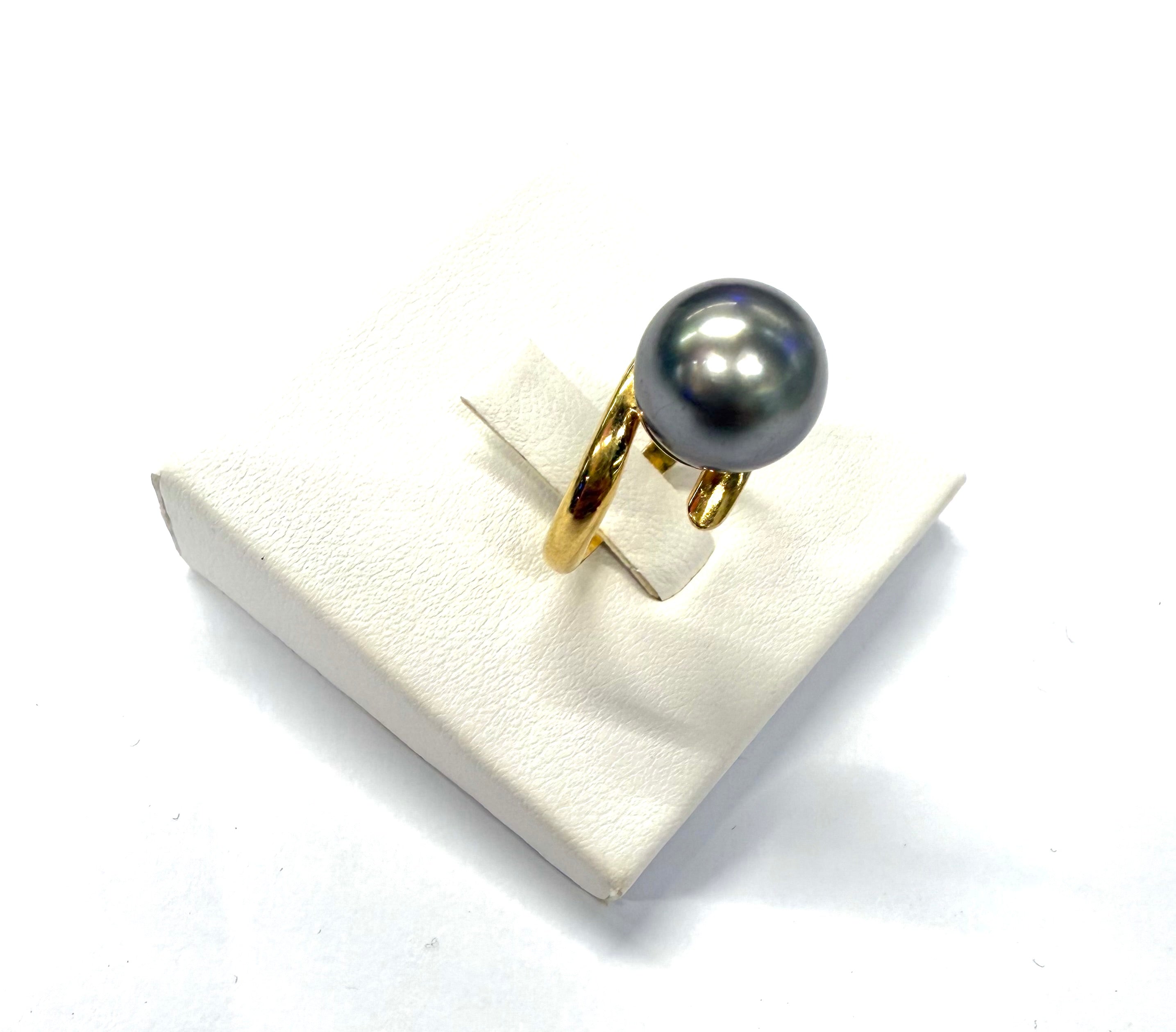 Élégante bague en or jaune 18 carats (750/1000), poinçonnée 18K, ornée d'une perle de Tahiti d'environ 1 cm de diamètre. D'un poids de 4,46 g et de taille 48, elle allie raffinement et exotisme. Très bon état.