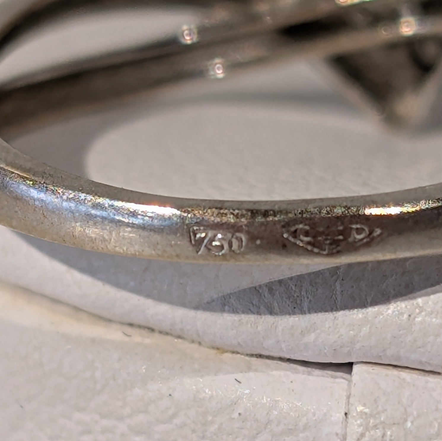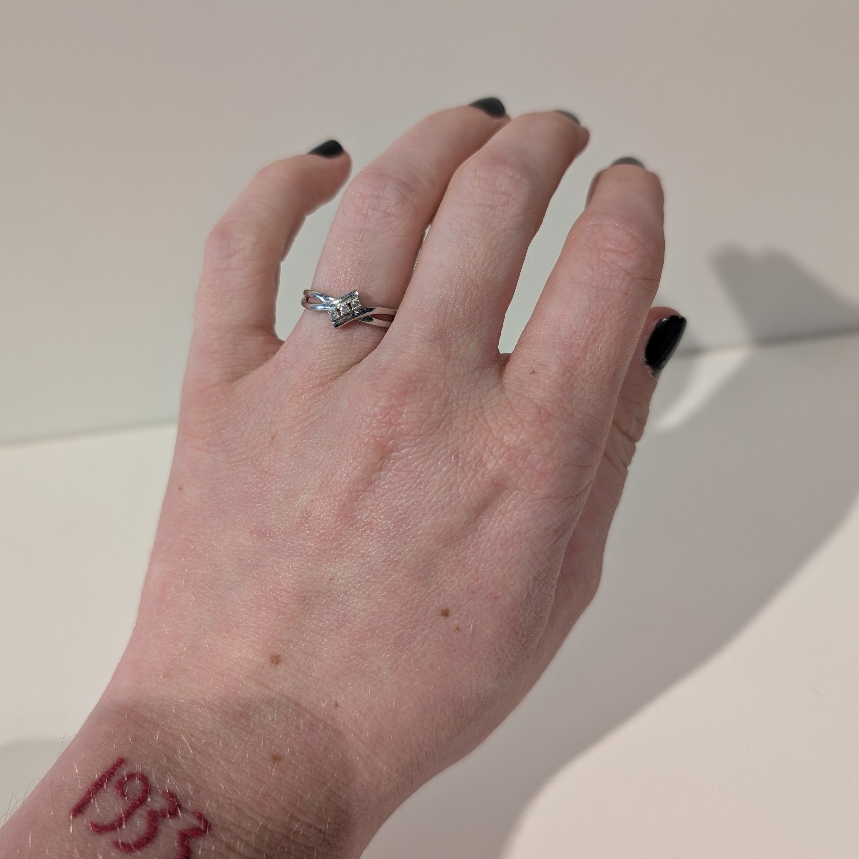 Ravissante bague de fiançailles en or blanc 18 carats (750/1000), poinçonnée 750, incarne la délicatesse et l’élégance. Avec un poids de 1,53 gramme et une taille 50, elle est à la fois fine et raffinée. Son sertissage de trois diamants de 0,02 carat apporte une touche de brillance subtile.