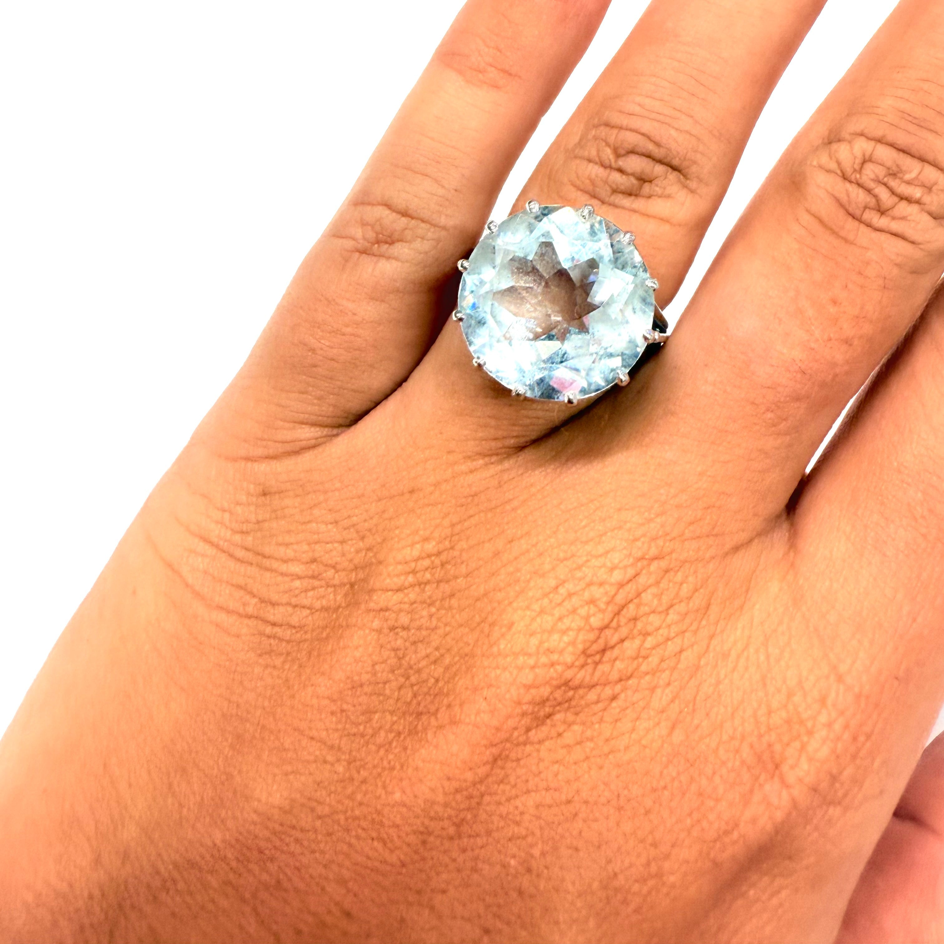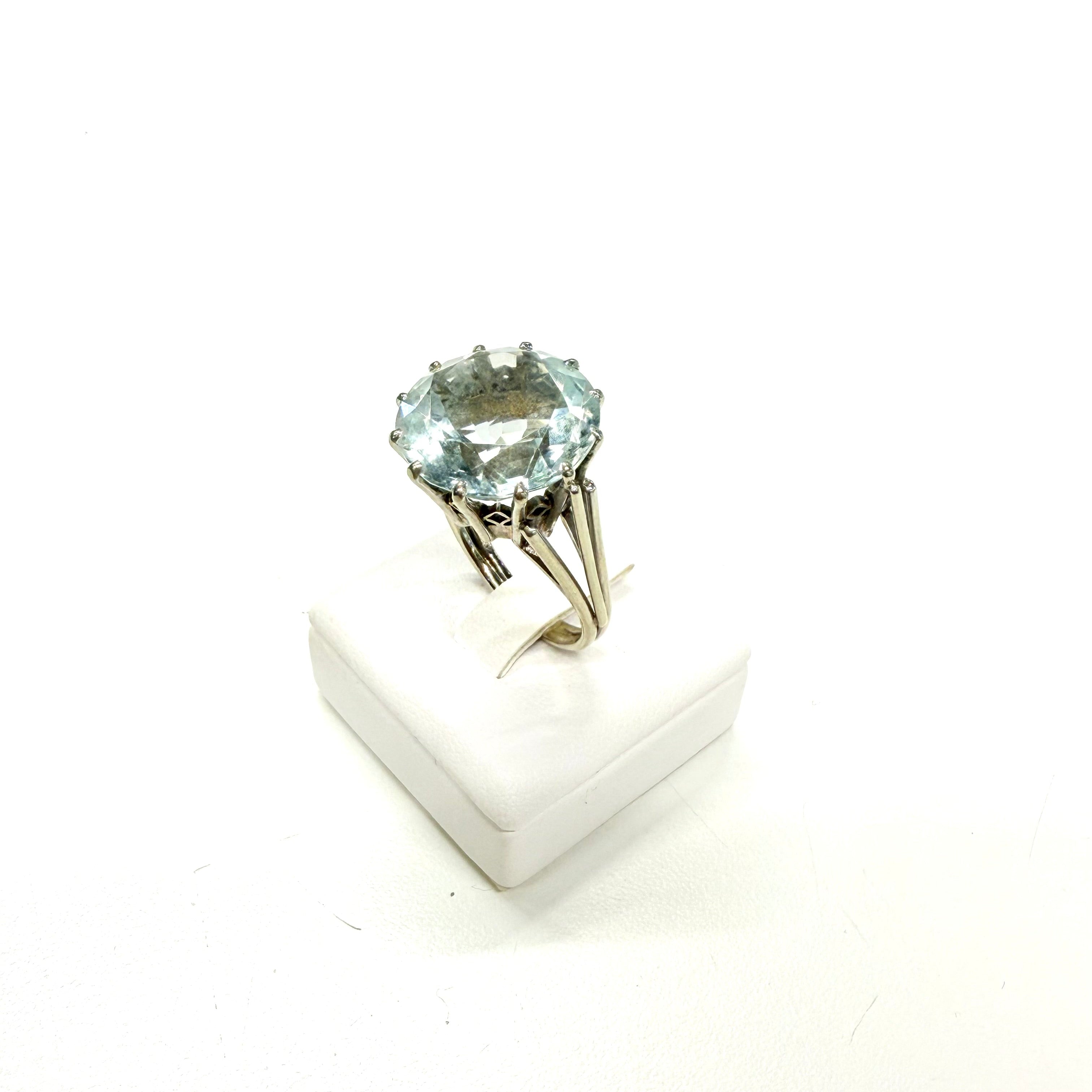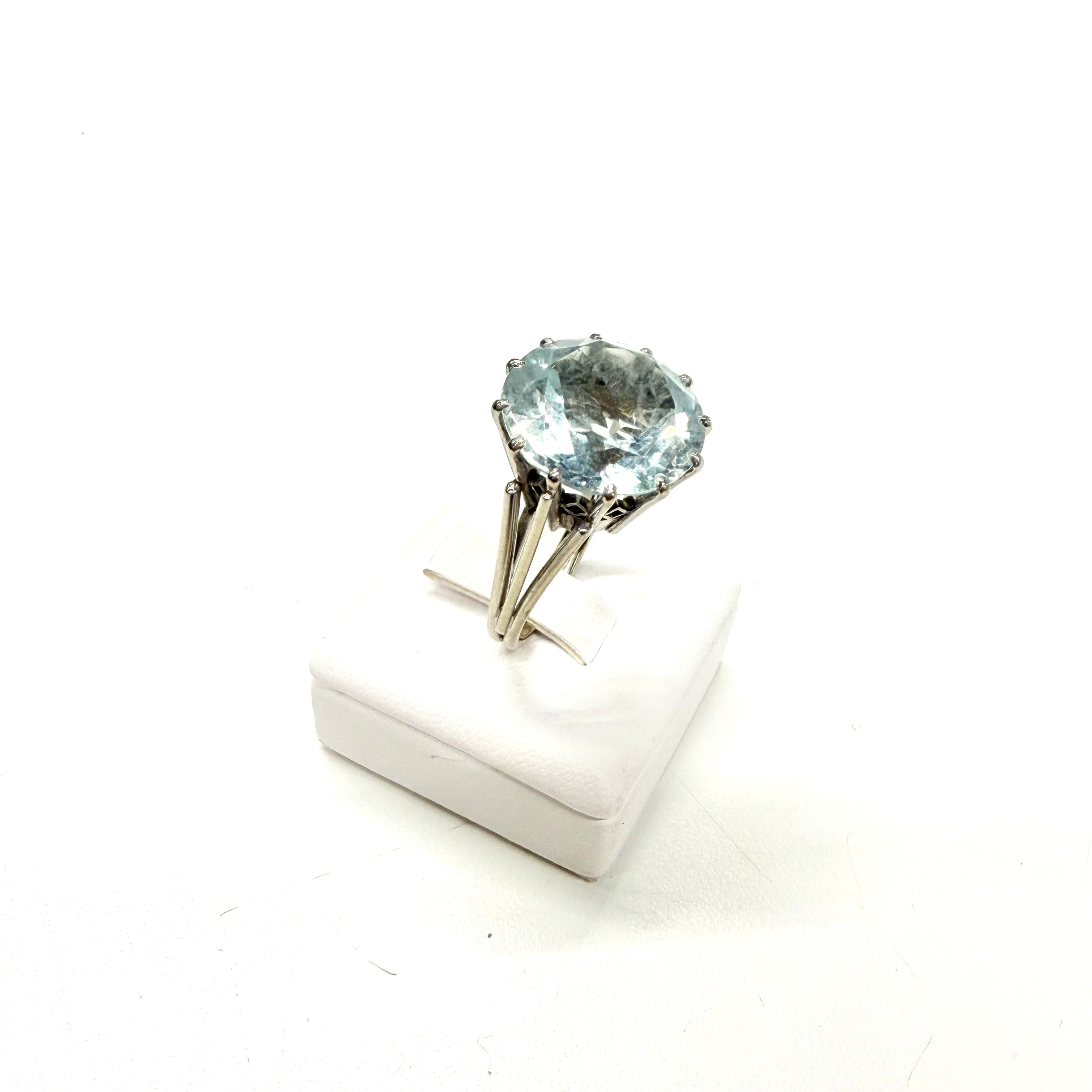 Bague empierrée en or gris 18 carats (750/1000), poinçonnée avec une tête d’aigle. Elle pèse 9,15 grammes et est proposée en taille 54. Le bijou est serti d’une aigue-marine de 1,6 cm, qui apporte une touche élégante et colorée. La bague est en très bon état.