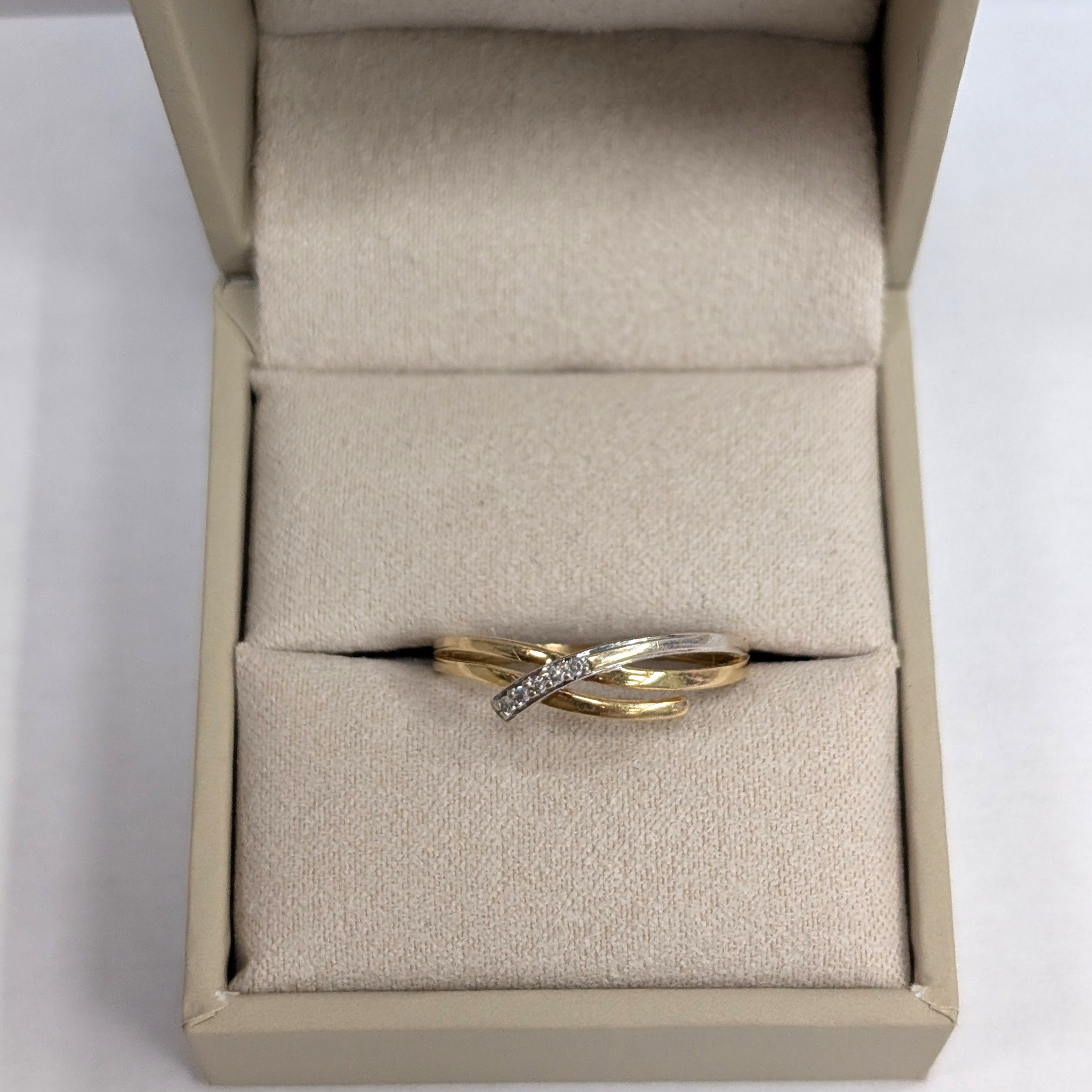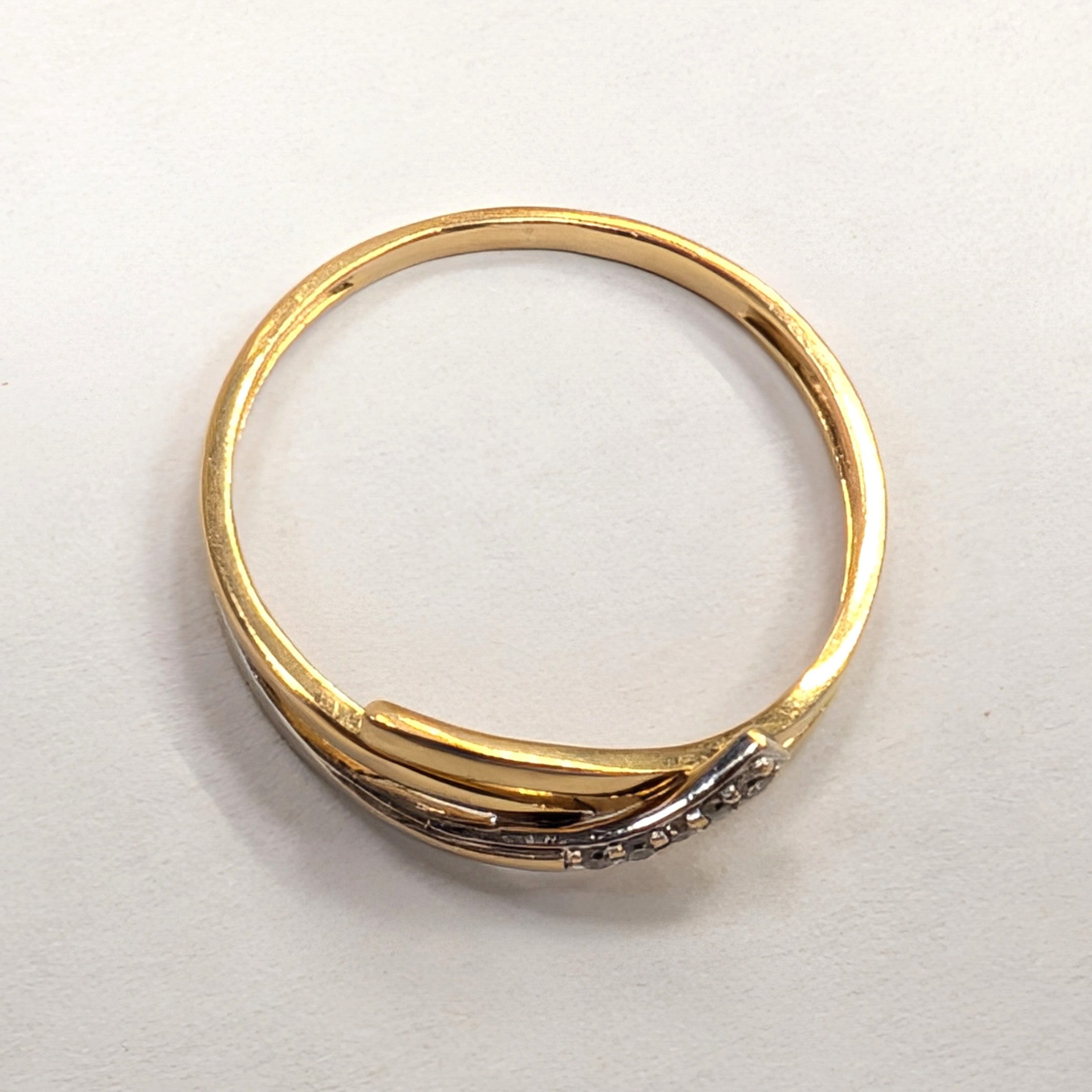 Alliance en or jaune 18 carats (750/1000), ornée de 4 diamants de 0,01 carat chacun. Le bijou porte le poinçon 750, pèse 1,29 gramme et correspond à une taille 55. Il est en très bon état.