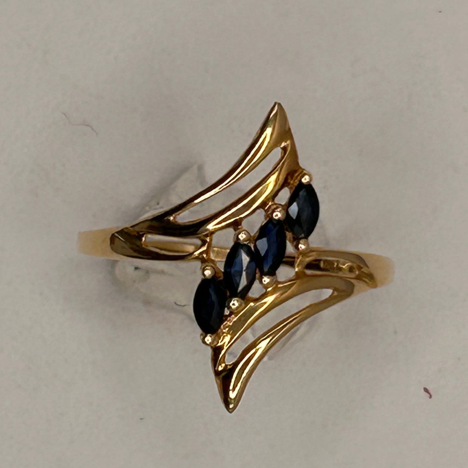Bague empierrée en or jaune 18 carats (750/1000) porte le poinçon tête d’aigle. Légère avec un poids de 1,57 gramme, elle est de taille 61. Elle est ornée de 4 saphirs taillés en navette et se présente en très bon état.