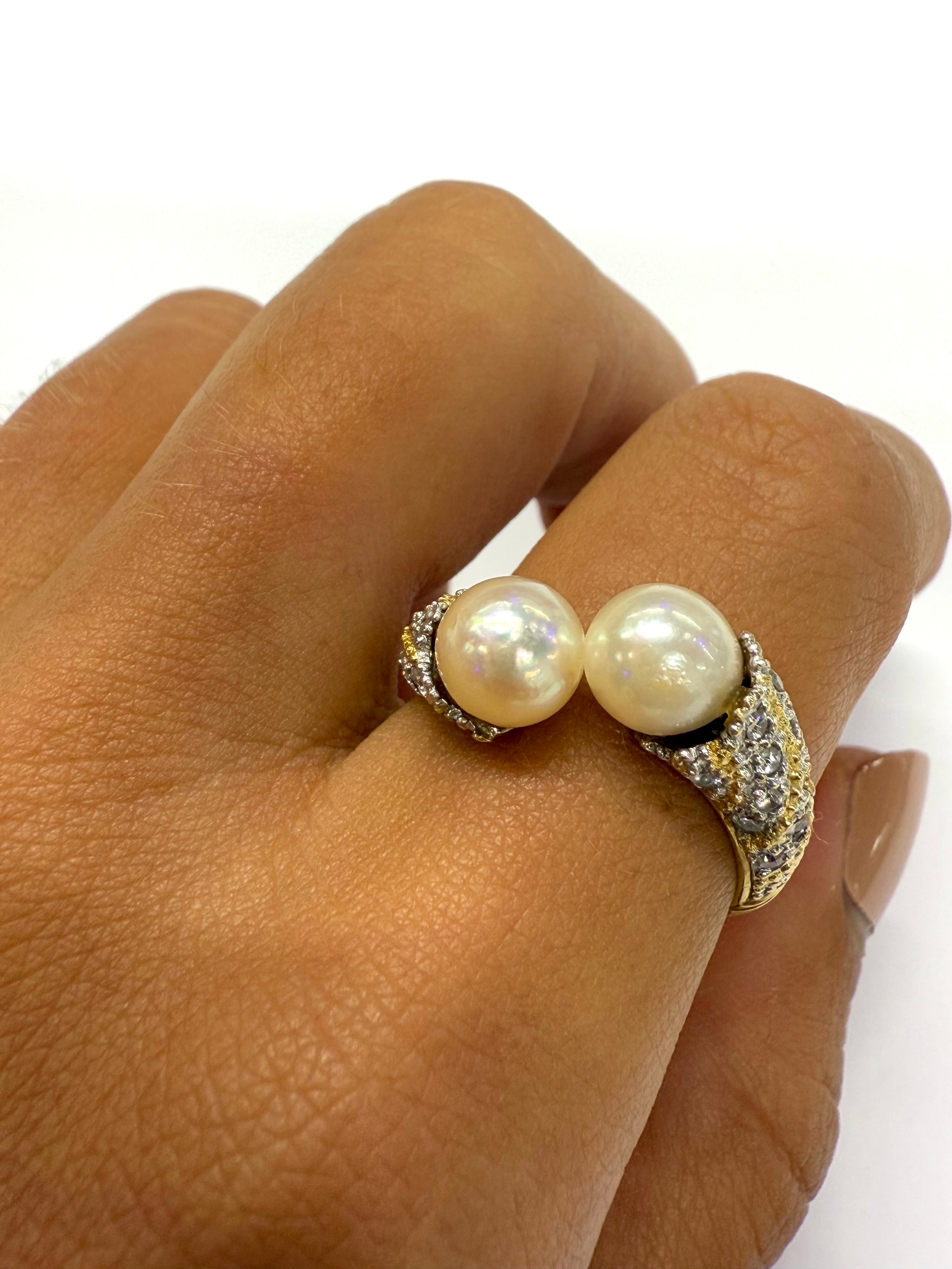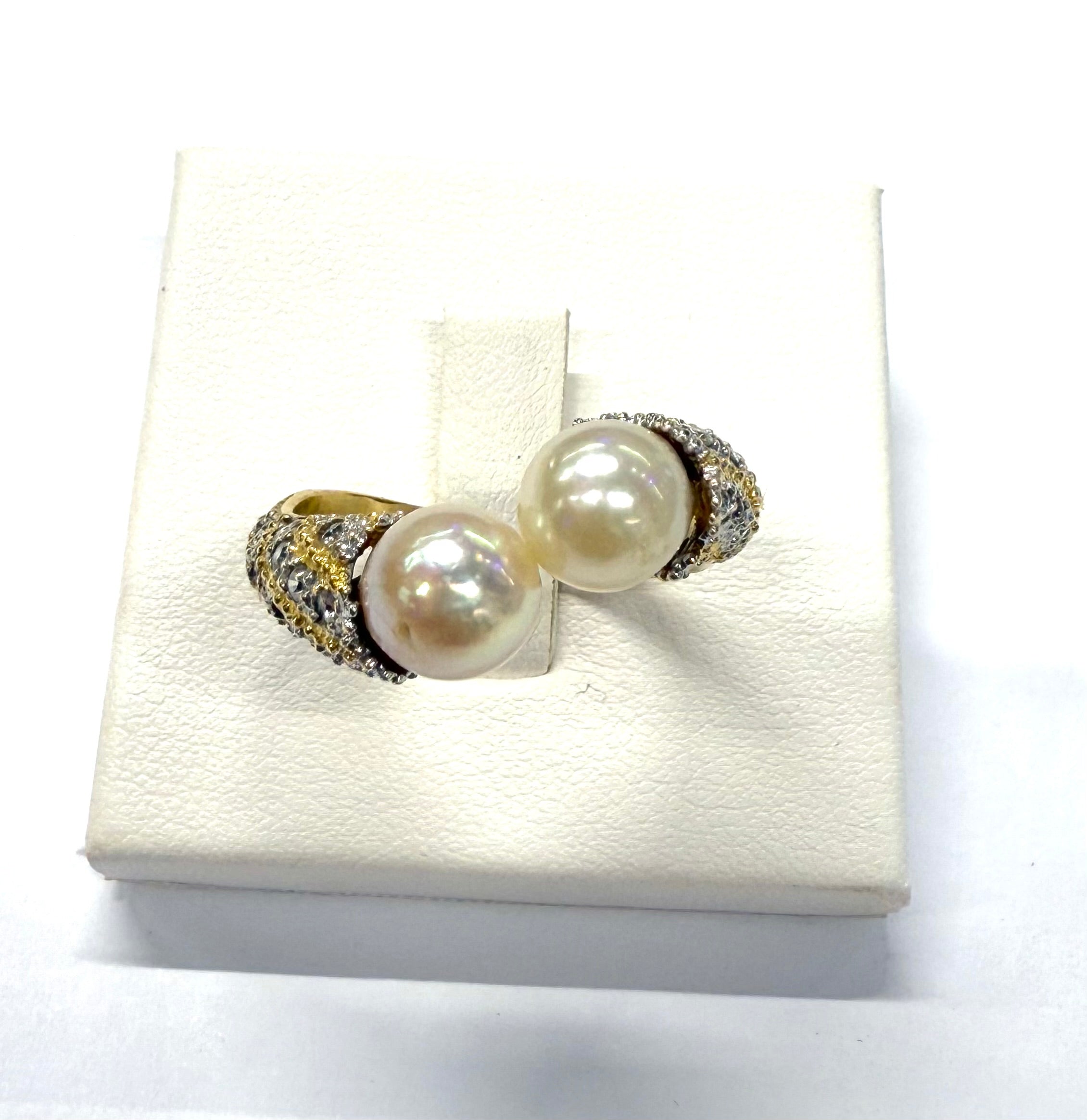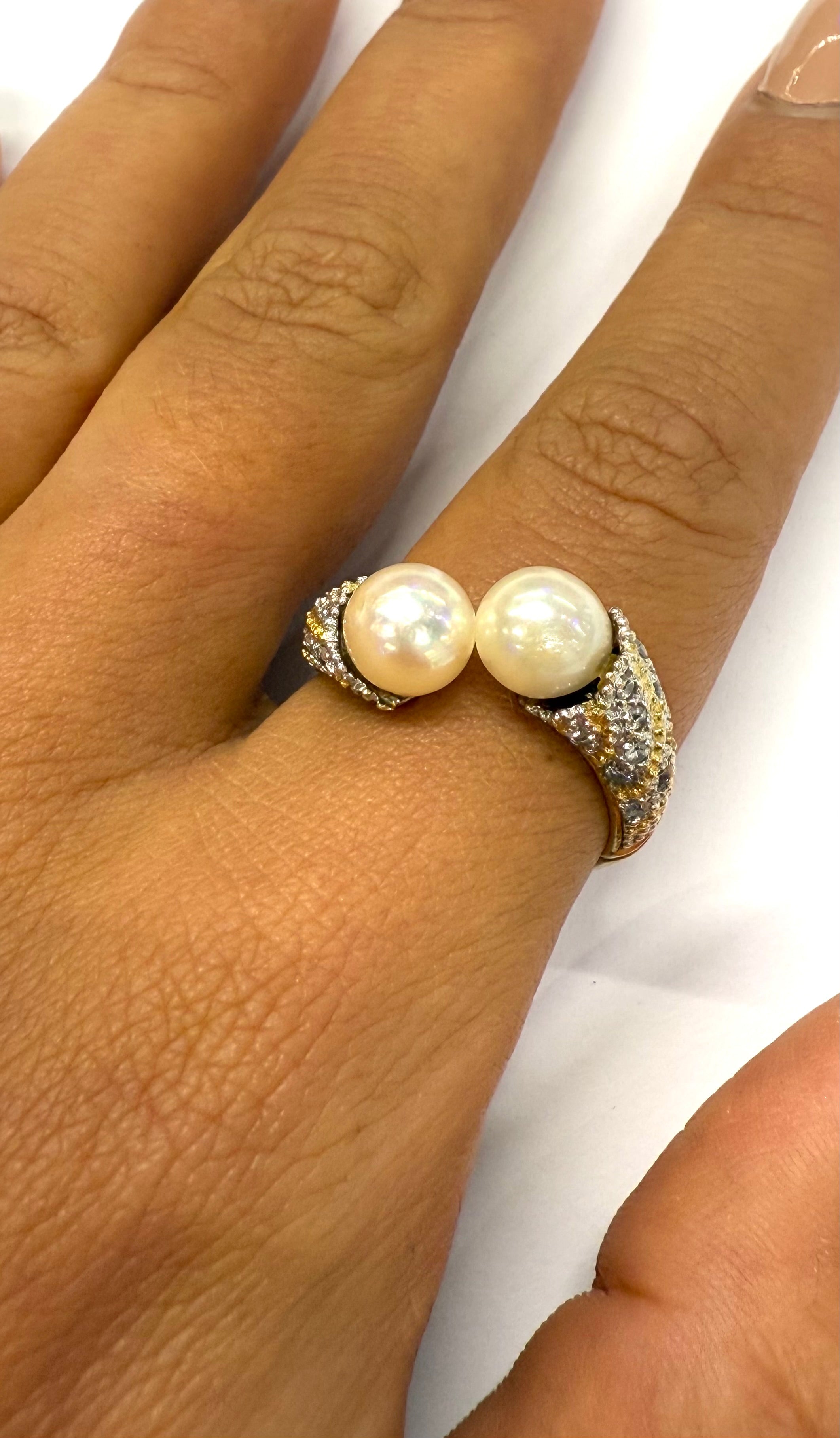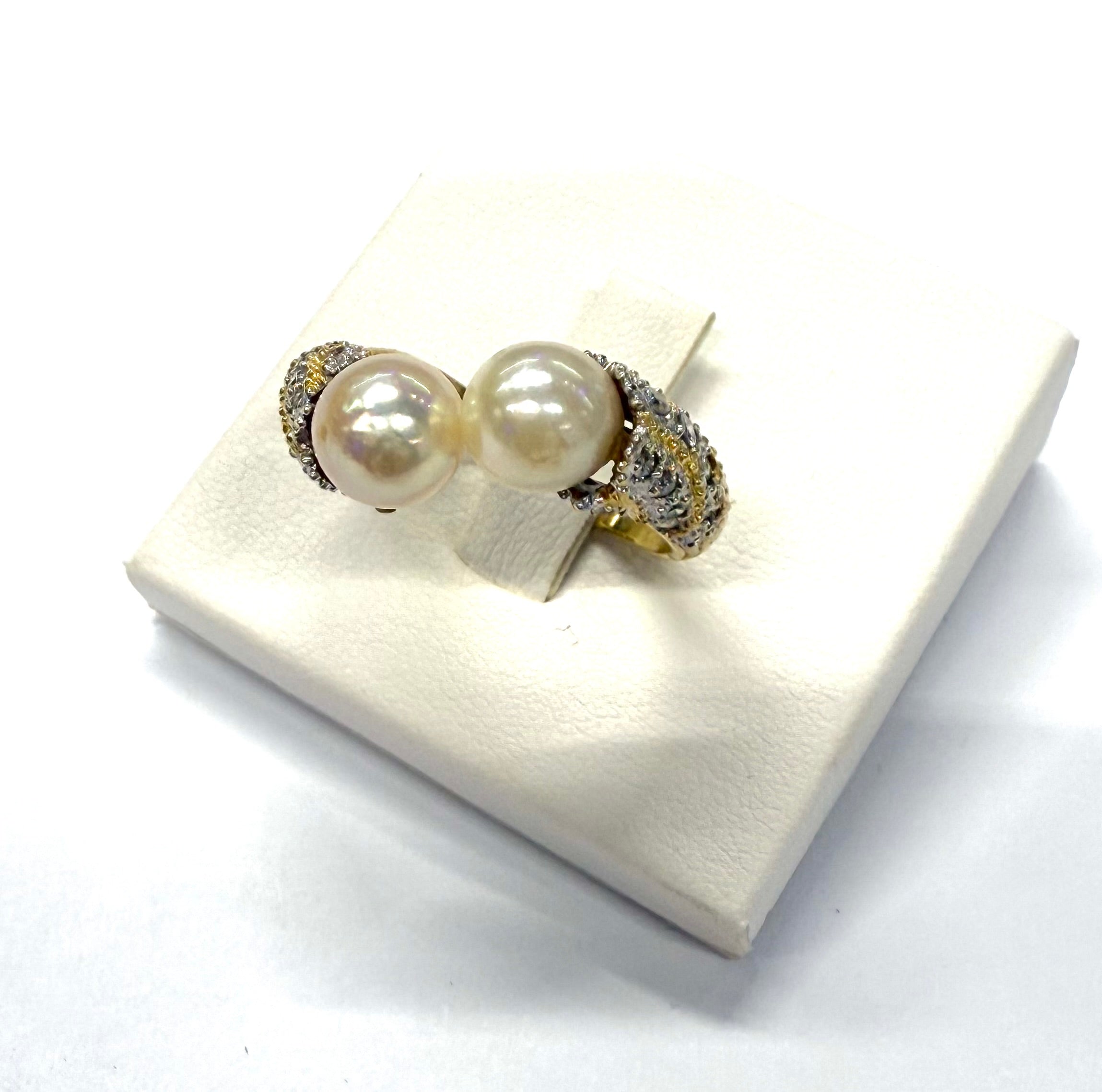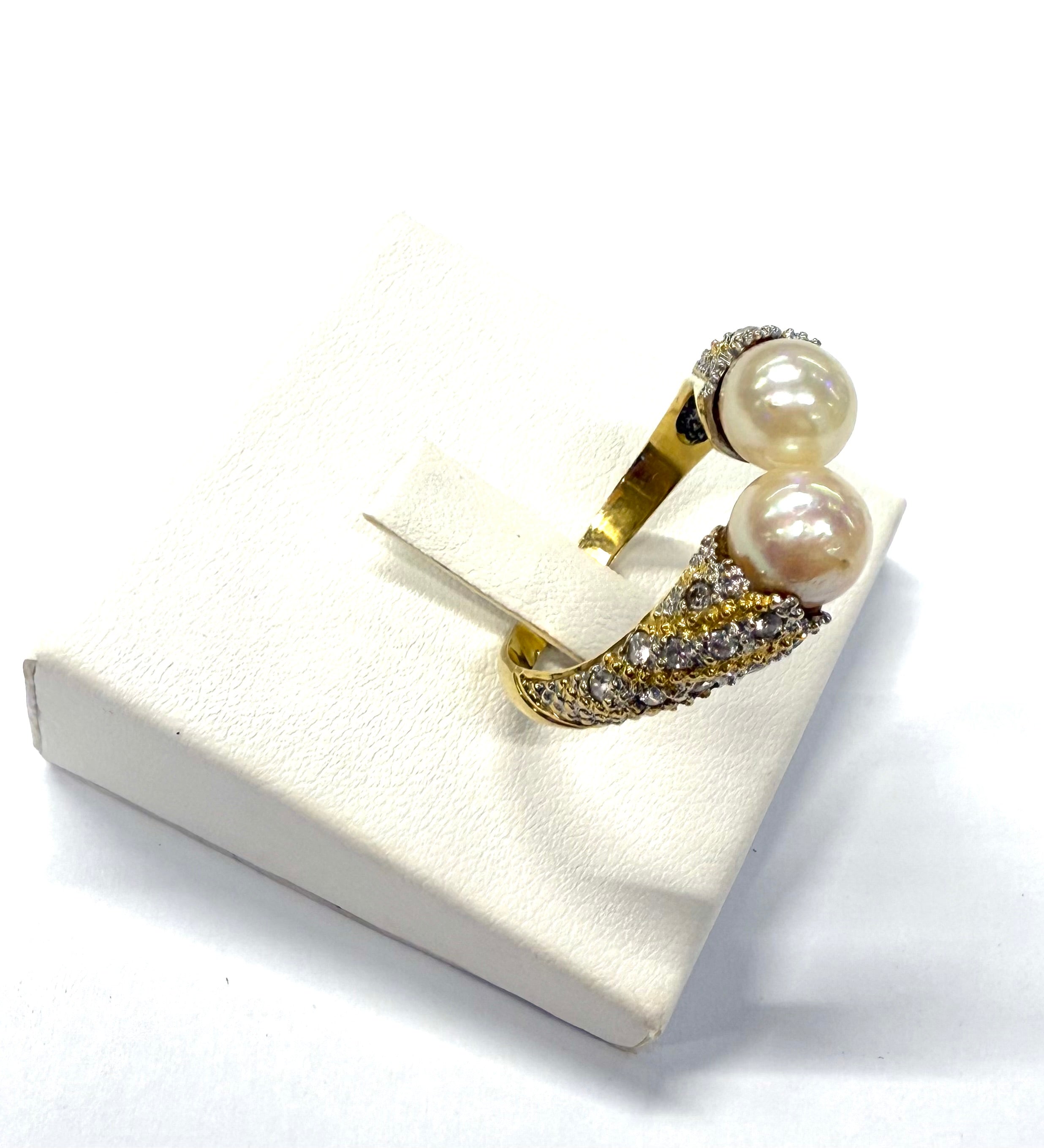 Bague en or jaune 18 carats (750/1000), poinçonnée 750, sertie de deux perles d’eau douce. D’un poids de 5,49 g et de taille 57, elle se distingue par son élégance sobre. Très bon état.
