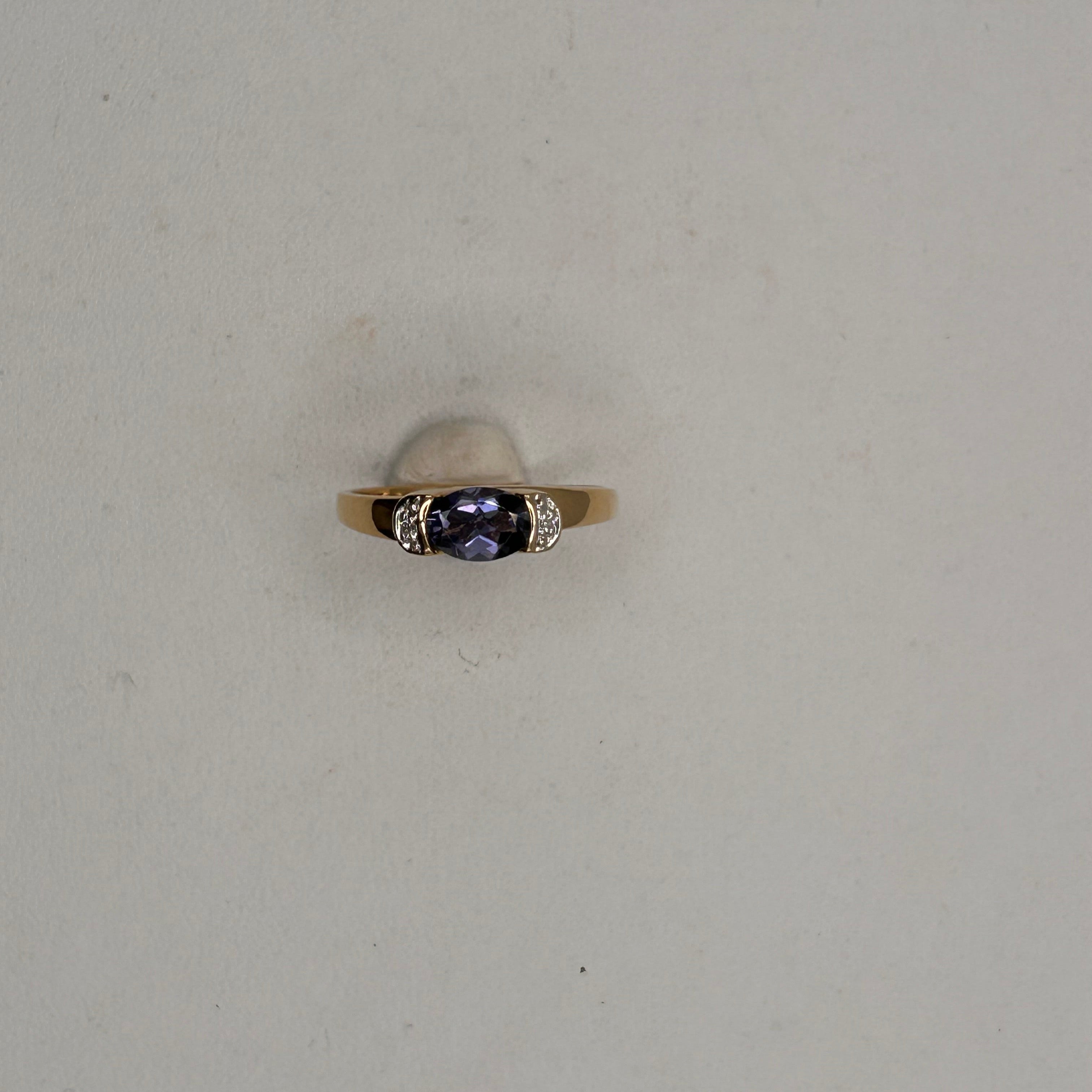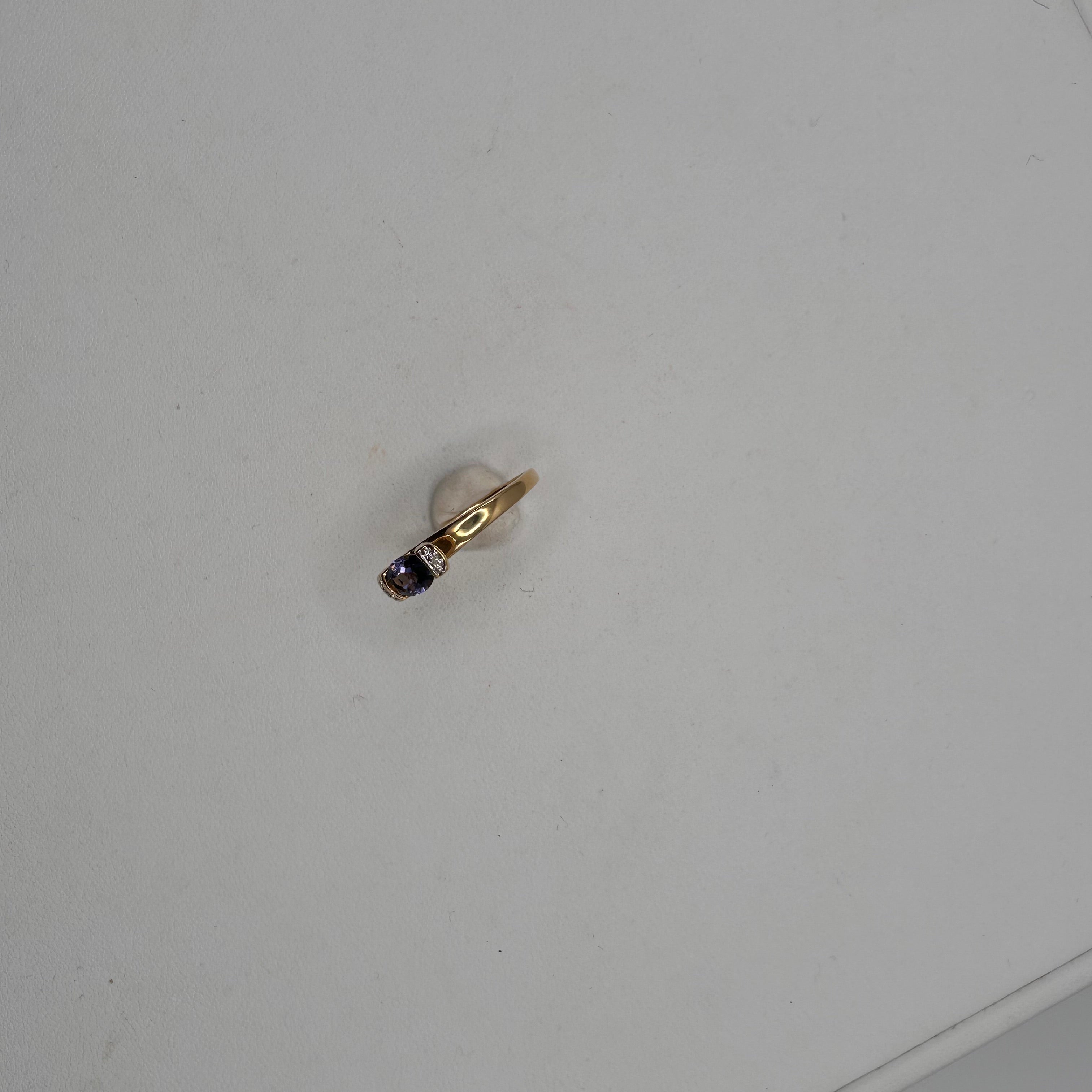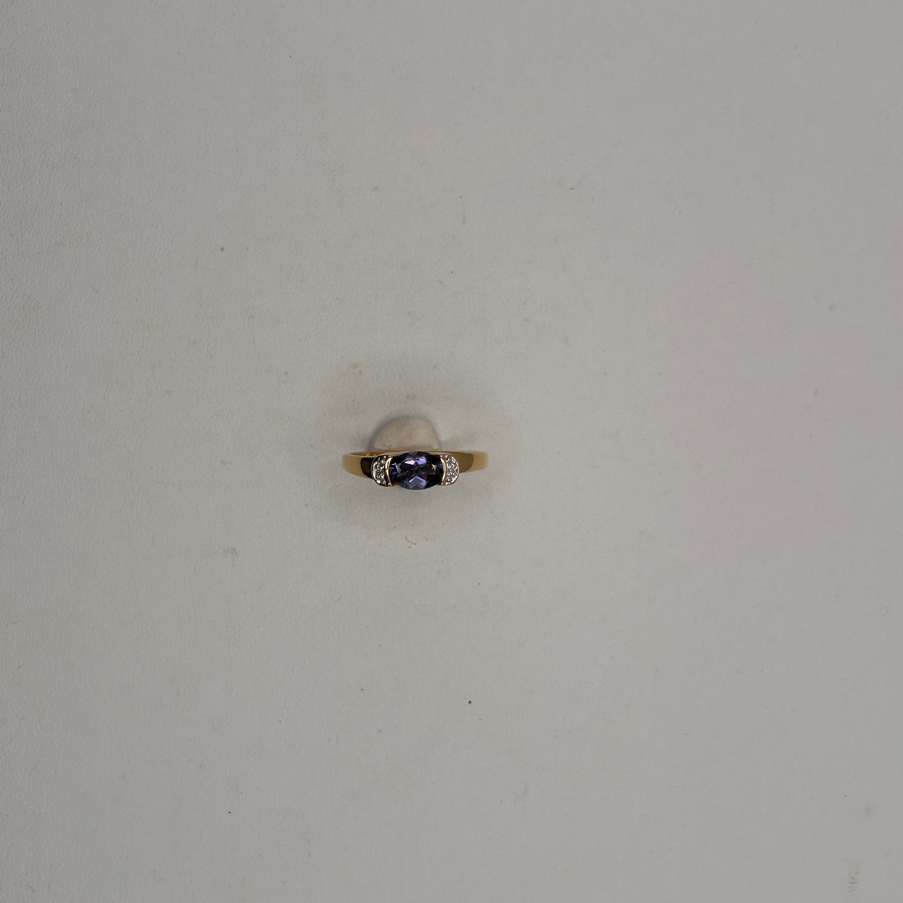 Bague empierrée est en or jaune 18 carats (750/1000) avec un poinçon tête d’aigle. Elle est sertie d’une pierre violette ovale (0,7 x 0,5 cm) d’origine non confirmée et de deux brillants, pour un poids de 2,83 grammes et une taille 55. Elle est en état comme neuf.