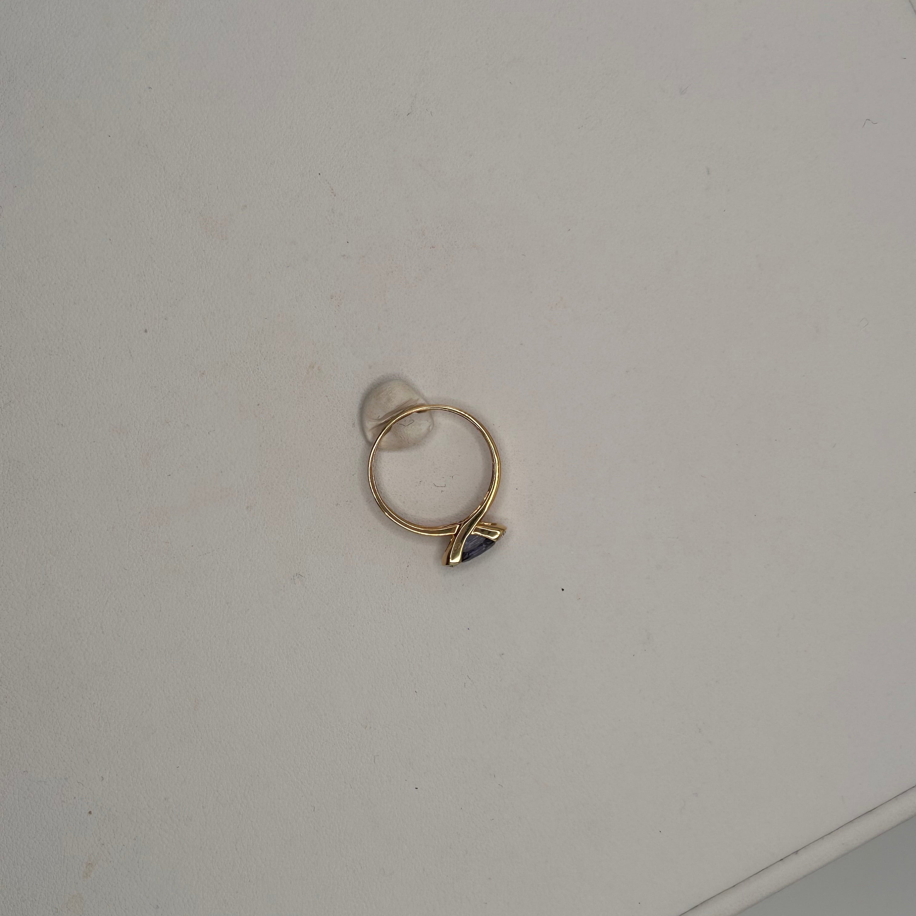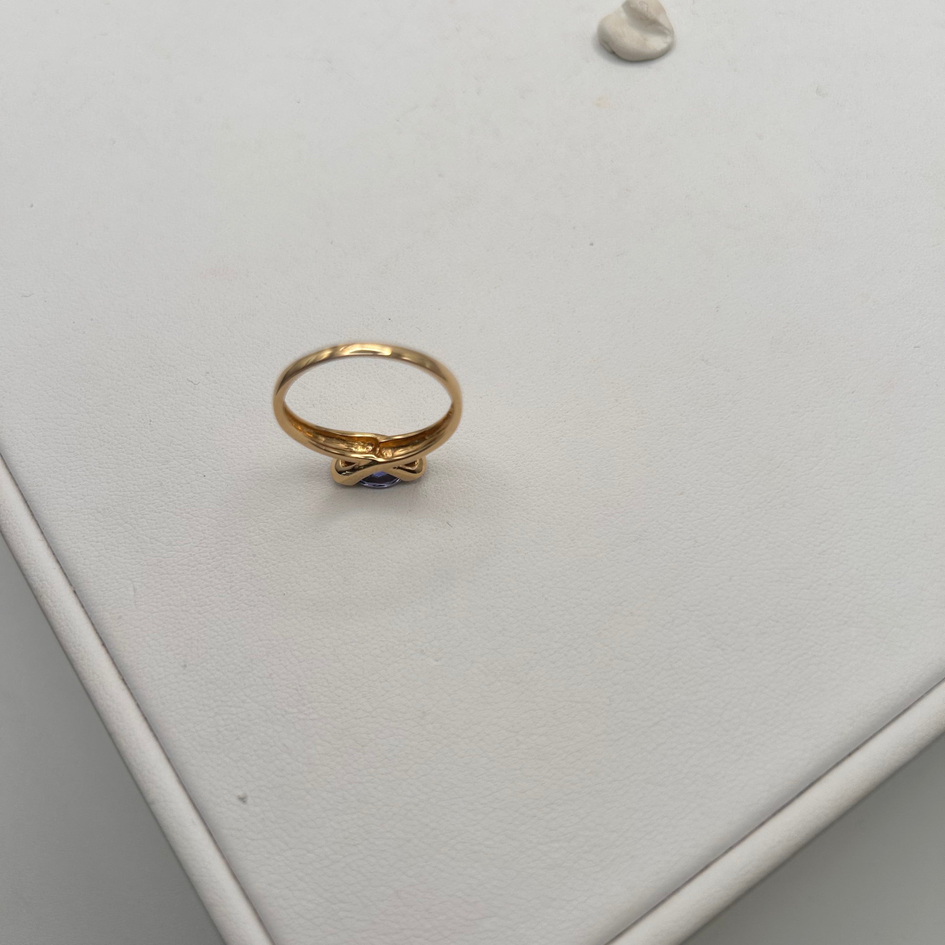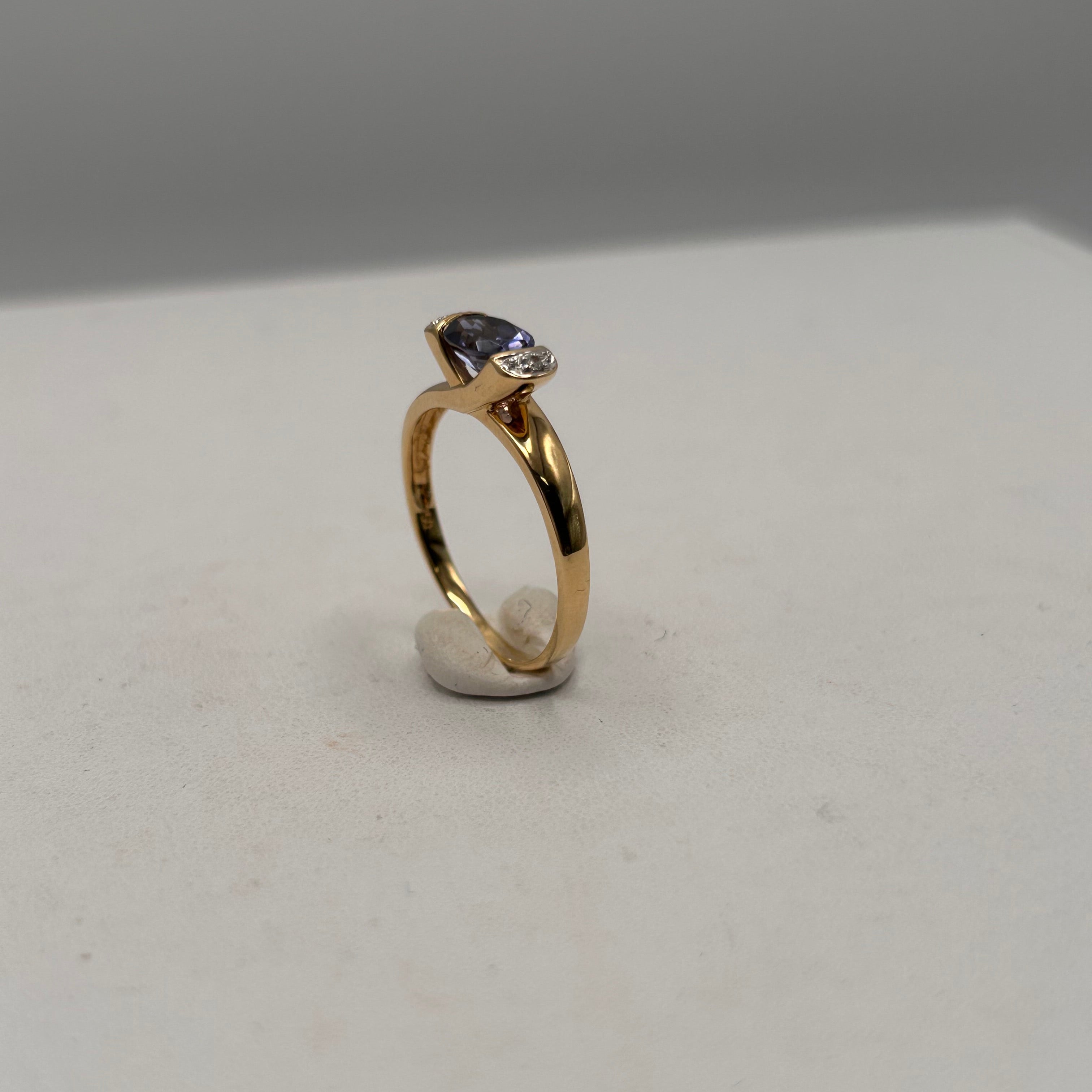 Bague empierrée est en or jaune 18 carats (750/1000) avec un poinçon tête d’aigle. Elle est sertie d’une pierre violette ovale (0,7 x 0,5 cm) d’origine non confirmée et de deux brillants, pour un poids de 2,83 grammes et une taille 55. Elle est en état comme neuf.