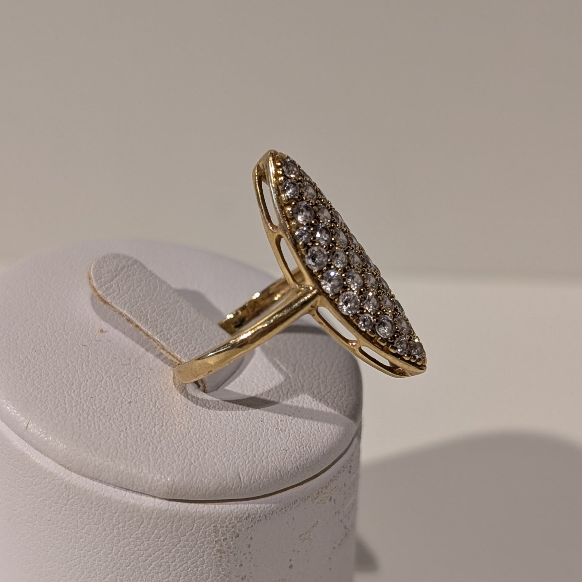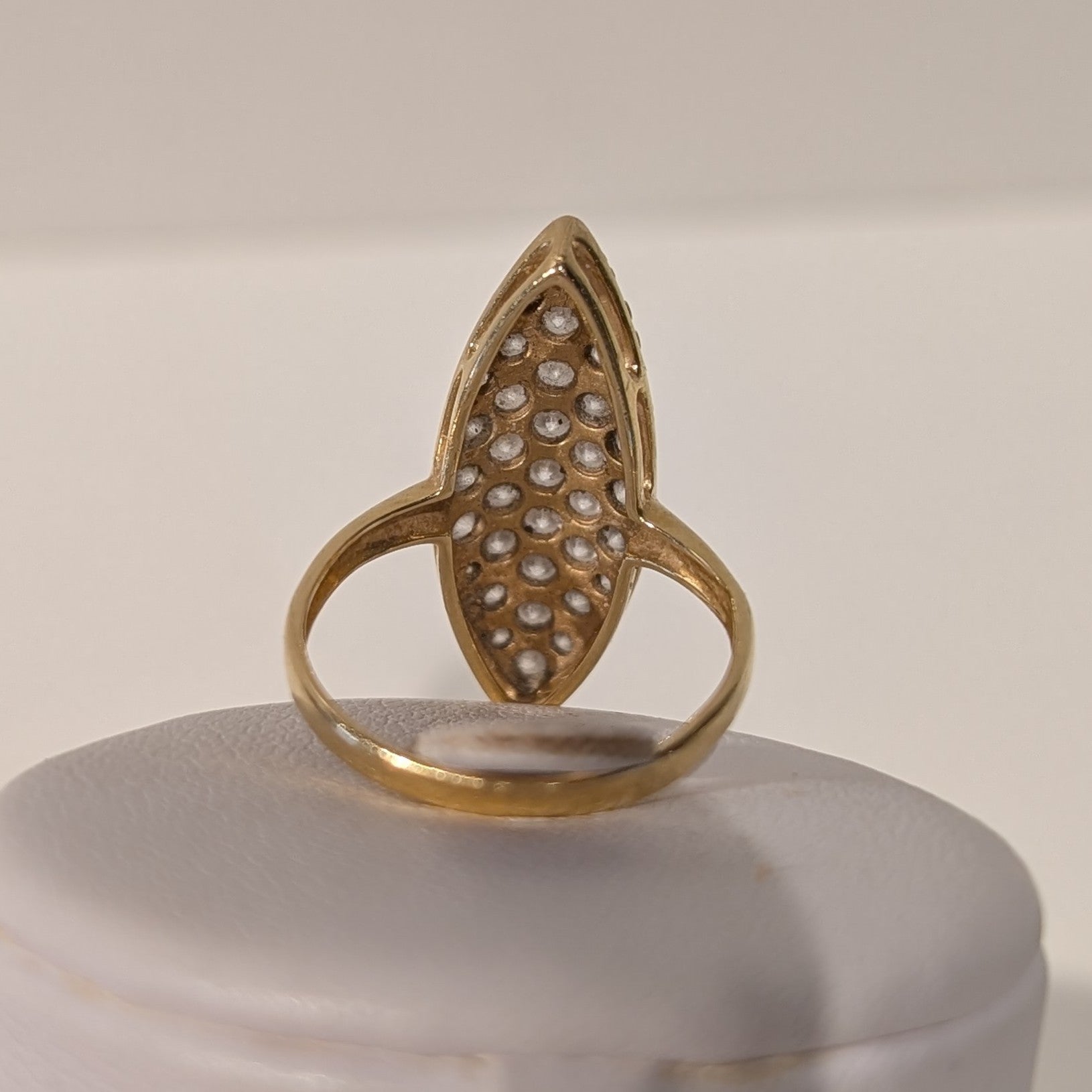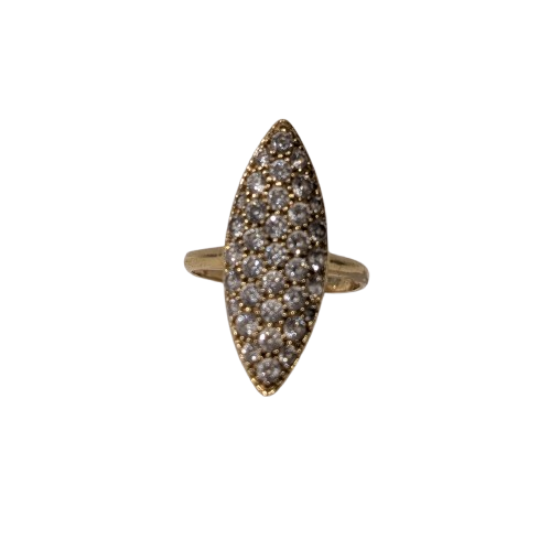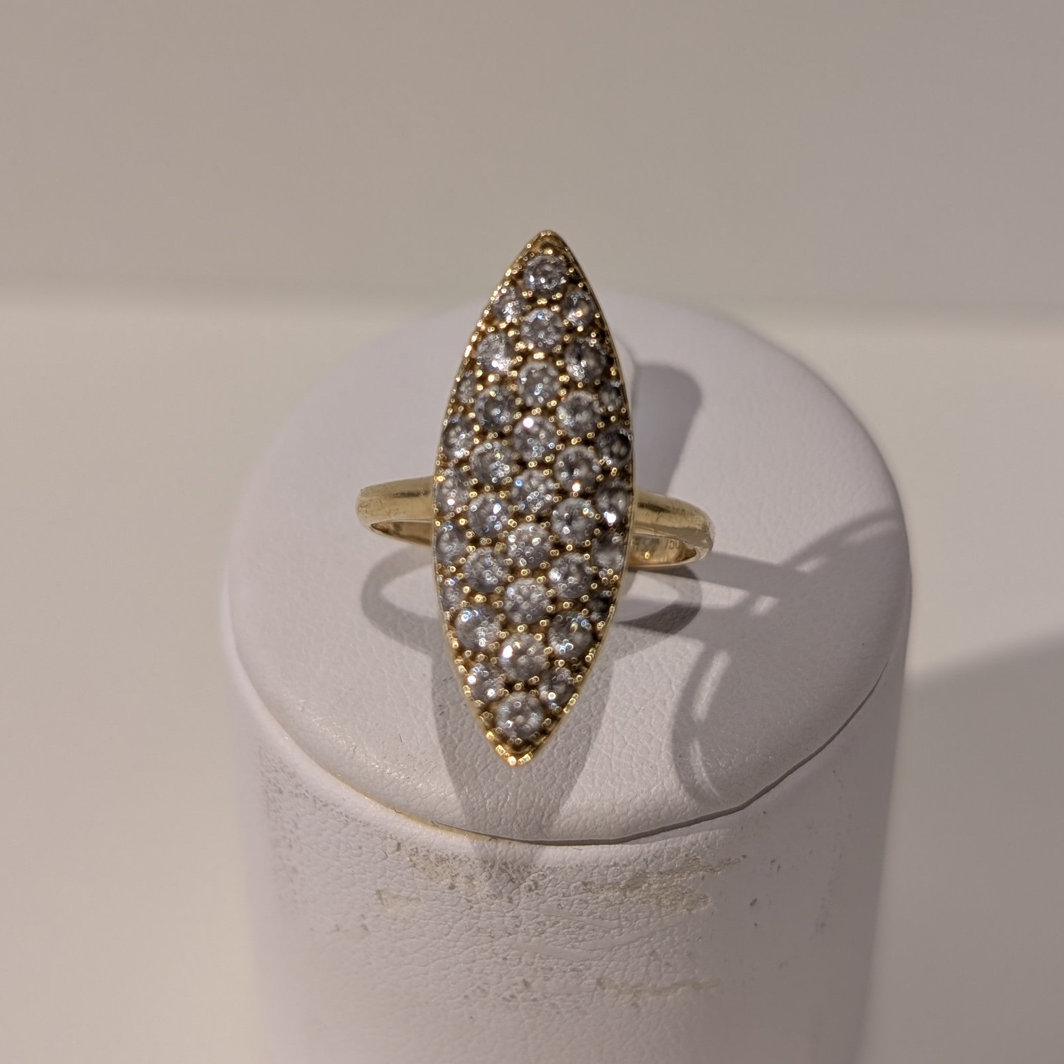 Bague de type marquise en or jaune 18 carats (750/1000), poinçonnée "750", d’un poids de 4,25 grammes. De taille 54, elle est sertie de 32 pierres artificielles transparentes qui apportent éclat et raffinement. La bague est en bon état général.