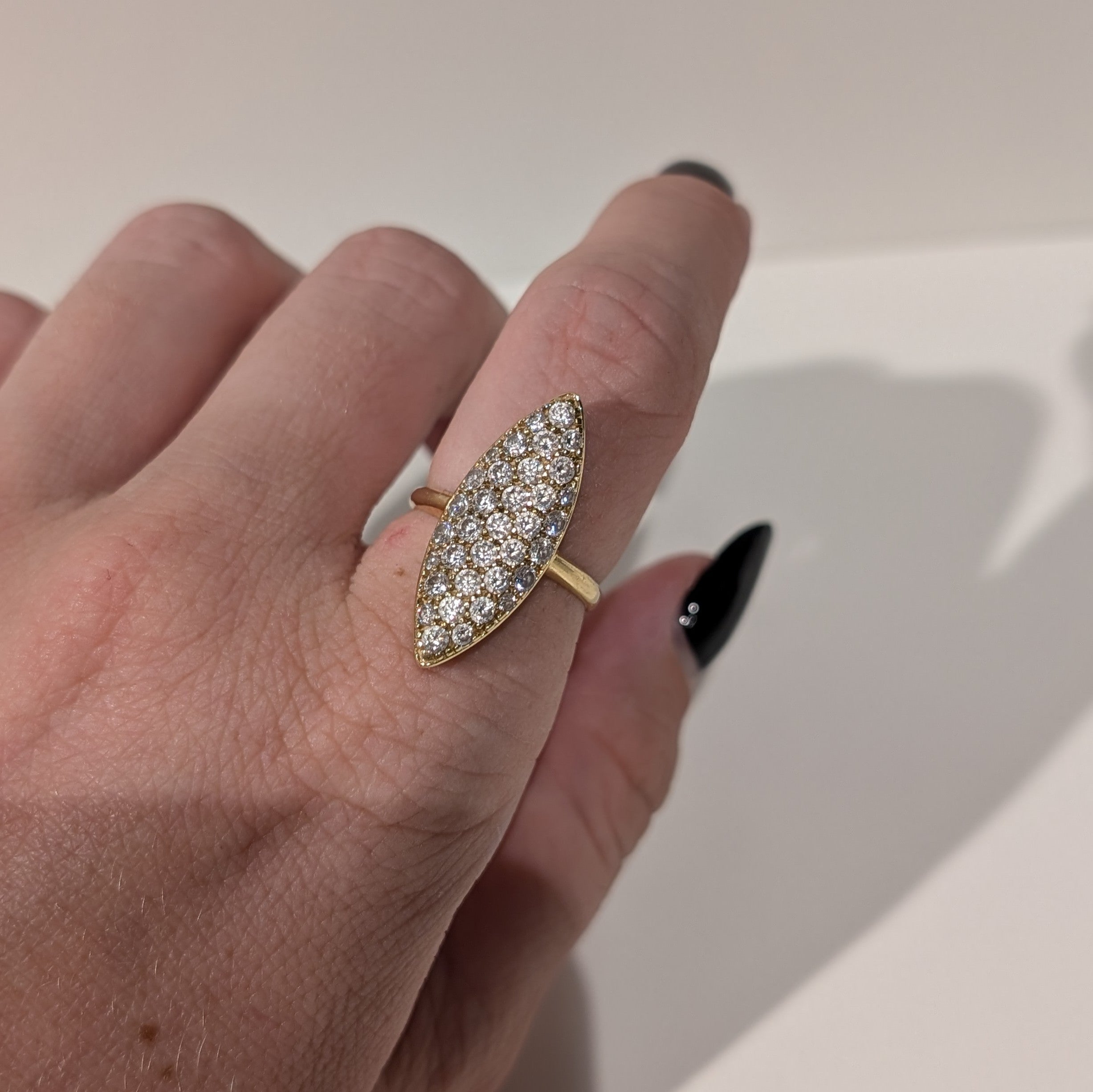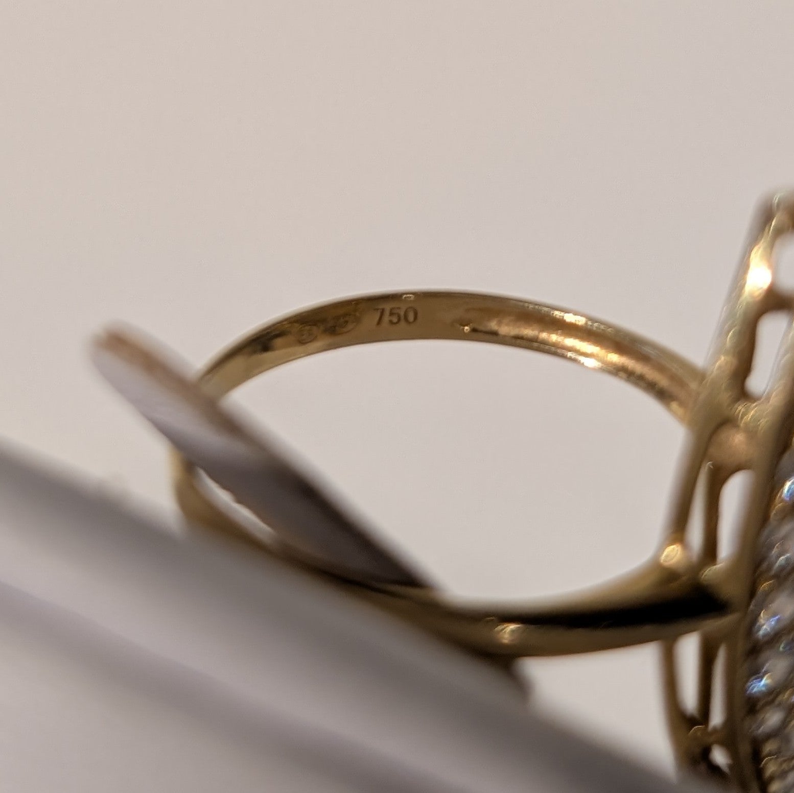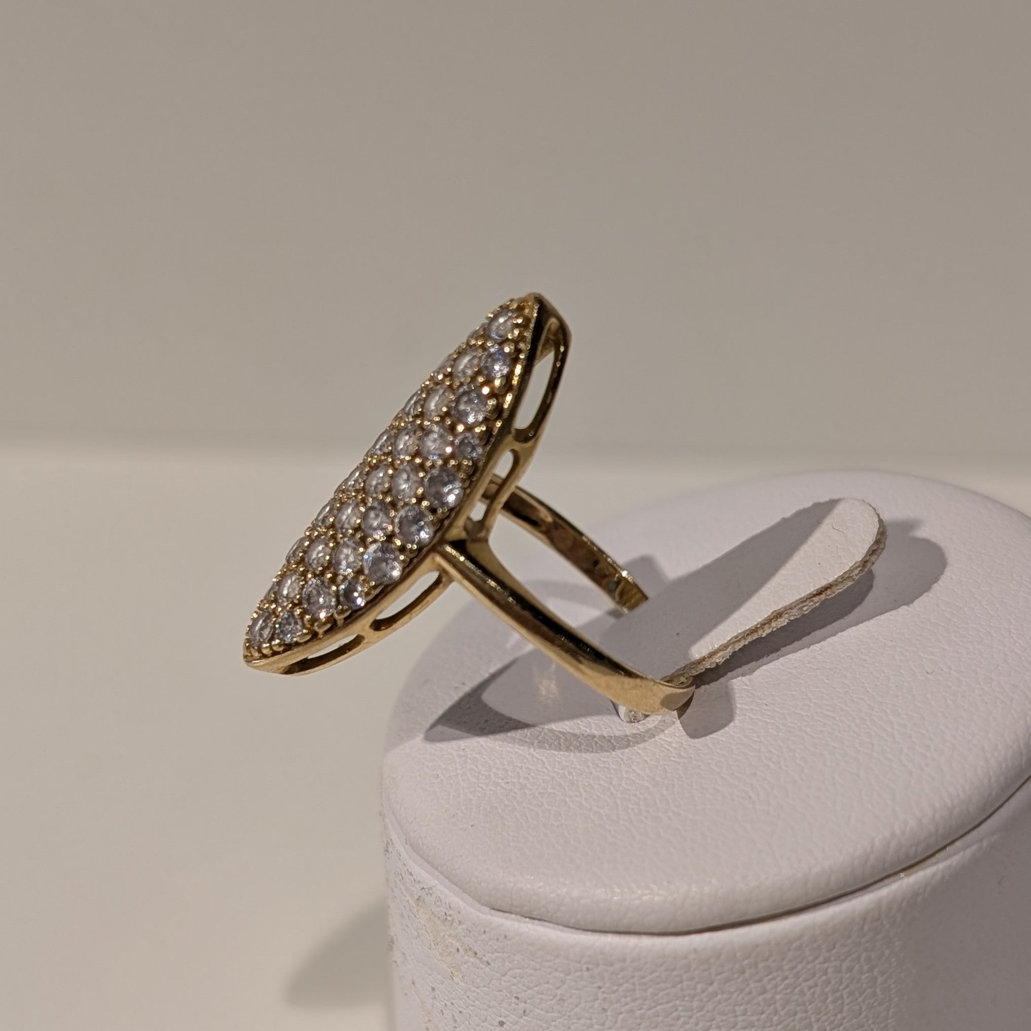 Bague de type marquise en or jaune 18 carats (750/1000), poinçonnée "750", d’un poids de 4,25 grammes. De taille 54, elle est sertie de 32 pierres artificielles transparentes qui apportent éclat et raffinement. La bague est en bon état général.