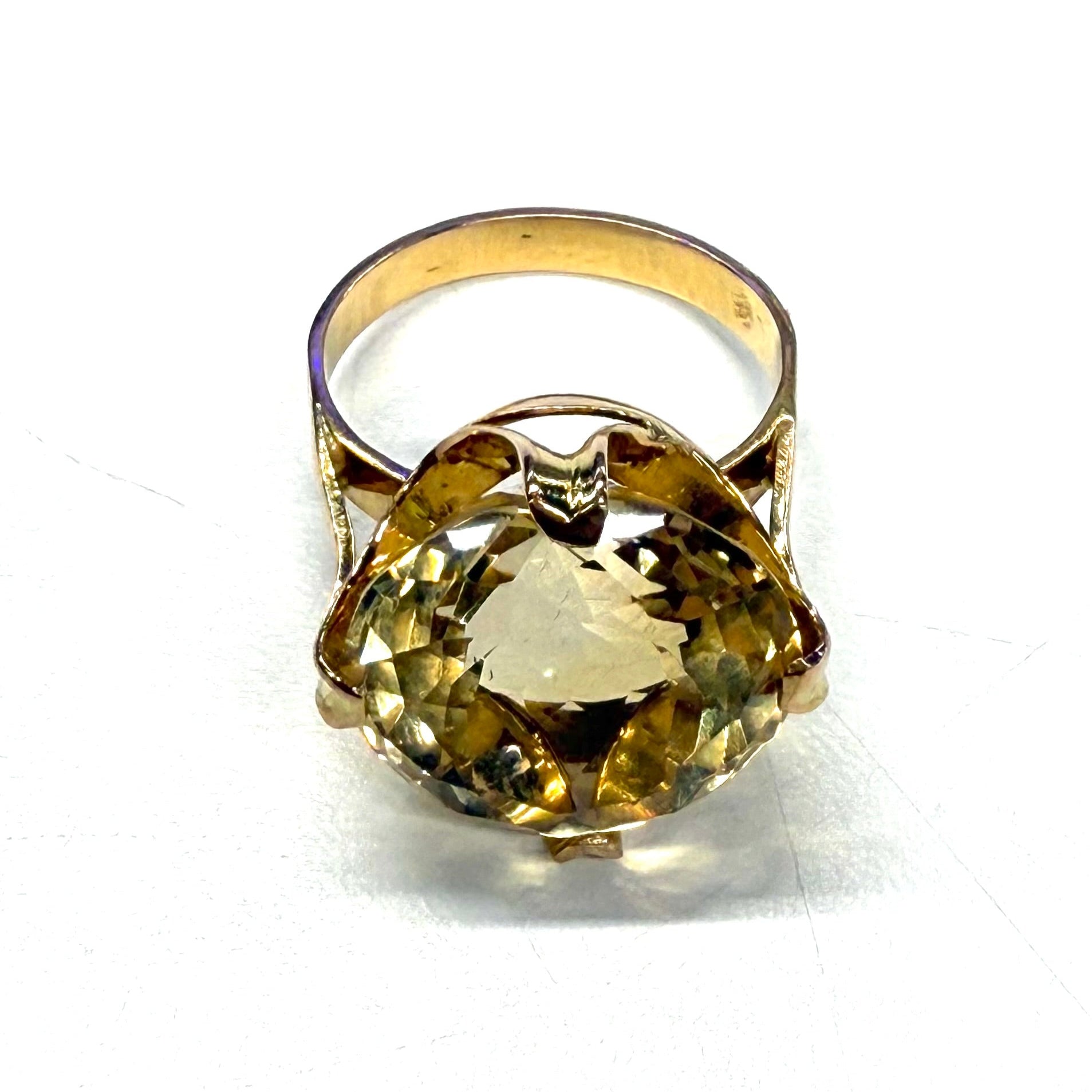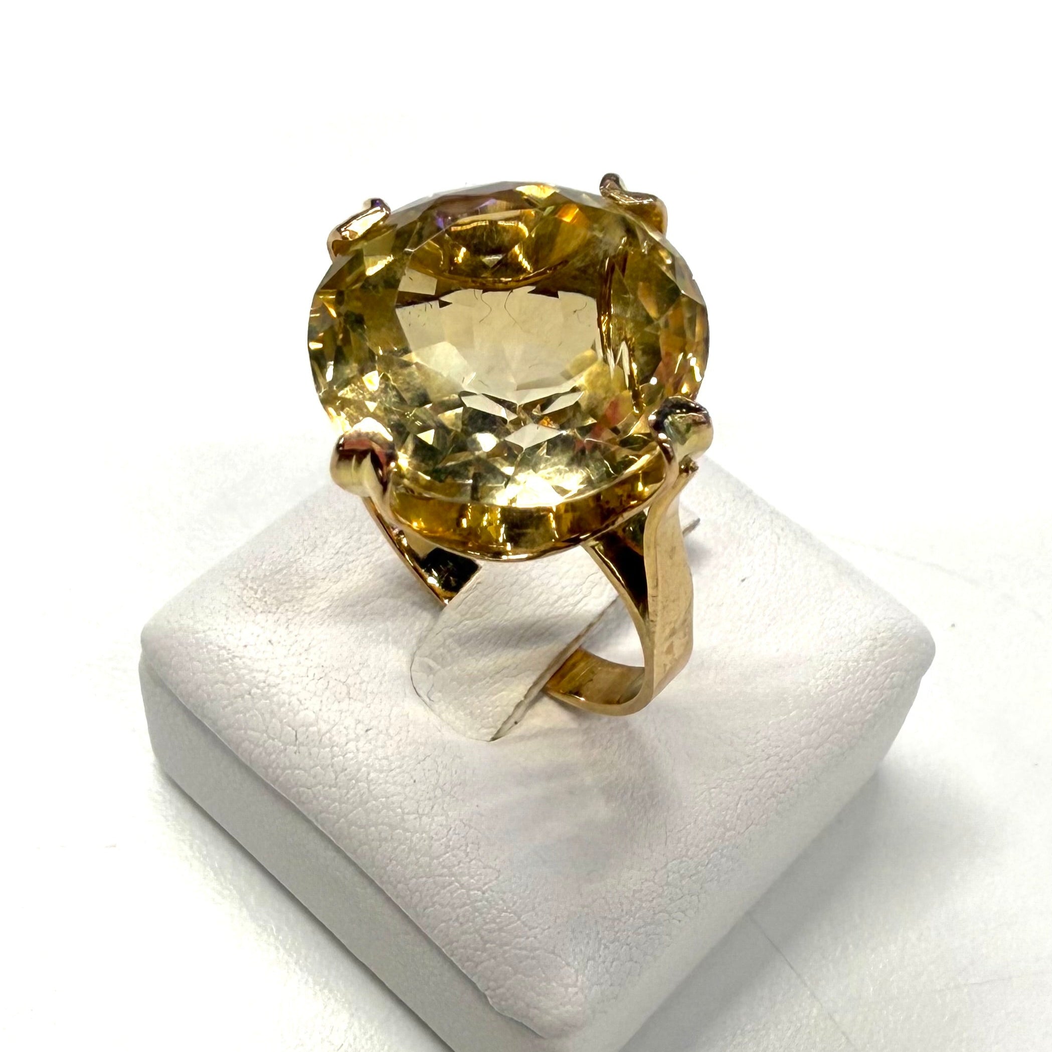 Bague empierrée en or jaune 18 carats (750/1000), poinçonnée Tête d’Aigle, d’un poids de 6,74 grammes et proposée en taille 54. Elle est sertie d’une citrine de 1,6 cm de diamètre, apportant une touche de couleur chaleureuse et lumineuse à l’ensemble.
