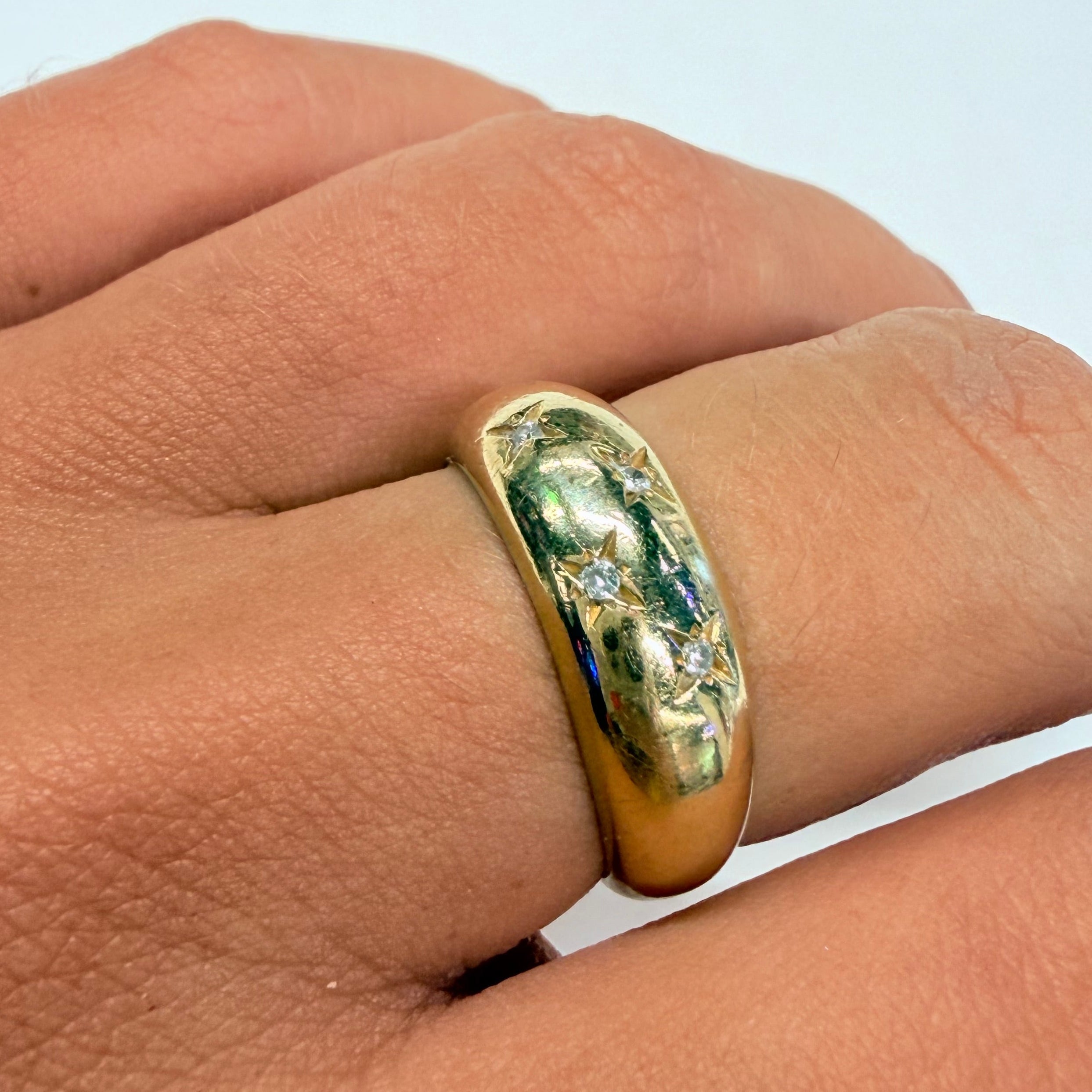 Bague empierrée en or jaune 750/1000 (poinçon Tête d’Aigle), poids 4,01 g, taille 53, ornée de 4 éclats de diamants, très bon état.