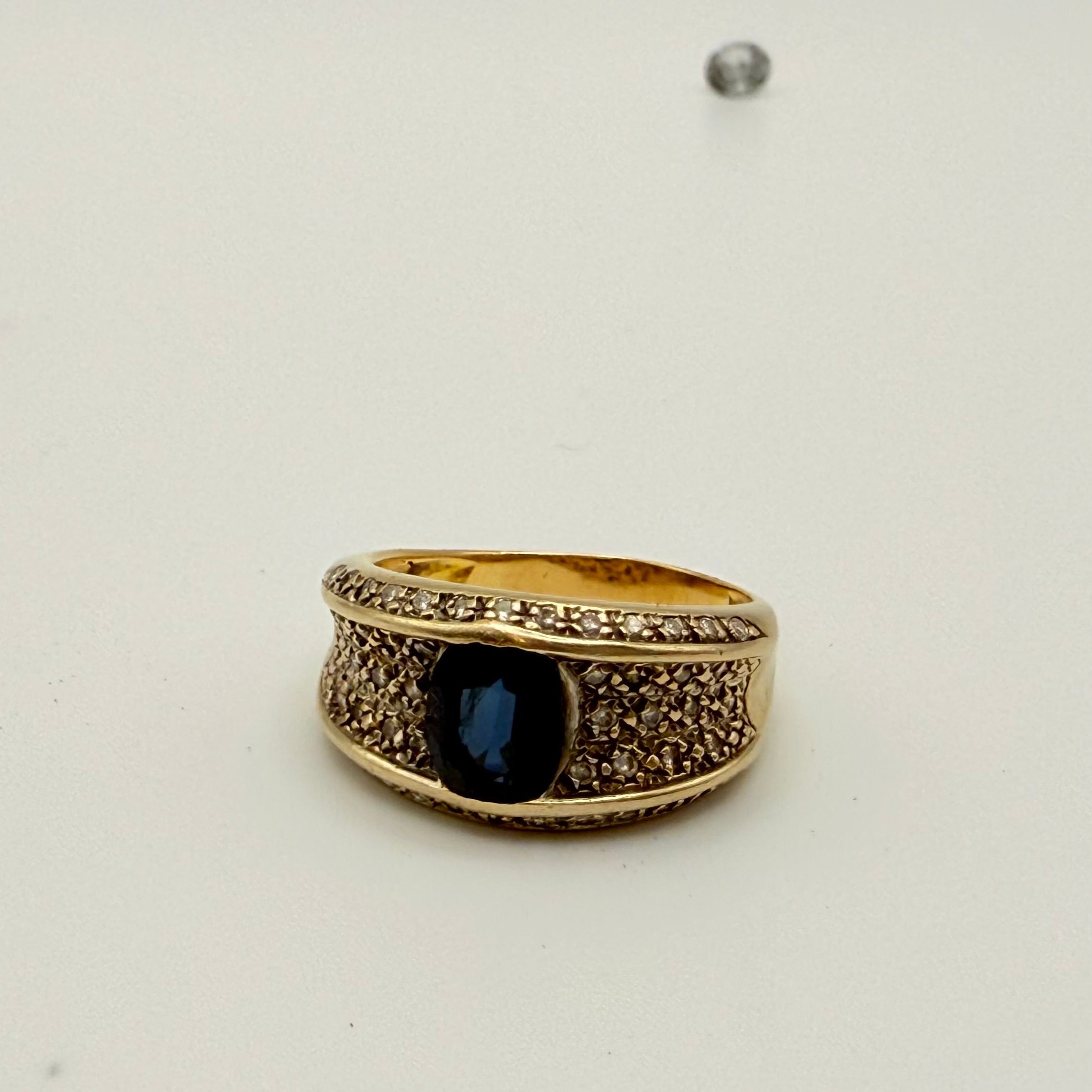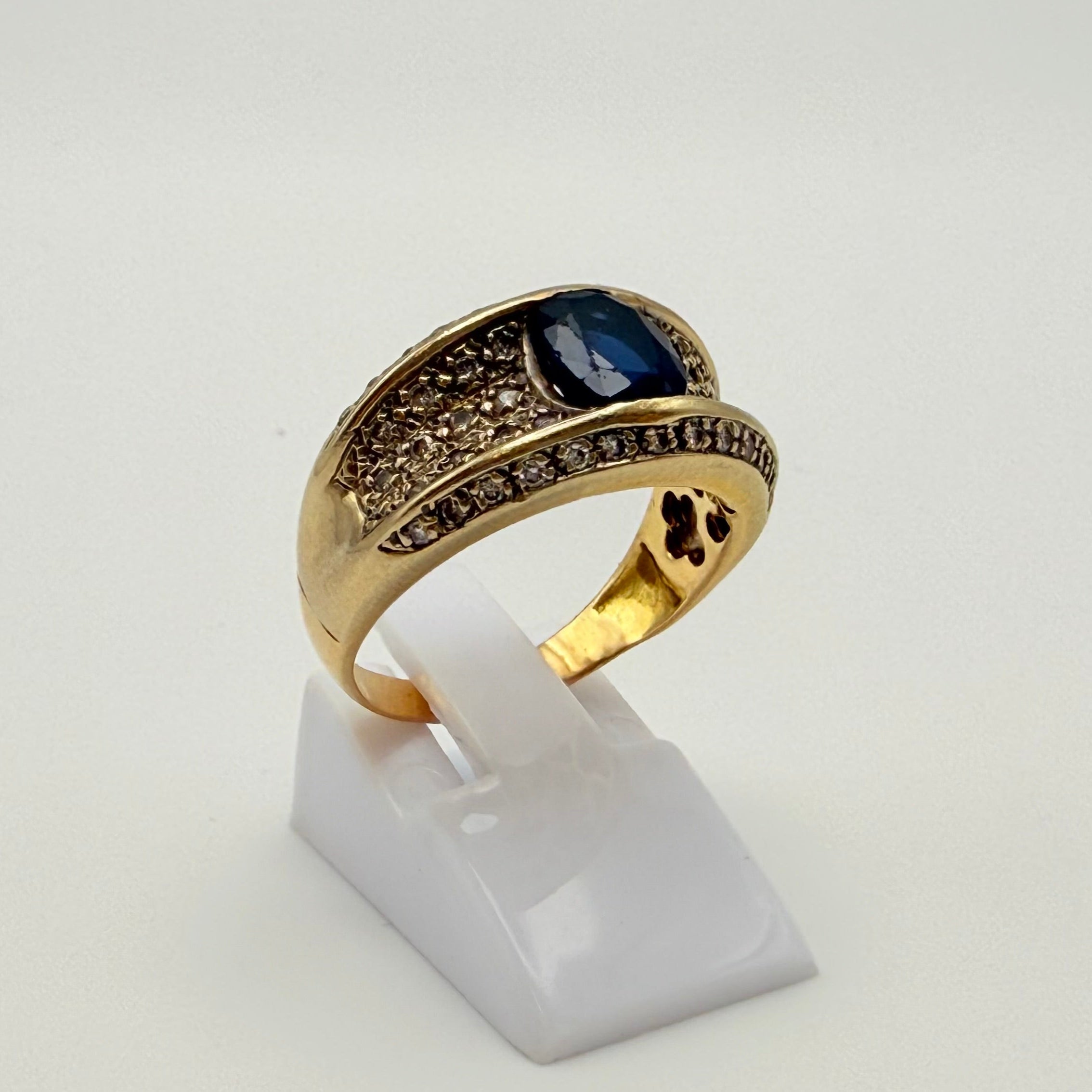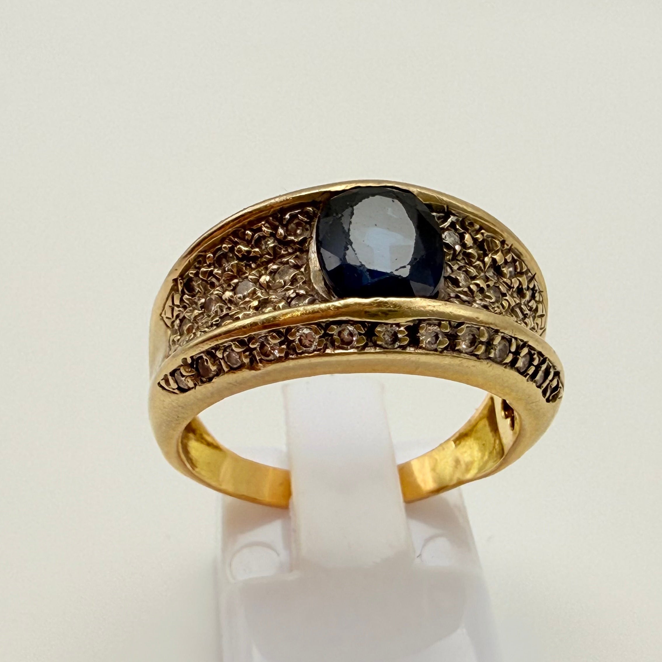 Bague empierrée en or jaune 18 carats (750/1000), poinçonnée 750. Elle est ornée d’un saphir central, mise en valeur par un design classique et élégant. Taille 58, poids 8 g. En bon état, parfaite pour une touche de caractère.