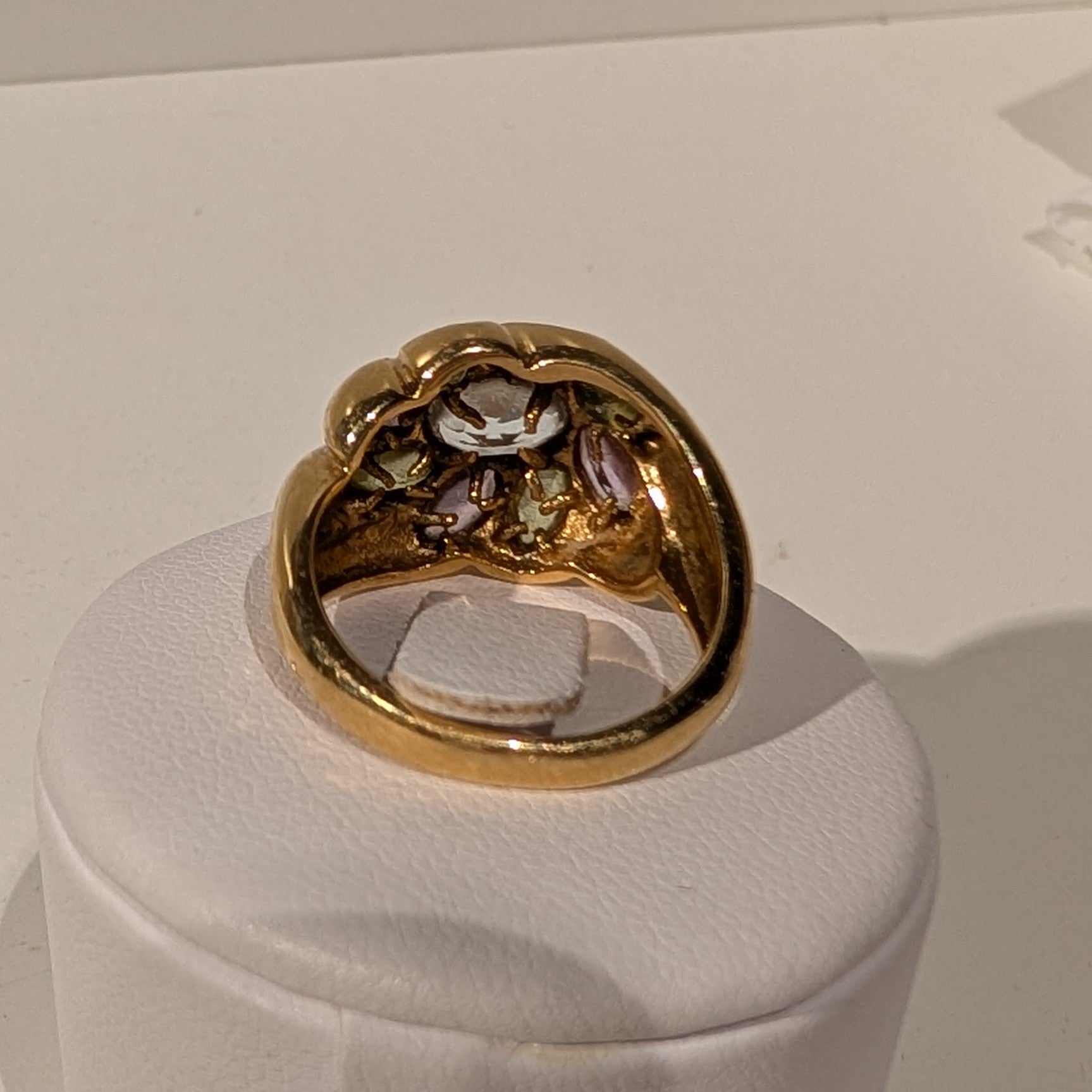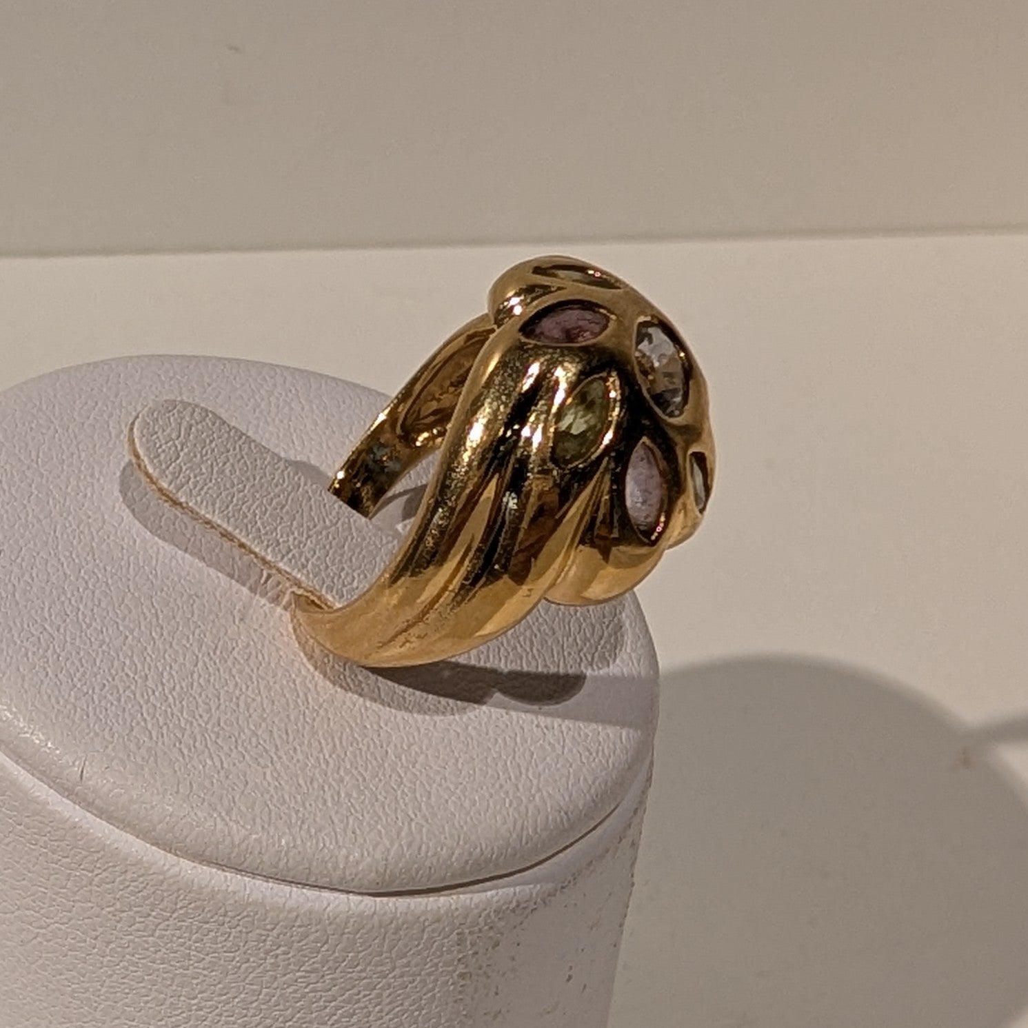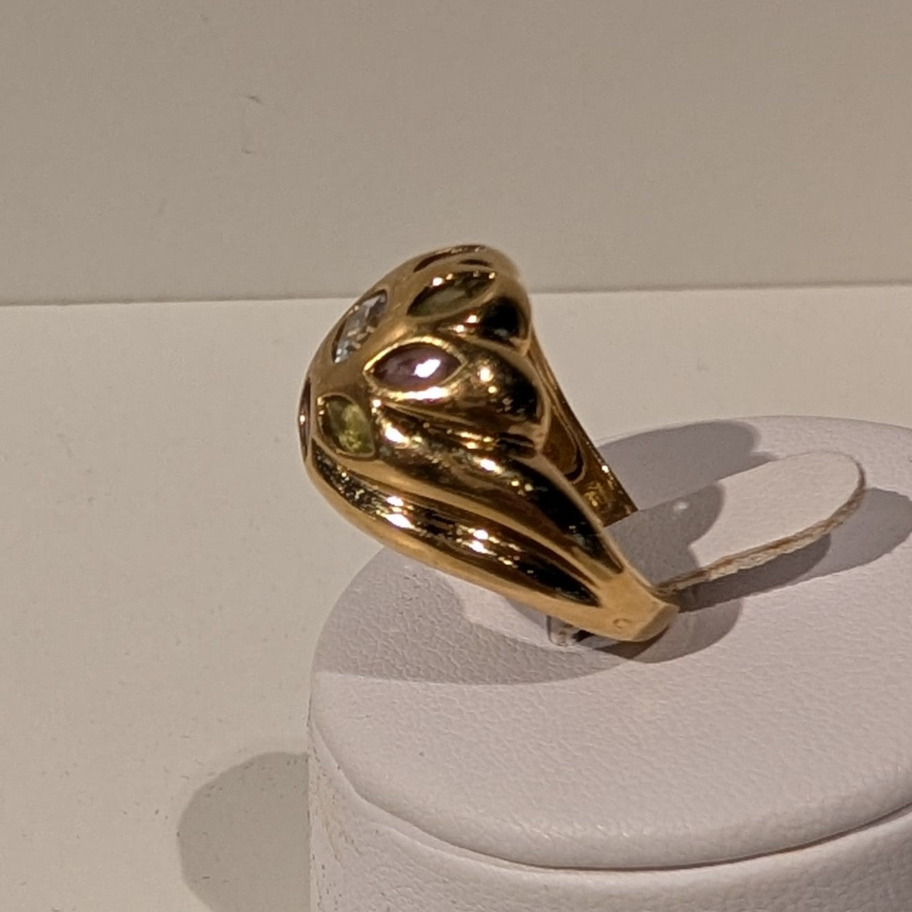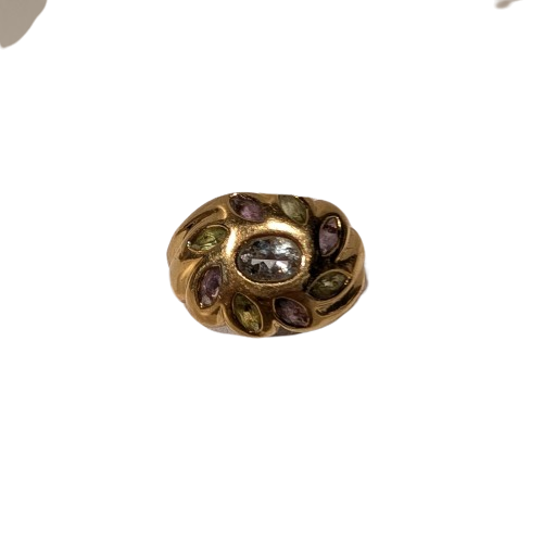 Bague de type tank est réalisée en or jaune 18 carats (titrage 750/1000), sans poinçon. Elle pèse 8,90 grammes et correspond à une taille 54. Ornée de 9 oxydes de zirconium, elle présente un design imposant et structuré, typique du style tank. La bague est en bon état.