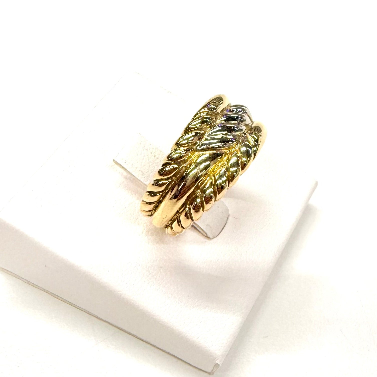 Élégante et raffinée, cette bague en or jaune et or blanc 18 carats séduit par son design travaillé et sophistiqué. Avec un poids de 9,57 g et en très bon état, elle constitue un bijou intemporel, parfait pour un port quotidien ou pour compléter une collection de bijoux précieux.